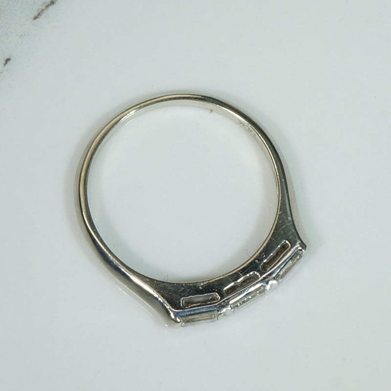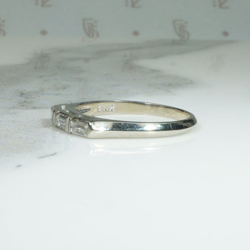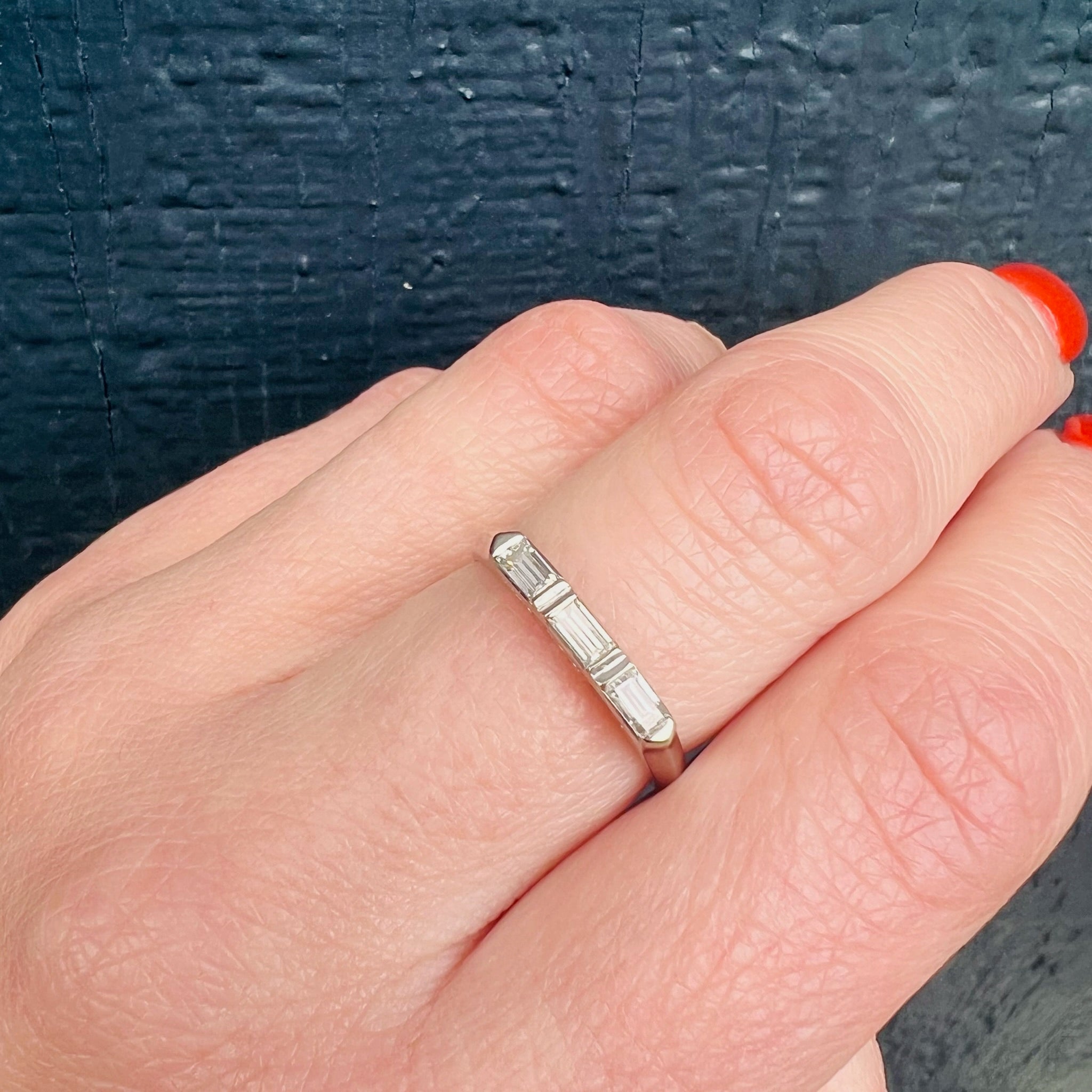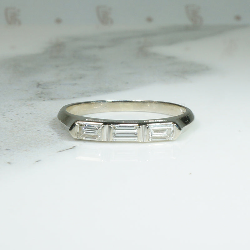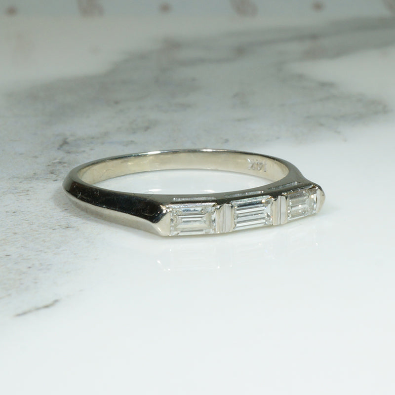 Classic Mid Century elegance. A trio of straight cut baguette diamonds sparkle prettily in a bar set 14k white gold band. The band has the added detail of a tapered knife edge band. Perfect match for your baguette side engagement ring. Clean, modern lines, diamond weight .25ct, Circa 1940.