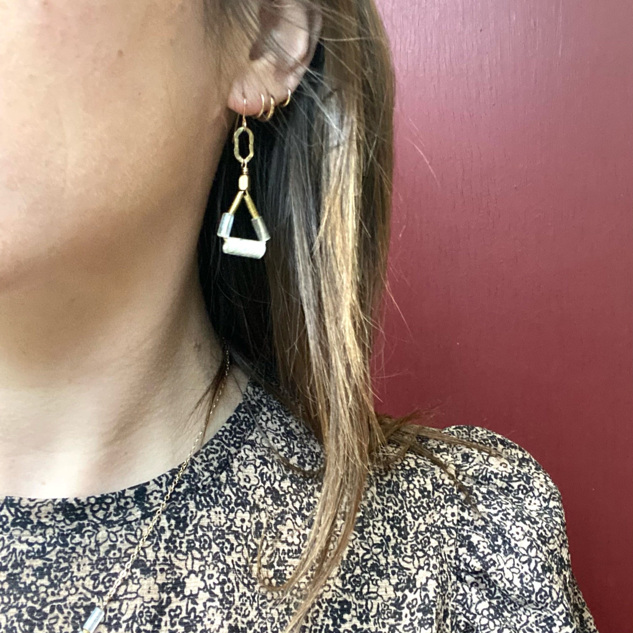 These lovely artisan earrings featuring hoops of vintage glass and brass tube beads. The hoops drop from flattened and hammered brass links. The pretty pale grey glass beads are the color of the sky on a cloudy autumn day. Dreamy. The ear wires are gold filled.