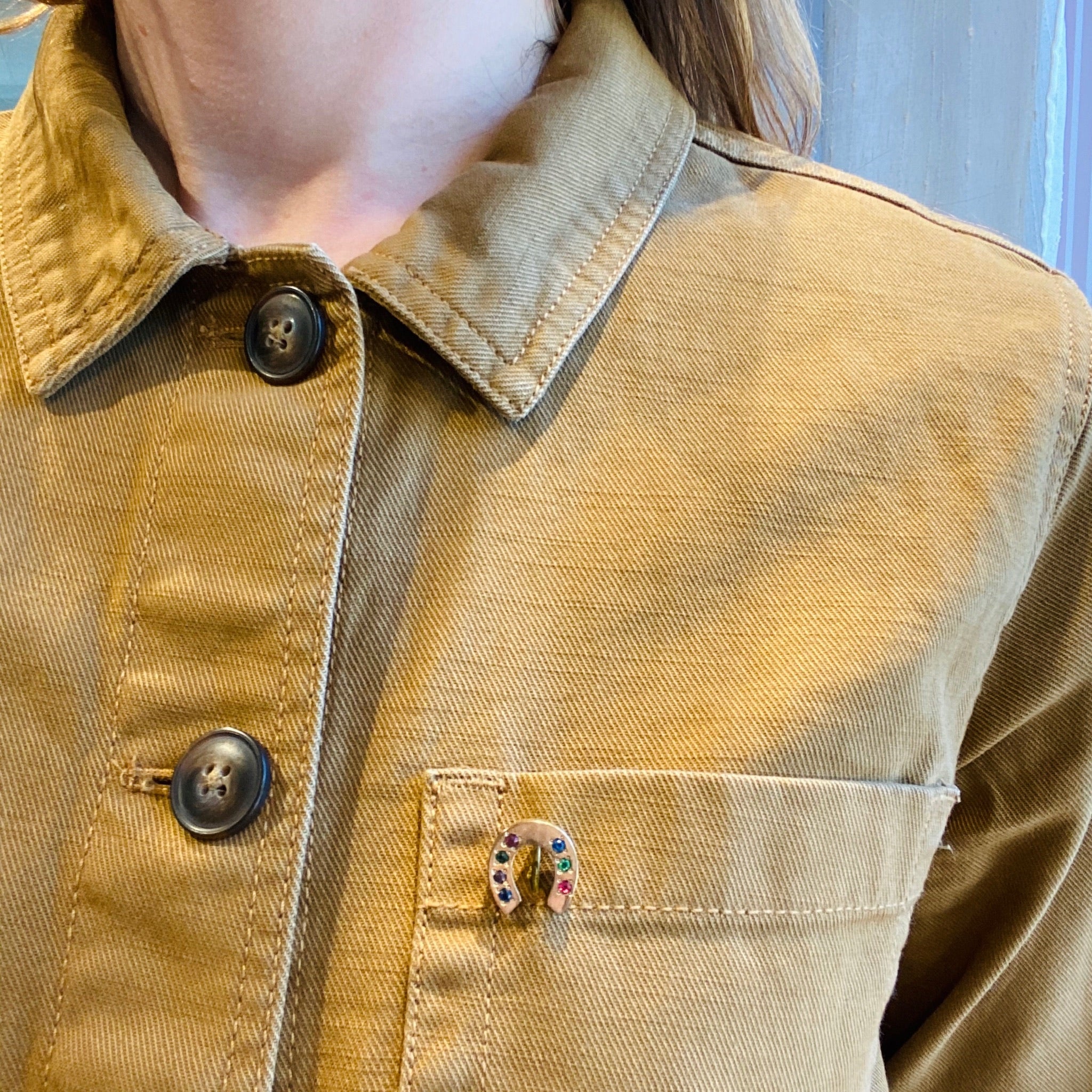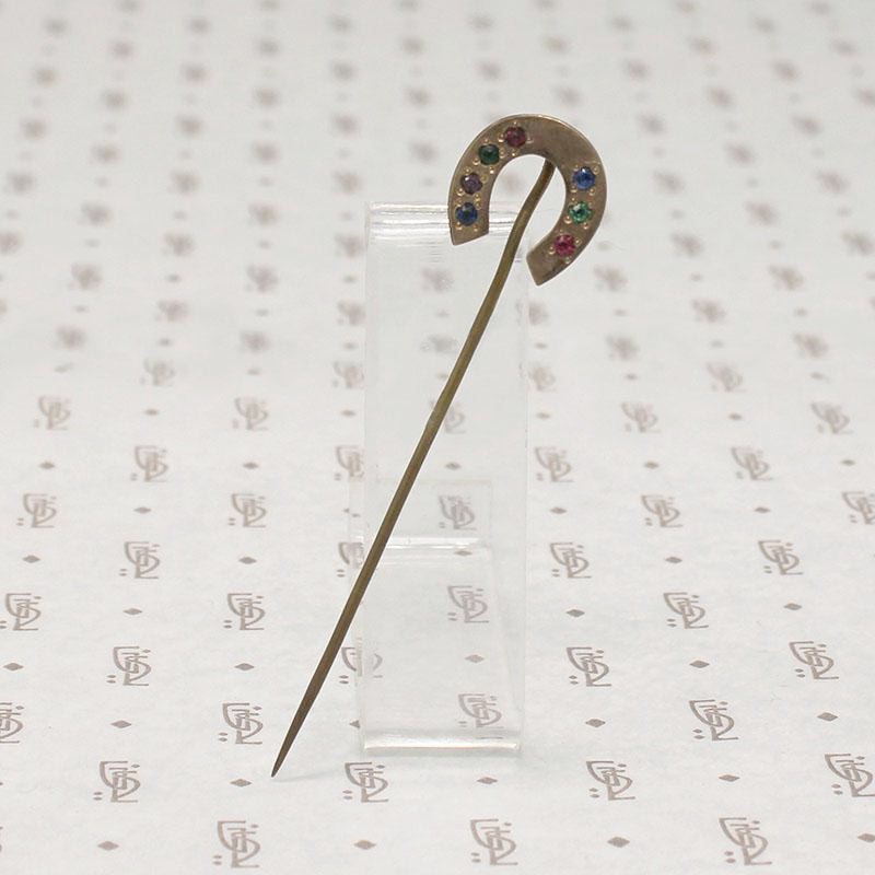 This cheerful horseshoe stick pin is colorful and fun. The brass horseshoe is set with rhinestones in  blue, green, red and purple. Equestrian motifs were very fashionable at the turn of the 19th Century.  Stick pins are equally fabulous worn on your lapel or scarf. Circa 1900.
