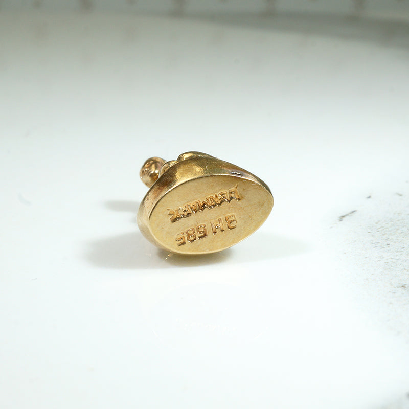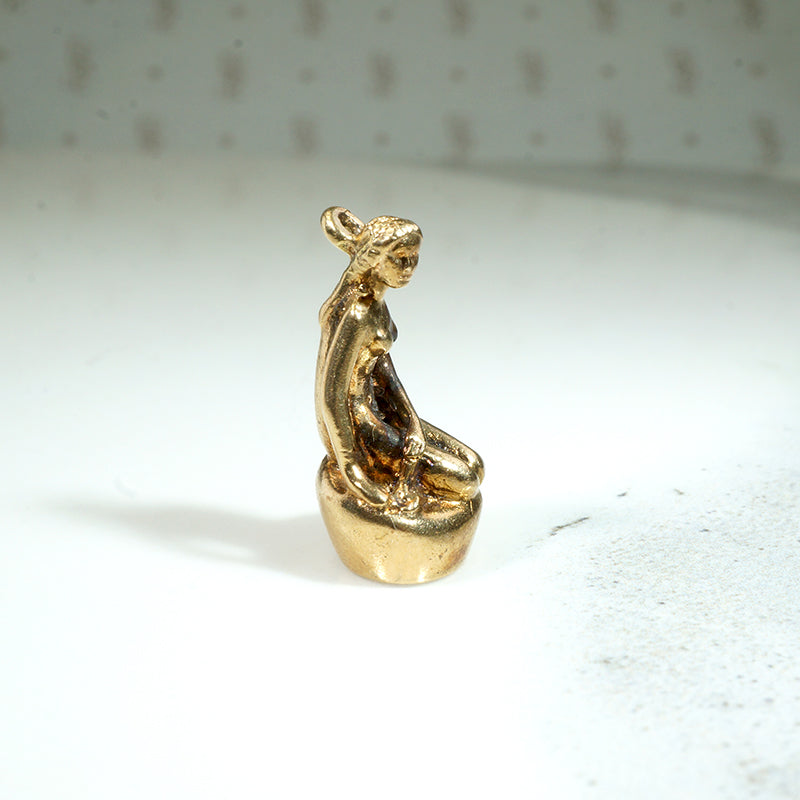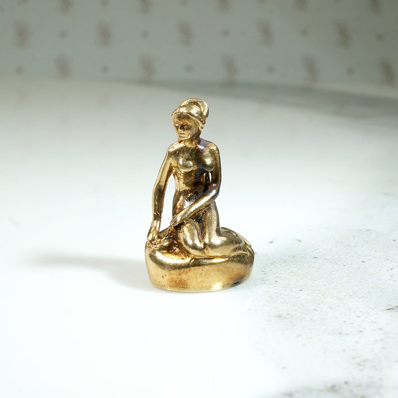 A miniature reproduction of Copenhagen's Little Mermaid statue, cast in 14k gold. The three-dimensional charm is weighty, with a buttery feel. A 14k gold split ring has been added to the bale, making the charm easy to add to a necklace or bracelet. The base of the charm is stamped "BH 585 Denmark" for maker Bernhard Hertz. Circa 1950.