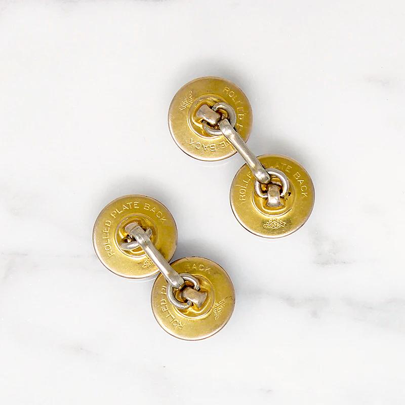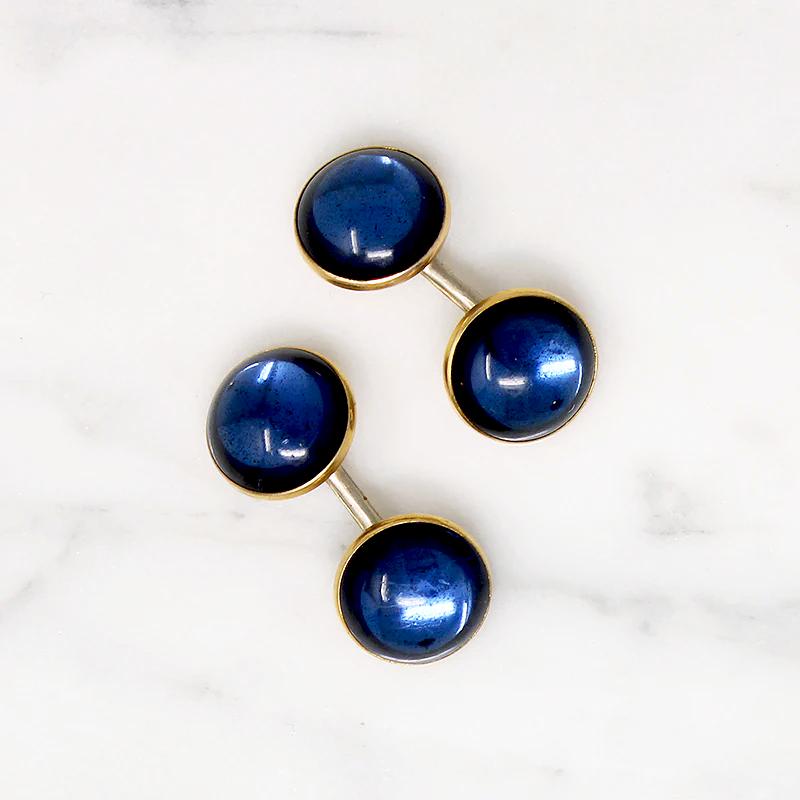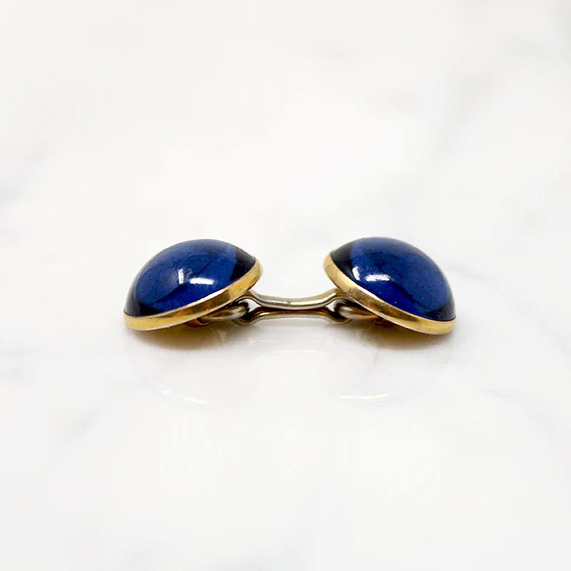 Bright blue glass cufflinks from Krementz & Co. The faces are cabochons of blue glass set in simple gold-filled bezels. These are link style cufflinks, with two faces connected by a link. The backs of the links are stamped "Rolled Plate Back" and with the mark "Correct". Wear these fun and stylish cufflinks with anything. Circa 1920.