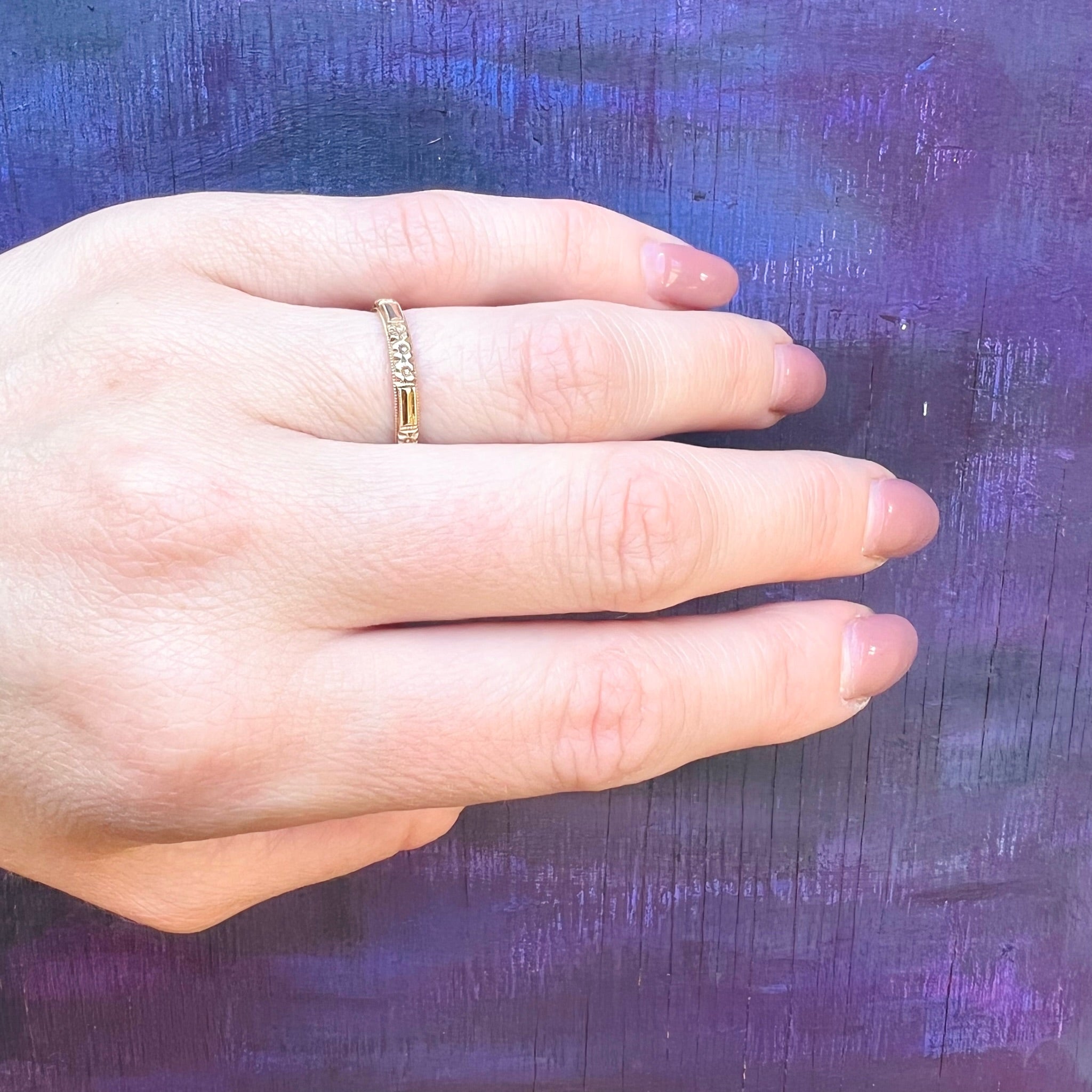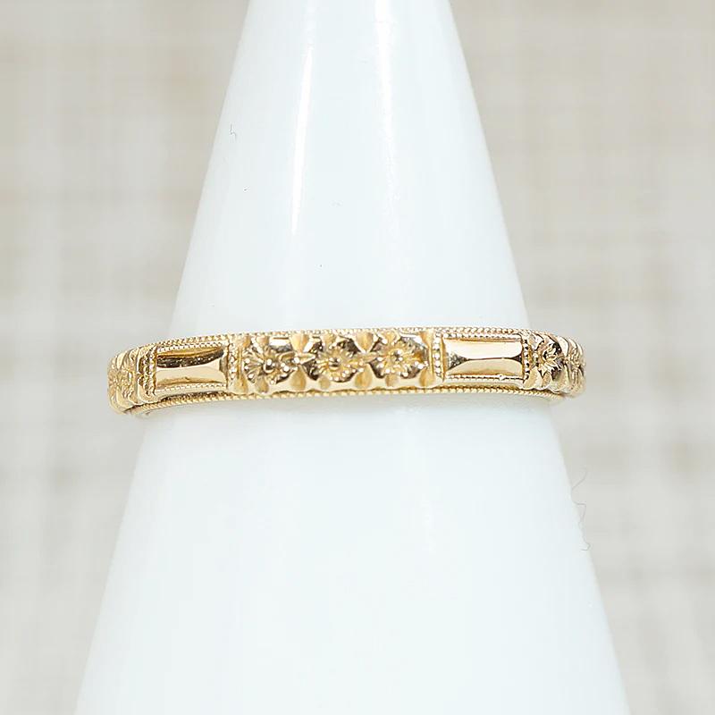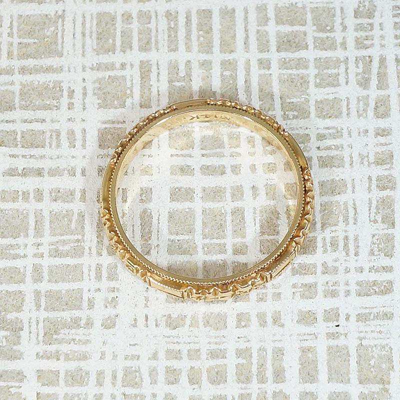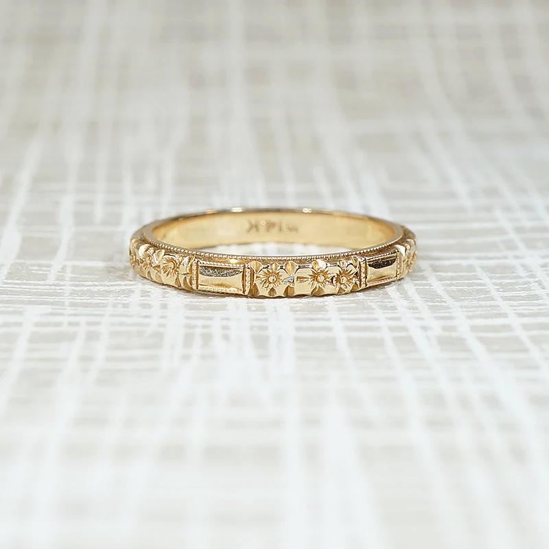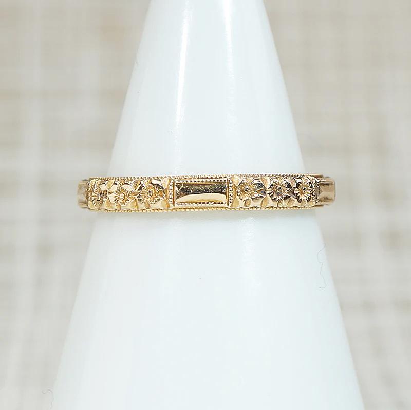 This Art Deco wedding band is a crisply engraved ring of faceted bars and flowers. Milgrain edges elevate the ring. Wonderful condition, with sharp detail and a satisfying weight. Marked 14k. Wear this band alone or paired with your vintage engagement ring. It will add great texture to your stack, too. Circa 1920.