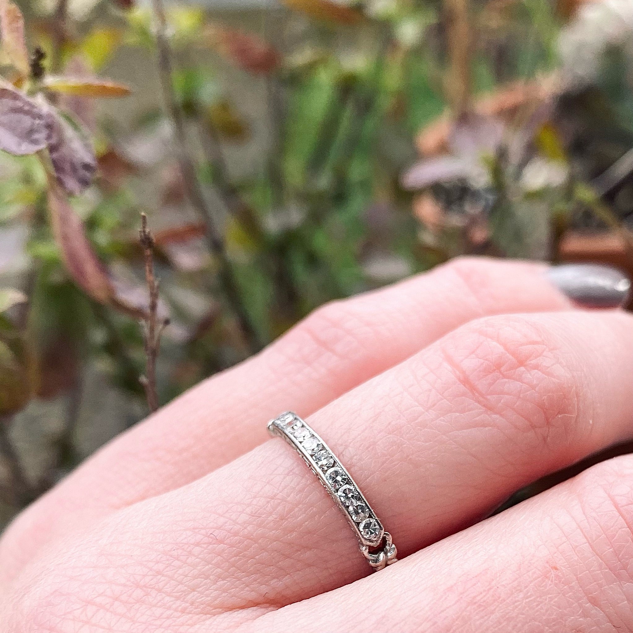 This perfect petite platinum band has nine tiny diamonds set in a fabulously engraved channel. Flanking the channel are open sculpted buckle details, a classic Art Deco design. This beautiful band is in great condition; crisp, clean and sparkling. Circa 1930.