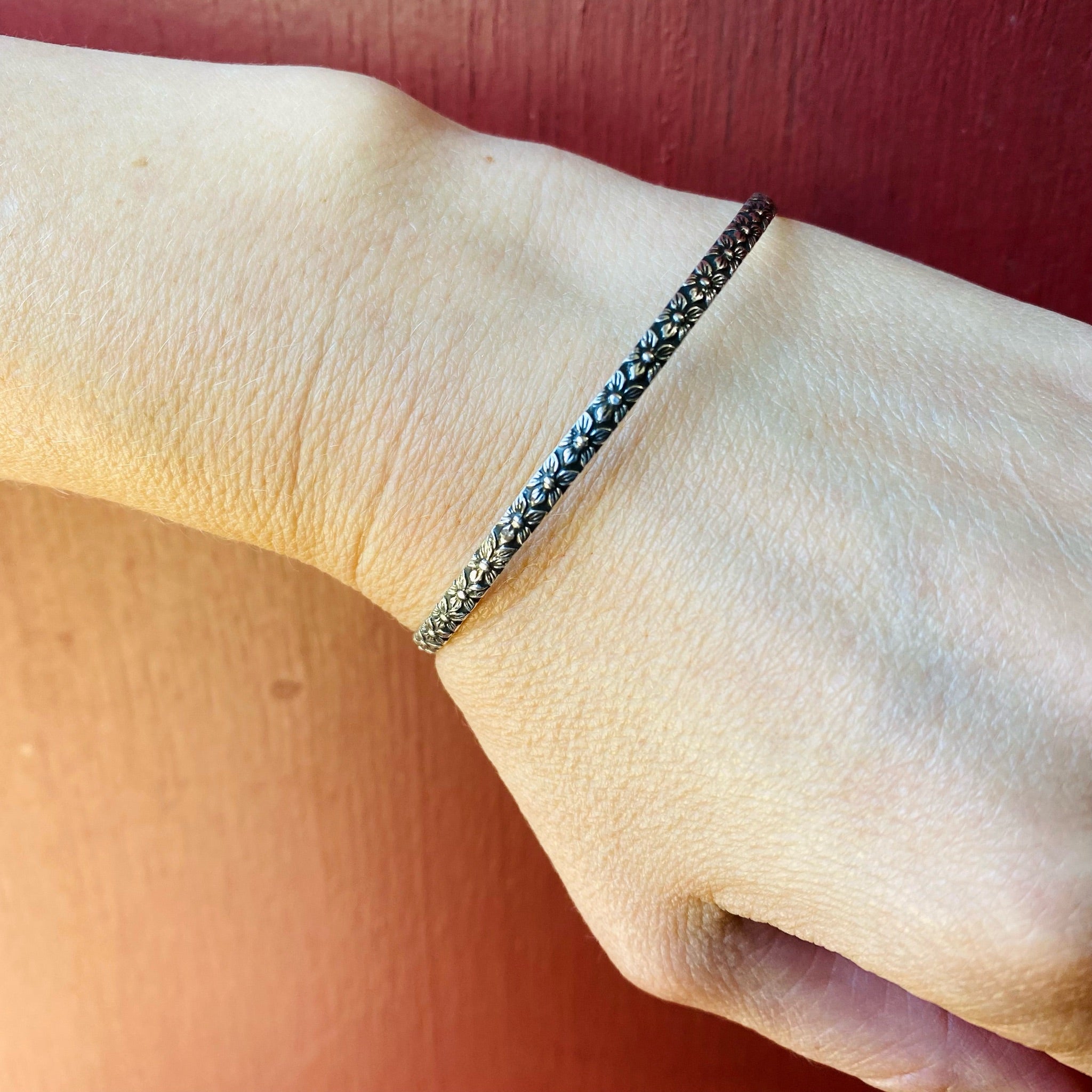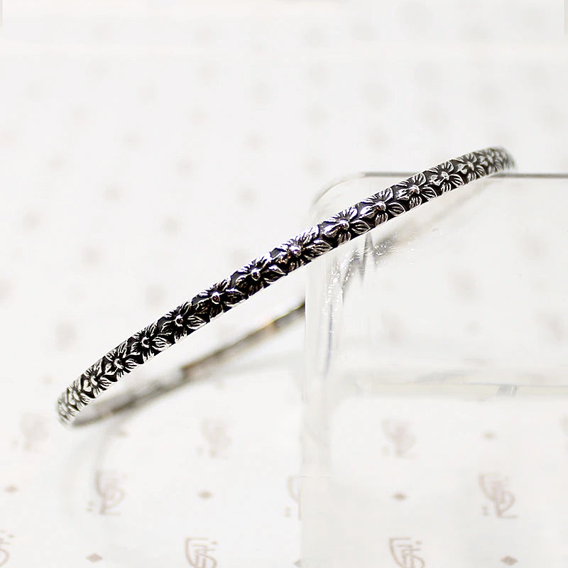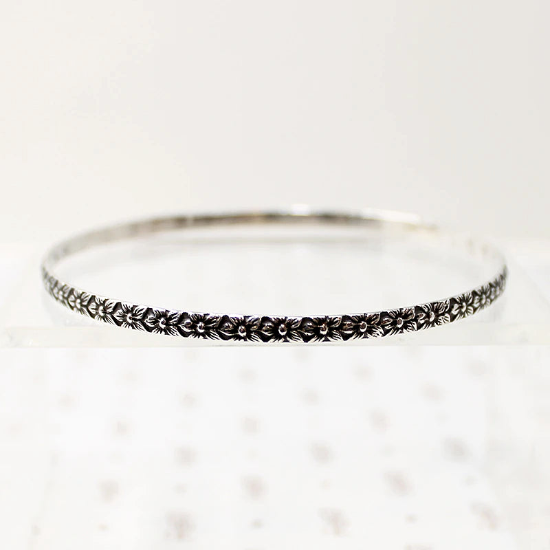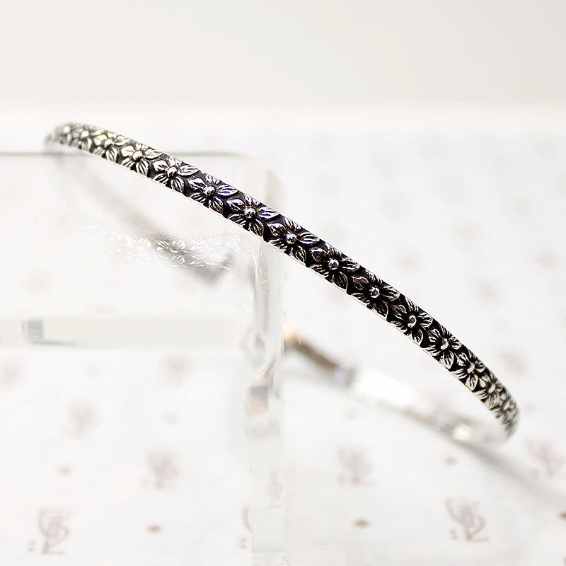 A vintage sterling silver bangle exquisitely engraved with a pattern of flowers. The engraving is beautiful, highly detailed and crisp. This pretty piece that will add some romance to your bangle stack. The interior of the bracelet is marked "Sterl-Hedy." Circa 1950.