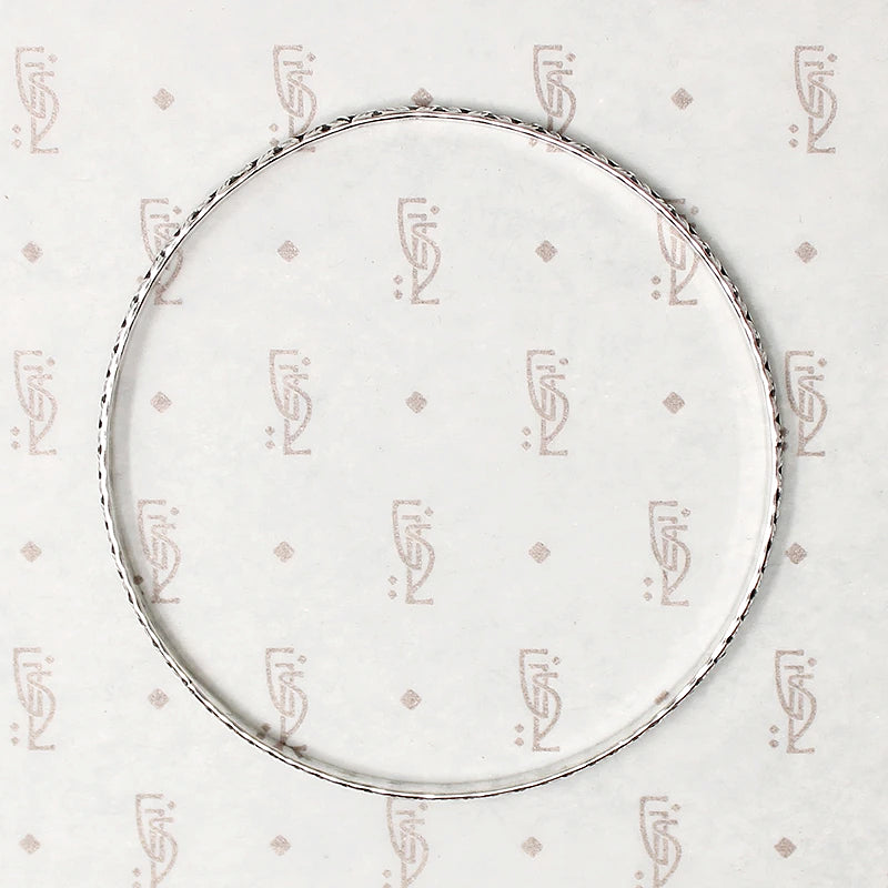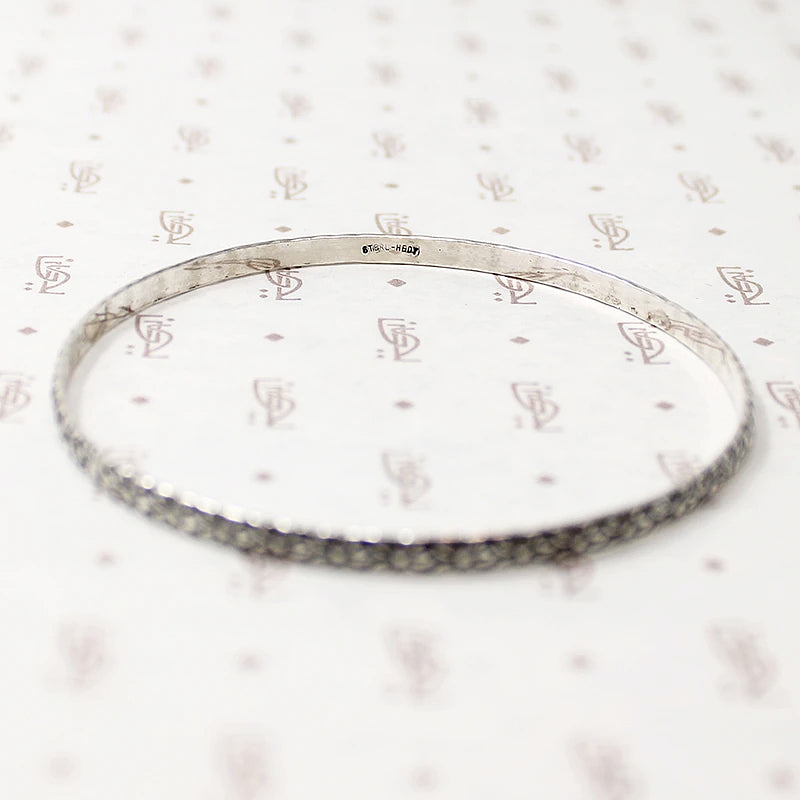 Details.....The bangle measures 3.2mm wide with an approximate 8.15" inner circumference. It weighs 7.4 grams. In Very Good Vintage Condition. You should always expect some wear on your vintage and antique jewels, we consider it part of the charm.