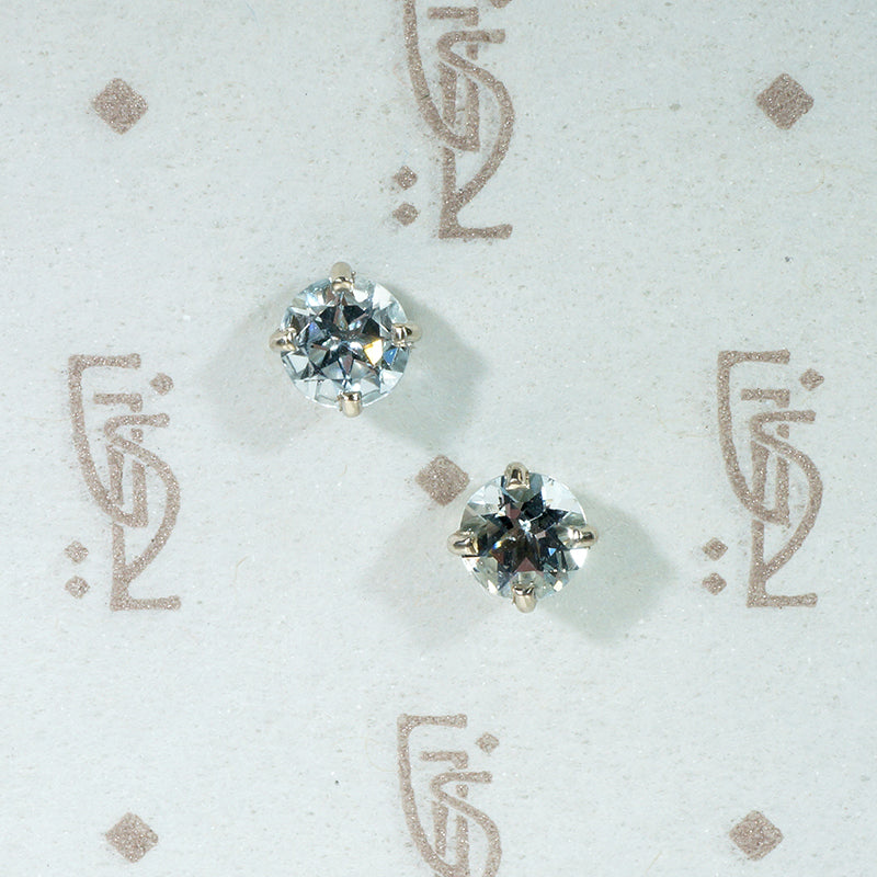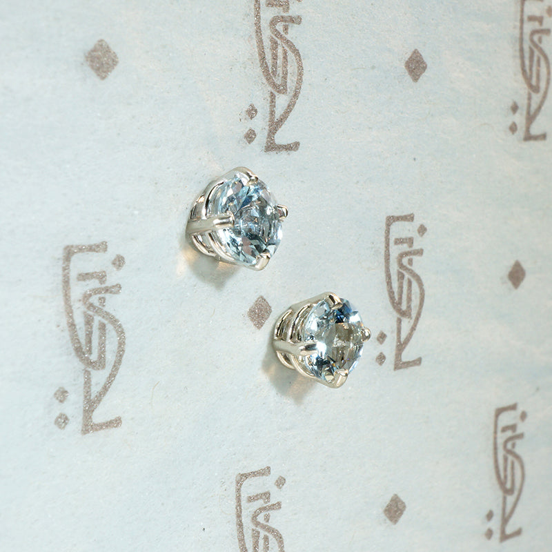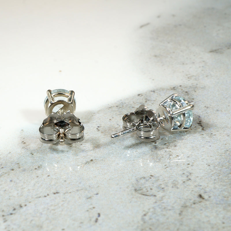 Crystalline blue aquamarine gemstones shimmer and shine in 14k white gold stud earrings. These vintage gems have a total weight of 0.85 carats. The aquamarines nestle in simple four-prong basket settings atop classic posts and friction backs. Aquamarines make a delightful alternative to diamond studs and an ideal gift for a March baby. The gold used in these studs and in everything we make is recycled.
