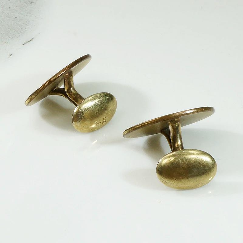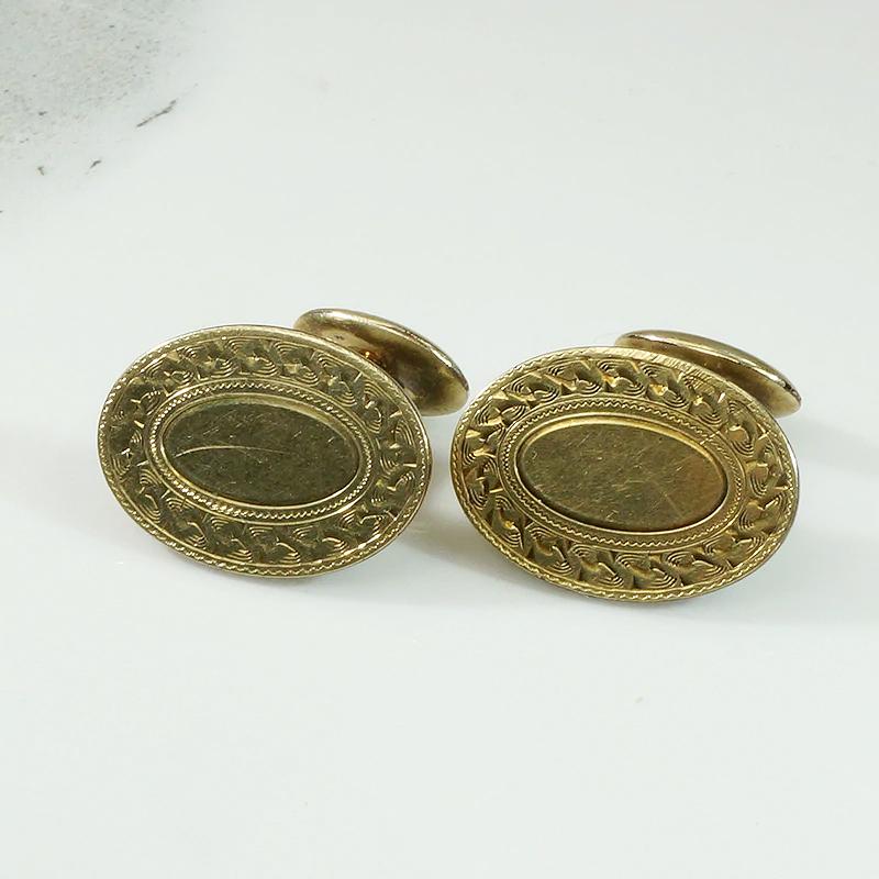 Handsome Victorian cufflinks with elegantly engraved tops. These antique cufflinks are glossy gold filled, with slight wear to the metal. The top panels are oval with a complex plaited pattern engraved around the edges. These are ball return style links that are stationary, easy to wear, with a relaxed fit. Such beautifully made cufflinks will always be stylish, no matter the century. Circa 1890.