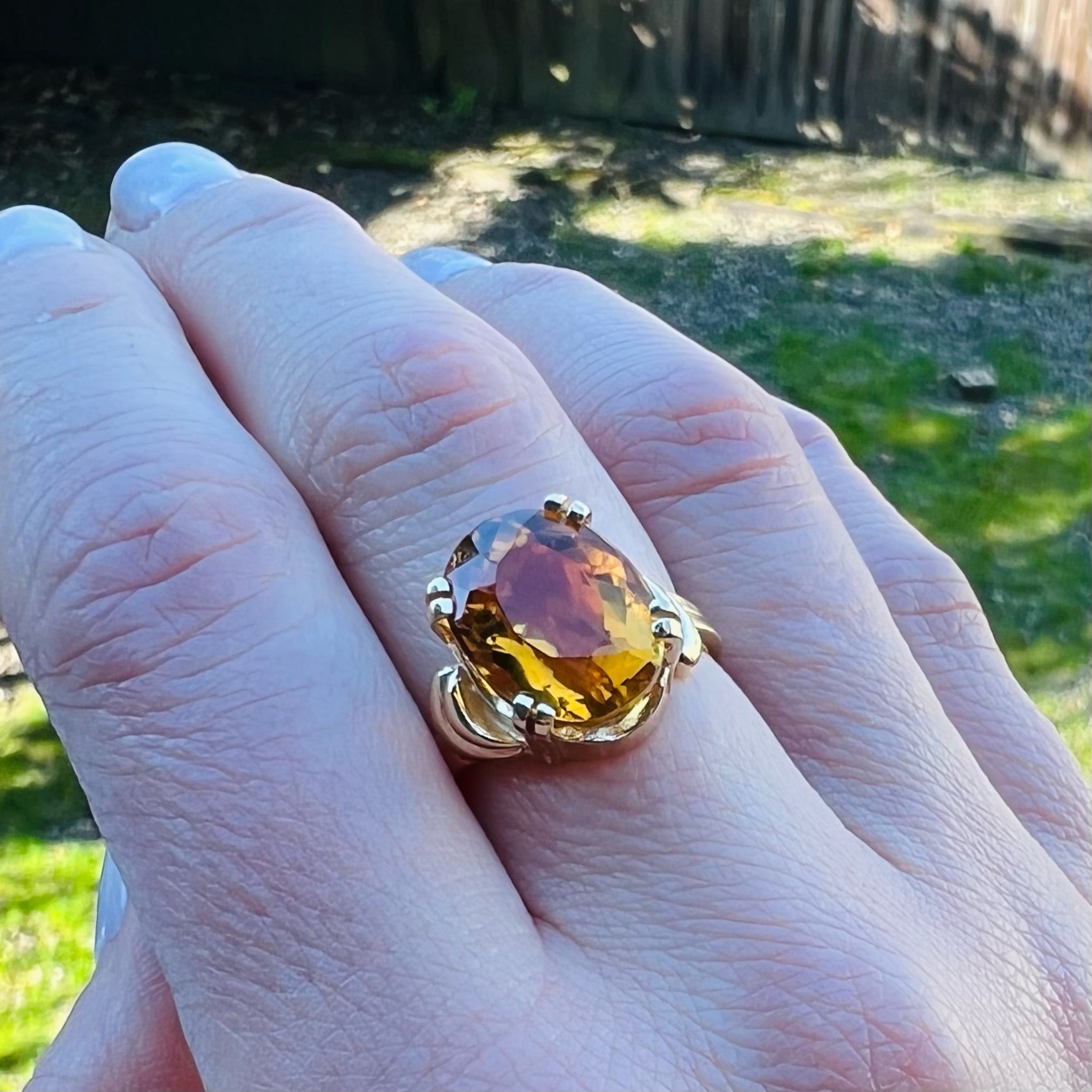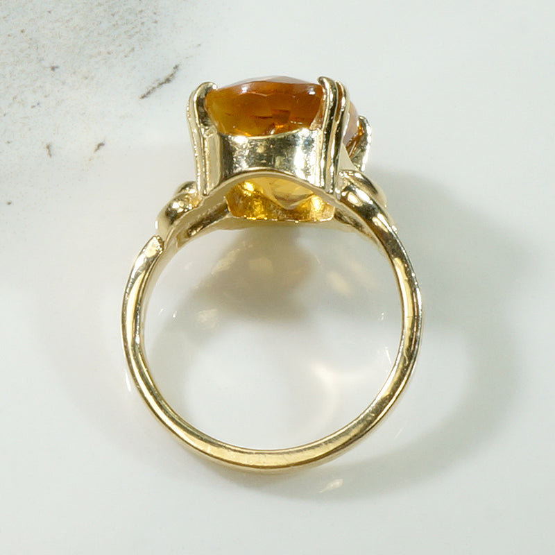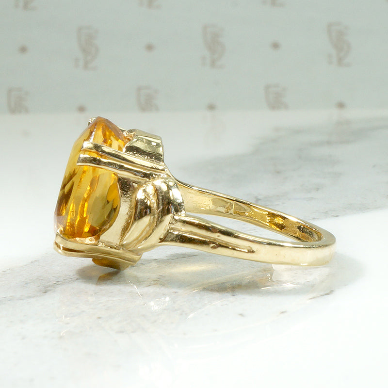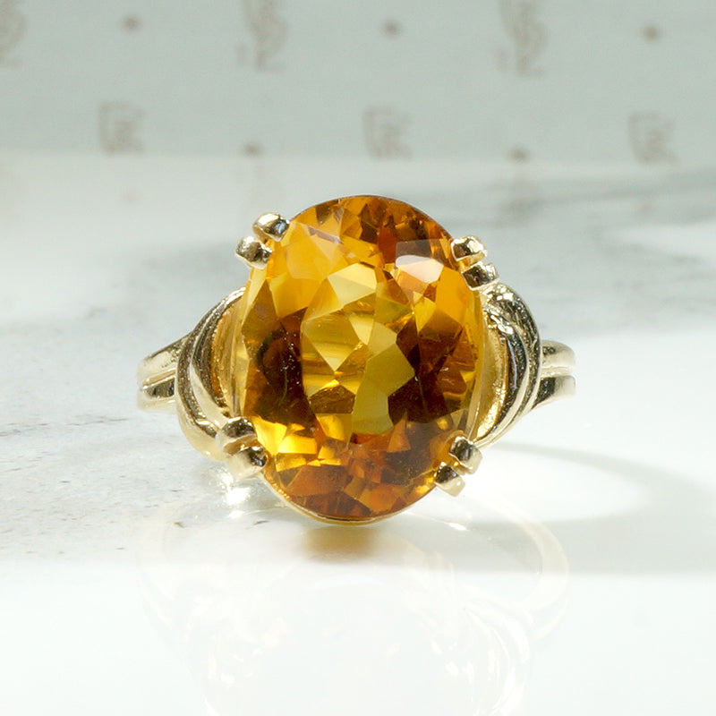 Details.....Currently a size 6.5. The ring may be sized up or down two sizes free of charge. The citrine measures 10.3mm by 13.4mm. The ring measures 16.2mm from shoulder to shoulder, and the band is 2mm wide. In Very Good Vintage Condition. You should always expect some wear on vintage and antique jewels, we consider it part of the charm.