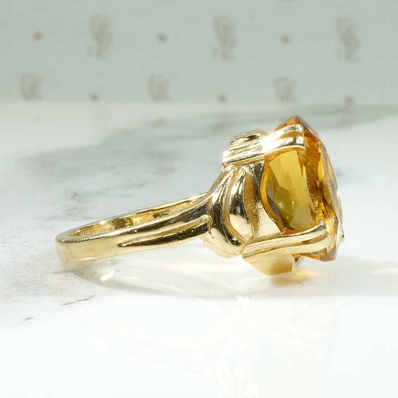 A sunny citrine sits in a curvy 14k yellow gold cocktail ring. The oval gemstone shines like late summer sunshine. The stone sits in four fancy split prongs, framed between waves of groovy gold. The basket holds the citrine high and proud. A fabulous gift for a glamorous Scorpio. Circa 1970.