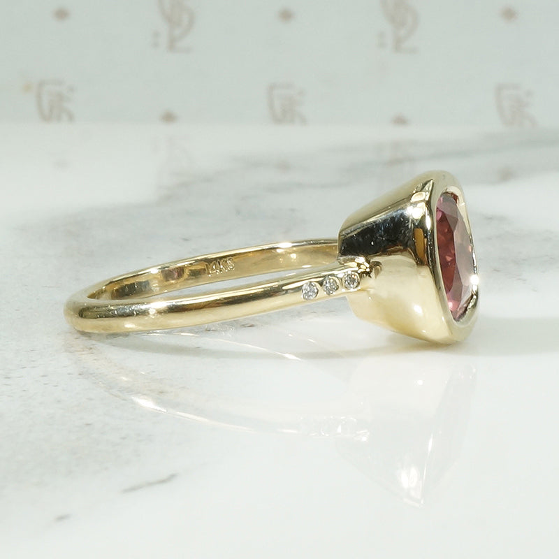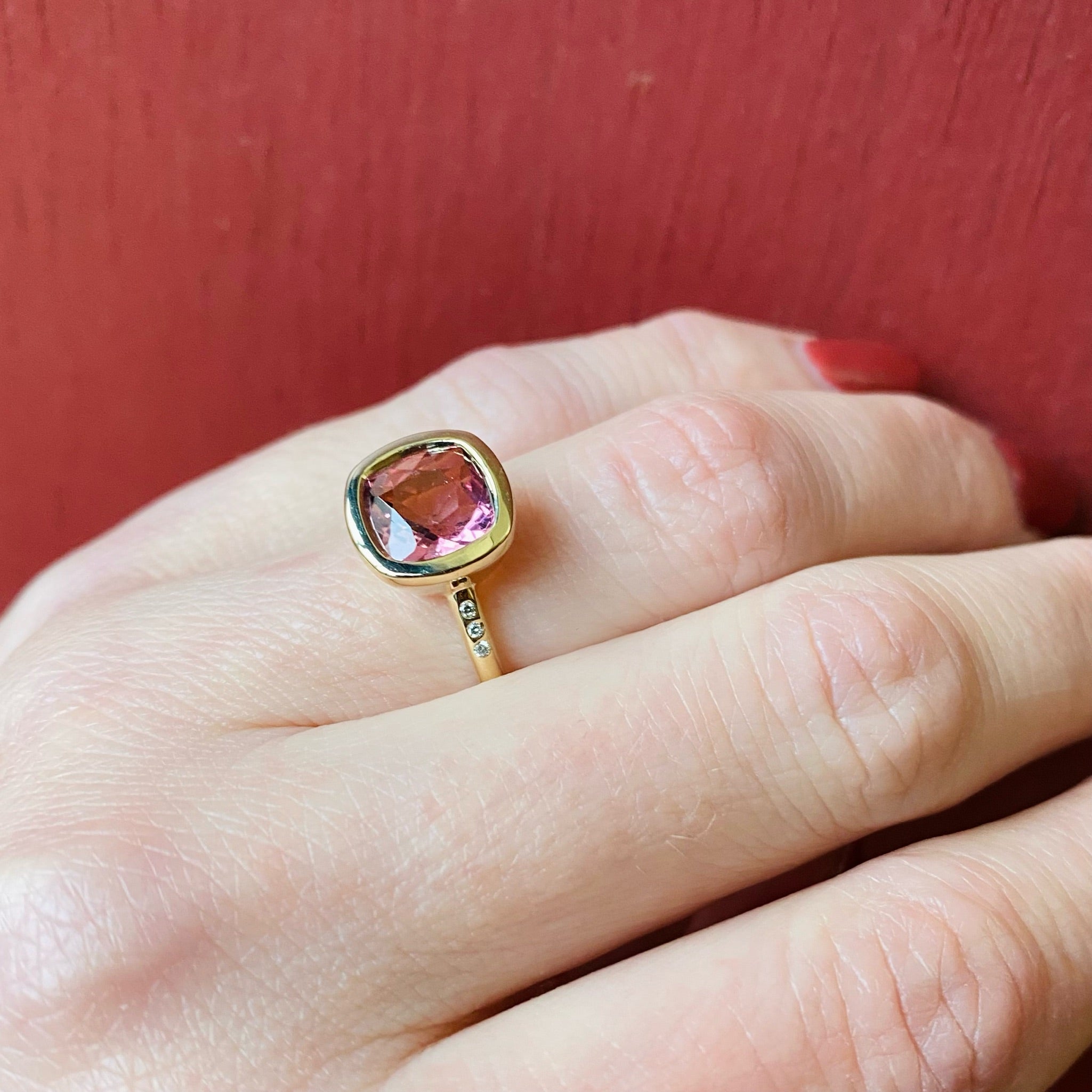 This gorgeous deep pink cushion cut tourmaline is nestled in a bezel setting shaped perfectly to the gem. Looking into this gorgeous natural vintage Tourmaline is like looking into a hall of pink mirrors, never ending. We added 3 antique diamonds to each shoulder and kept all the lines curvaceous and graceful. This ring is not only lovely it is strong and comfortable to wear. Welcome to your new favourite ring. The Tourmaline weighs 2.34 carats and the gold is recycled 14k.
