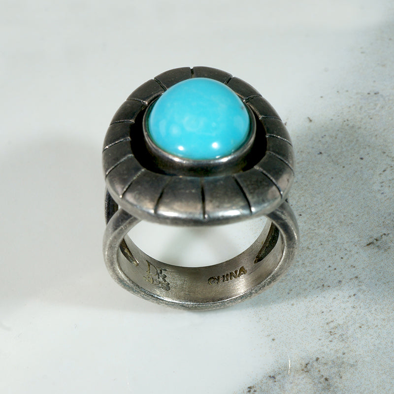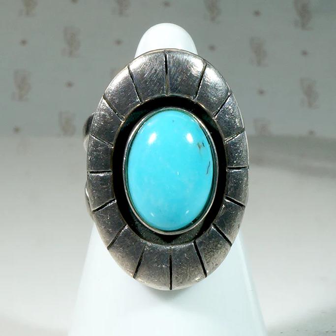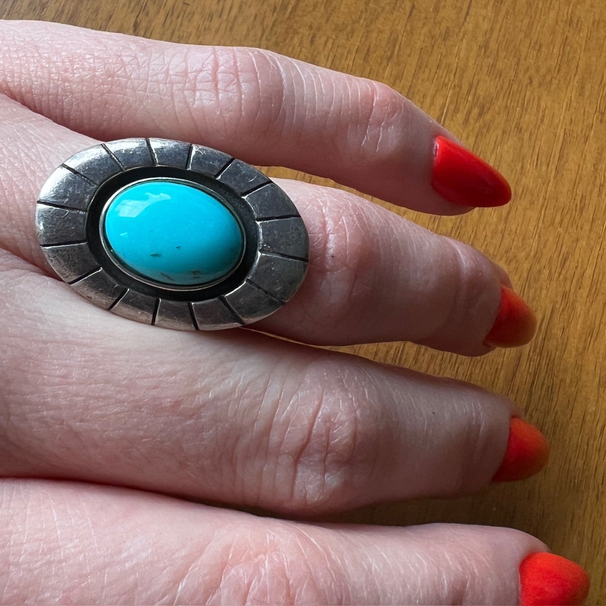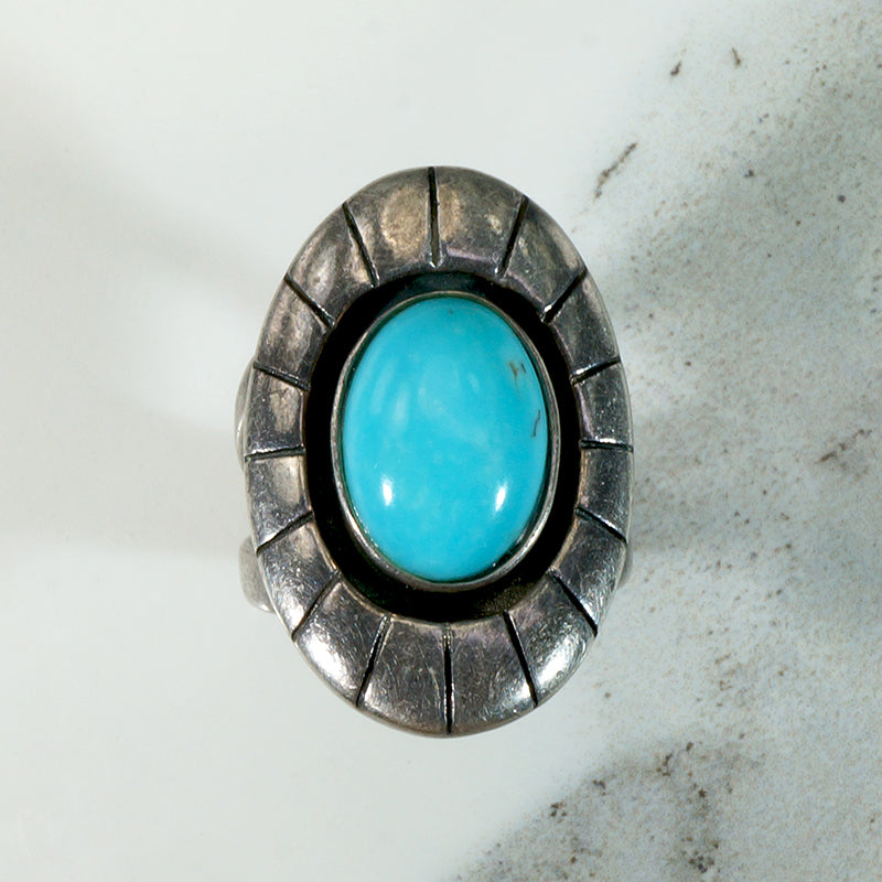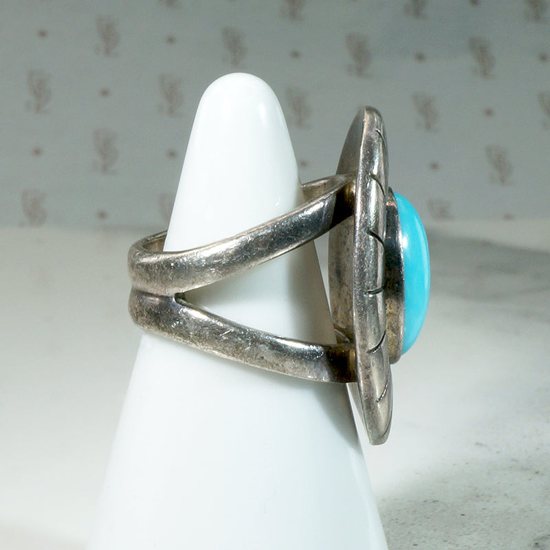 This chunky sterling silver ring is set with an oval turquoise gem of tranquil cyan blue. The dreamy stone is set in a heavy shadowbox frame, rayed with incised lines. Split shoulders taper into a heavy double band. The inside of the band is stamped "Sterling" and "China." Circa 1960.
