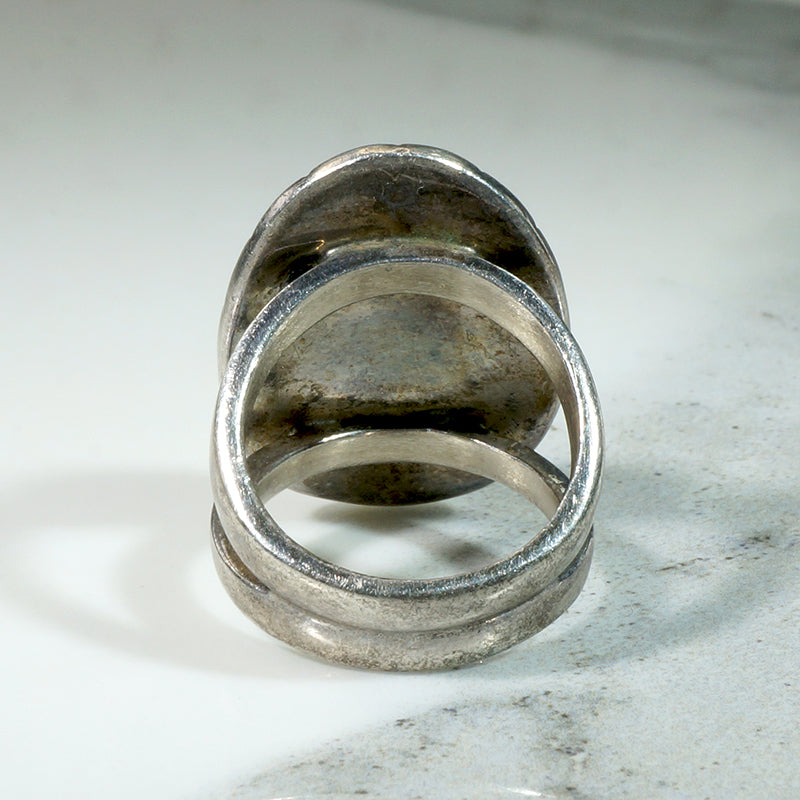 Details..... Currently a size 6. For a fee, silver rings can usually be sized within two sizes. Contact us for sizing information about this ring. The top of the ring measures .75" by 1.11", and the band is 6.5mm wide. In Very Good Vintage Condition. You should expect all vintage and antique jewels to show some wear; we consider it part of their charm.