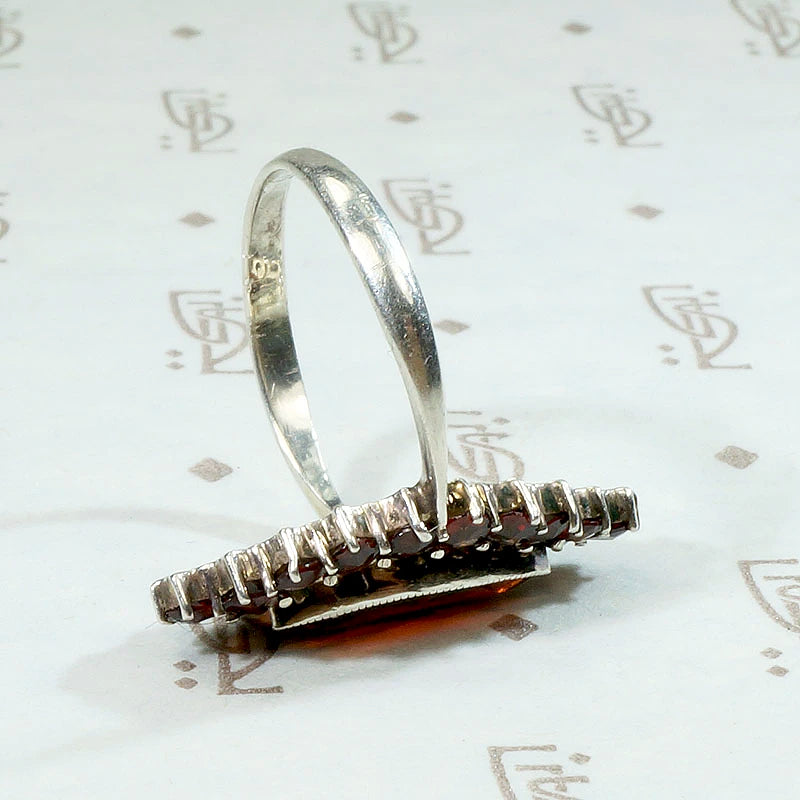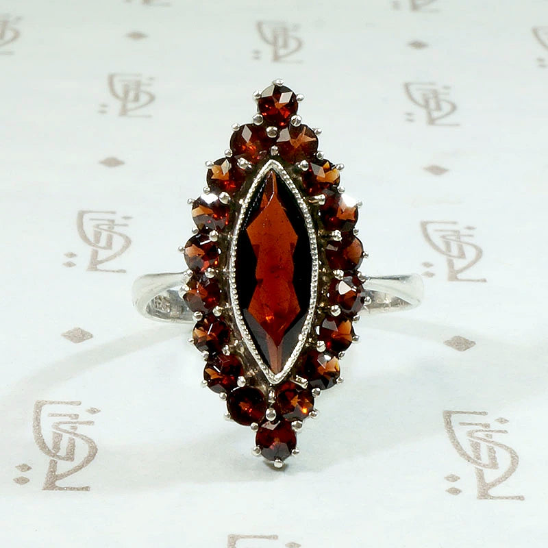 A wonderfully gothic Czech garnet ring, all Dark Sparkle and pointy ends. A marquise cut garnet is set in a beaded bezel and surrounded by a halo of prong set rose cut garnets. The navette-shaped setting is 835 grade silver. A perfect accessory for those Creature of the Night moments. Circa 1950.