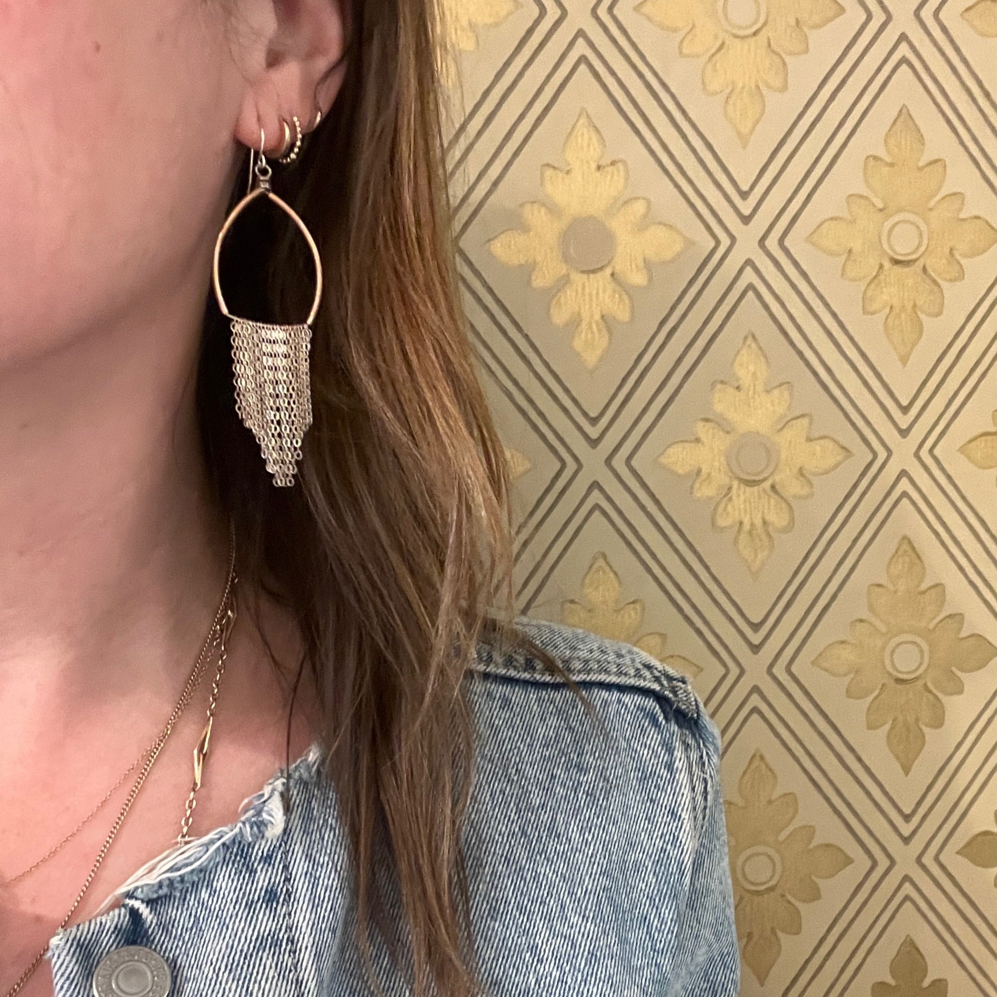 These artisan chandelier earrings feature a sultry sterling silver fringe. The dagged fringe of silver cable chain hangs from an arch made of vintage brass tubes. The brass tubes have an interesting matte texture; the effect is tactile and sensual. The French ear wires are sterling silver. Dramatic, lightweight earrings with a fabulous Dancing Queen vibe.