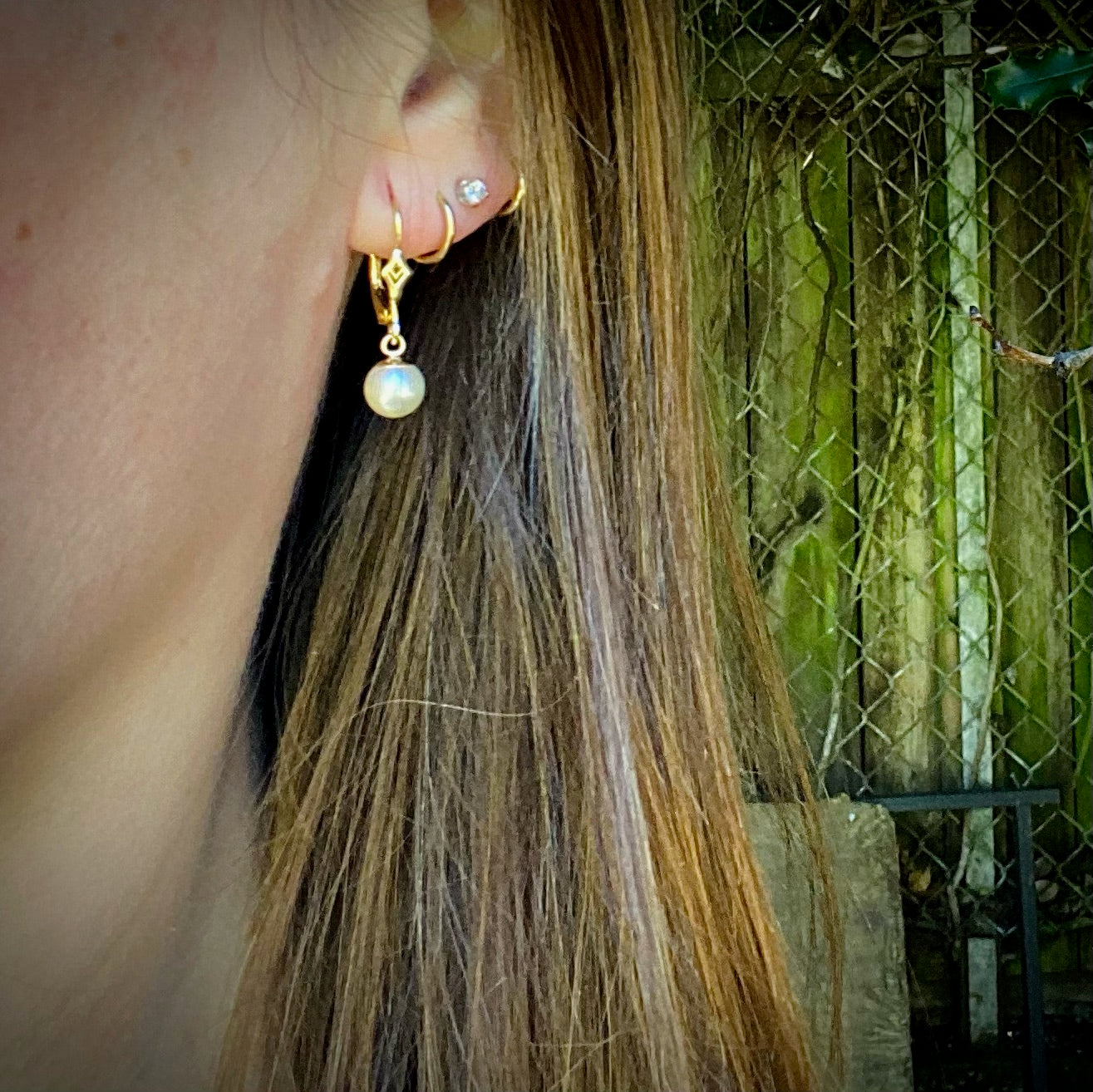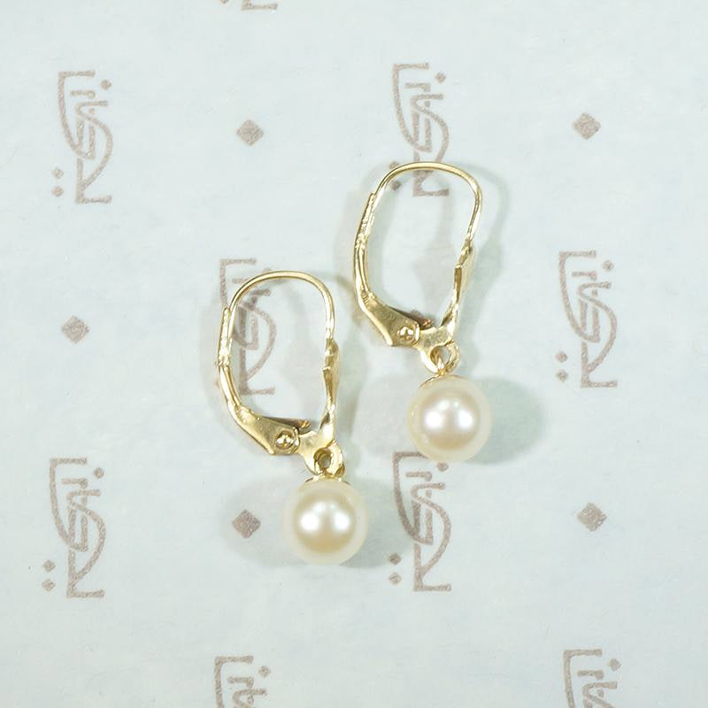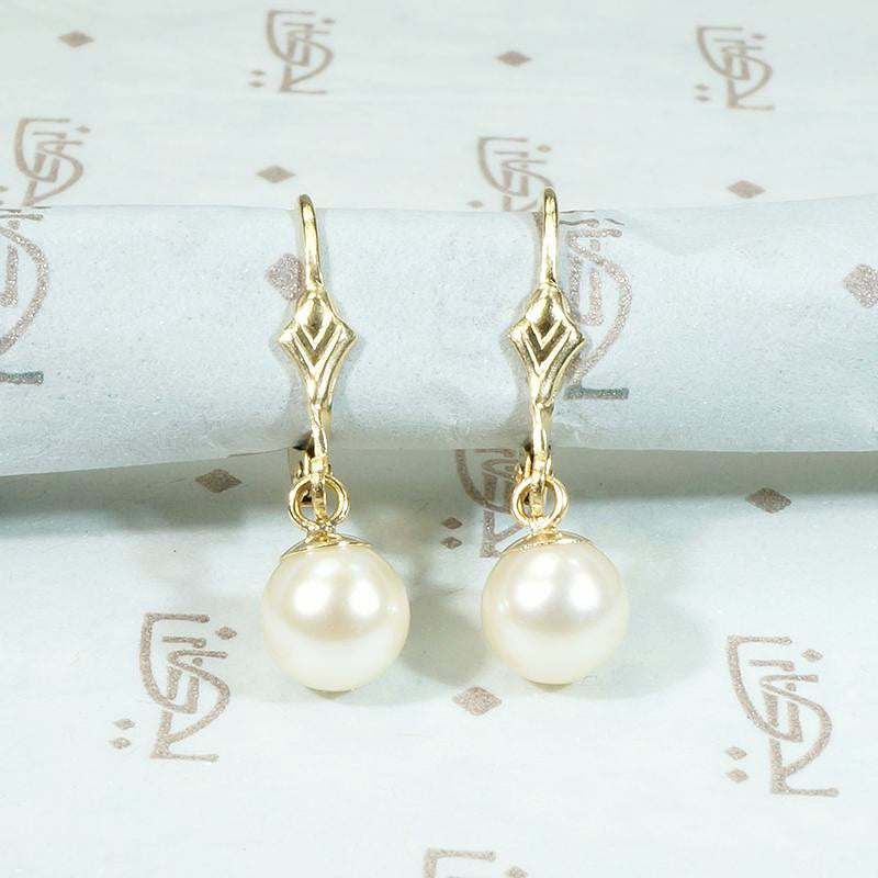 Very pretty and feminine, these delicate pearl drop earrings are lightweight and very wearable. Creamy white pearls are capped in 14k yellow gold. They dangle from ear wires that have a sweet decorative element. With lever backs for security, these will make perfect earrings for daily wear.