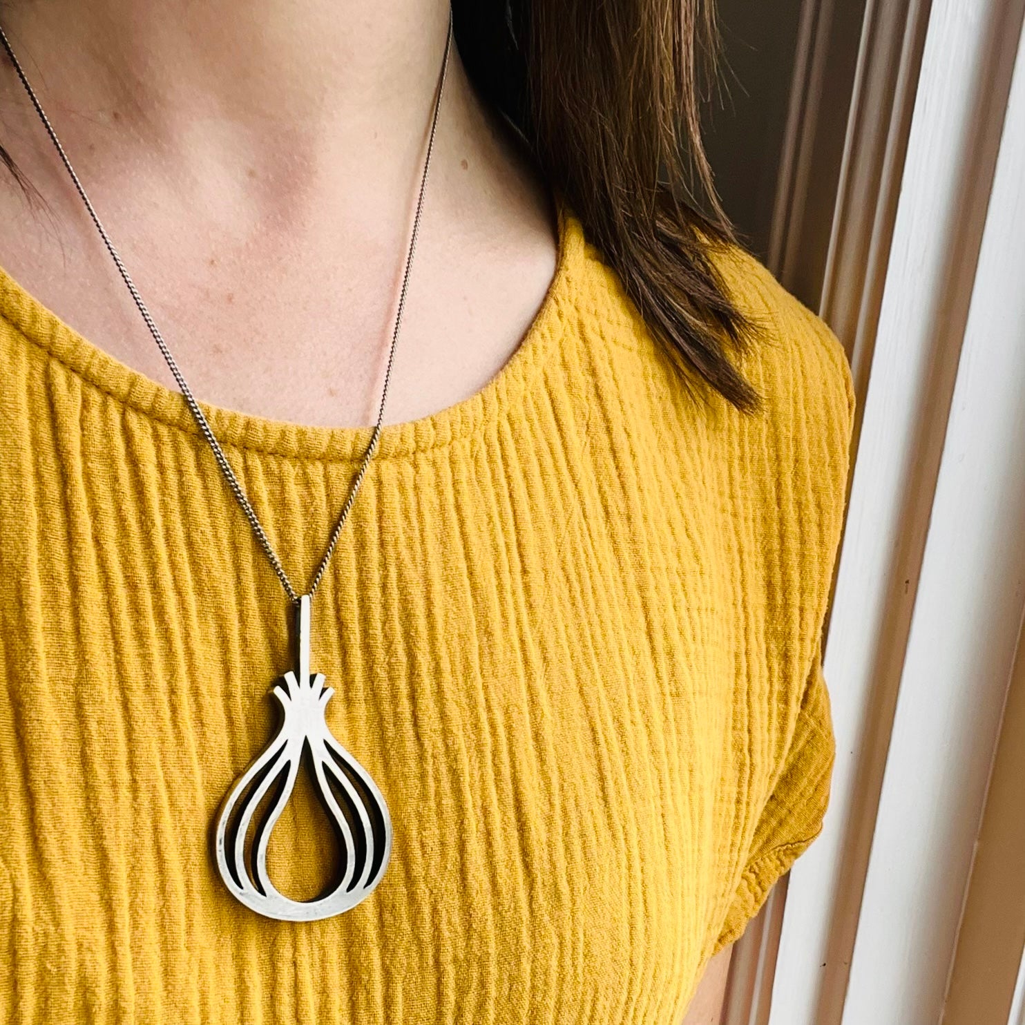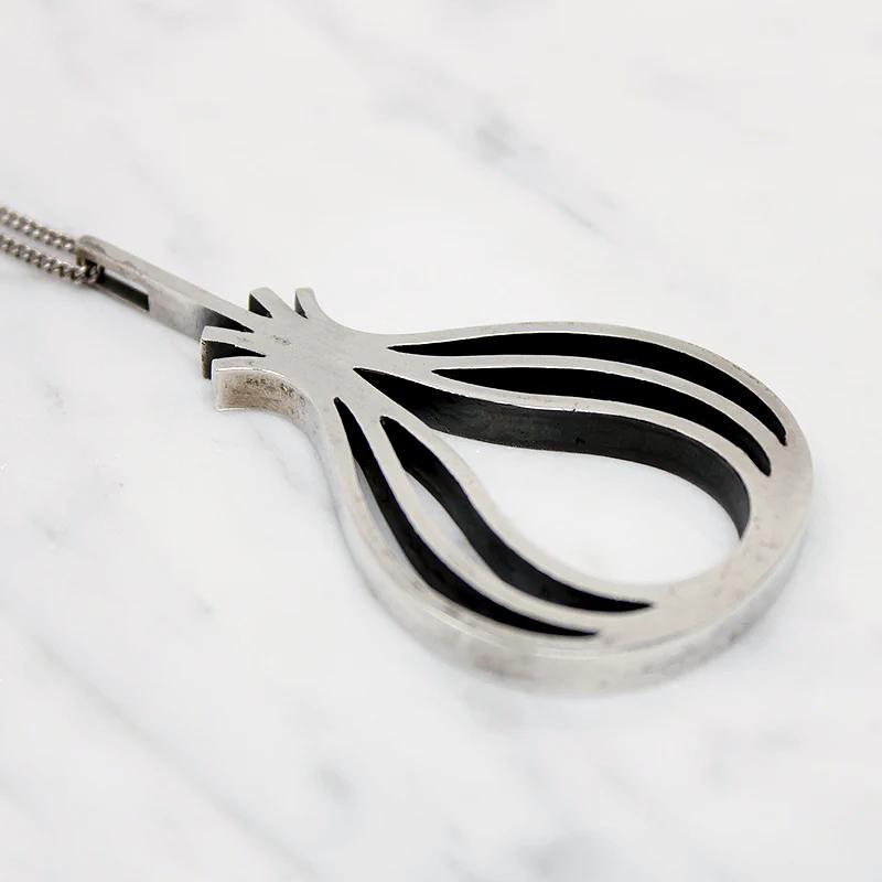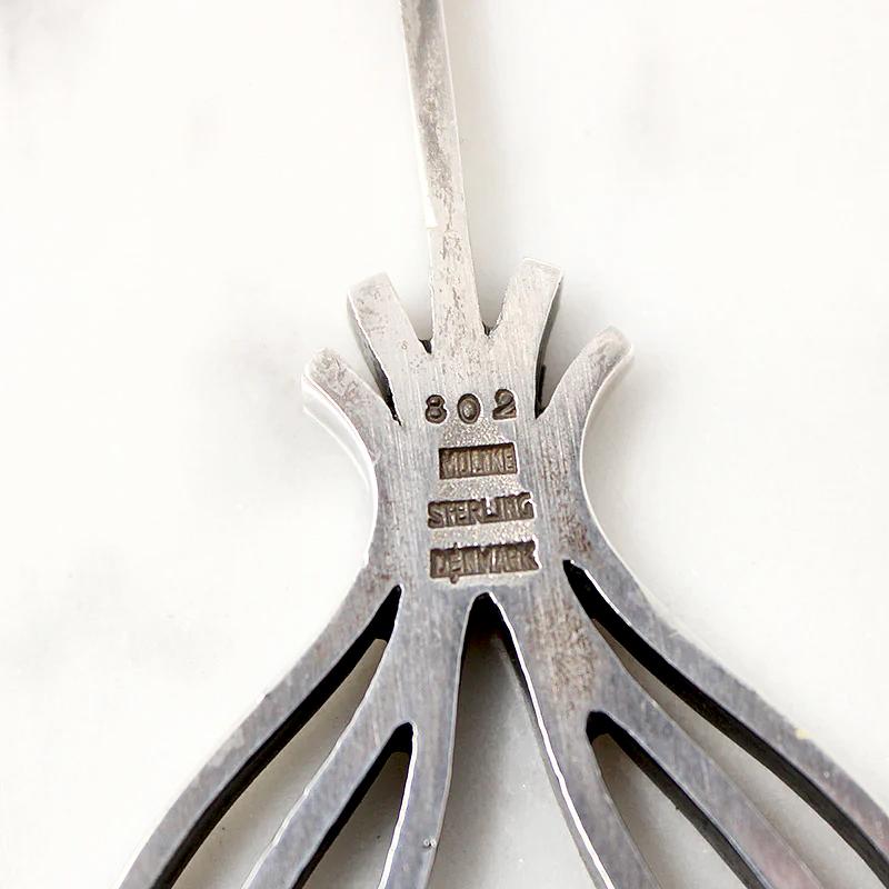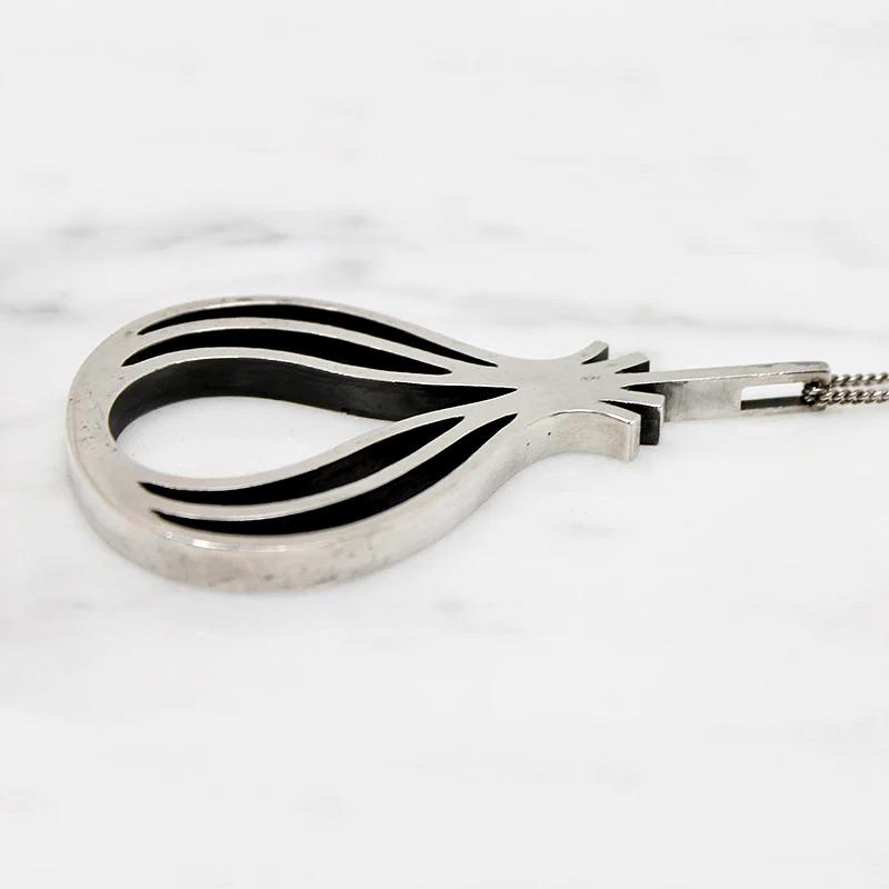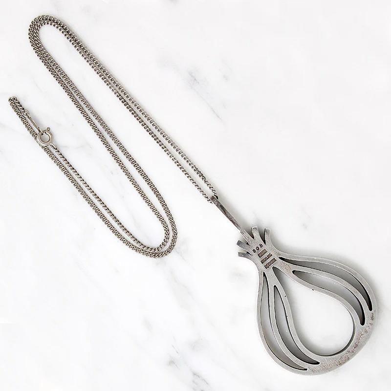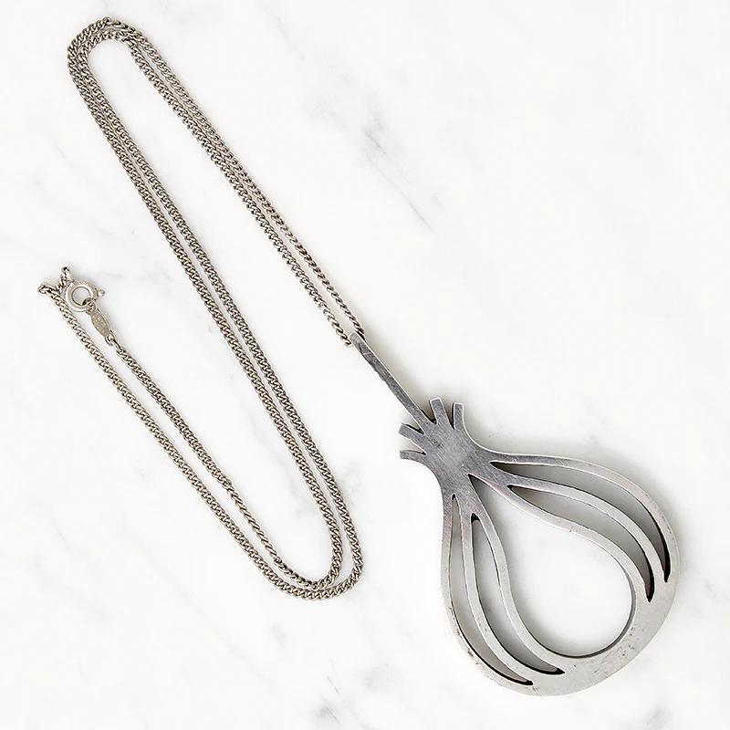 This Danish Modern necklace from Uwe Helmuth Moltke is bold, graphic, and fun. The substantial pendant is a simplified representation of a bulb drawn in lines of sterling silver. An elongated rectangular bale is integrated into the piece. It hangs from a vintage sterling silver curb chain. The back of the pendant is marked "Sterling," "Denmark," "Moltke," and with the design number "802." This cool necklace will make a great addition to your collection of Danish Modern design. Circa 1970.