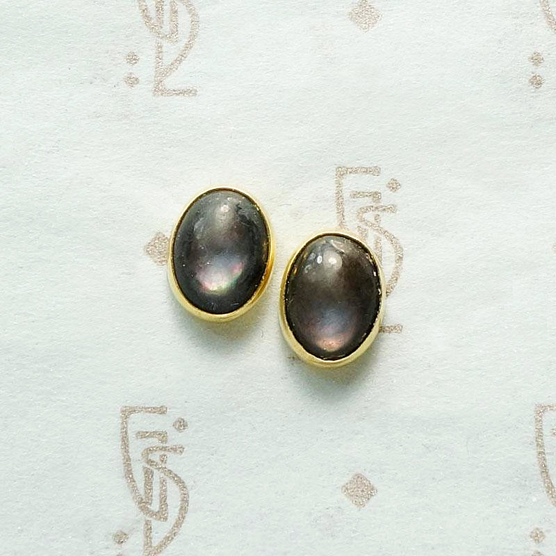 These vintage stud earrings feature dreamy labradorite stones in 14k yellow gold bezel settings. The labradorites are oval cabochon cut stones, their dark iridescence is hypnotic. The sleek bezels make these stud earrings perfect for every day wear, they are comfortable and won't snag your hair or clothing. Circa 1960.
