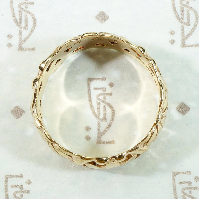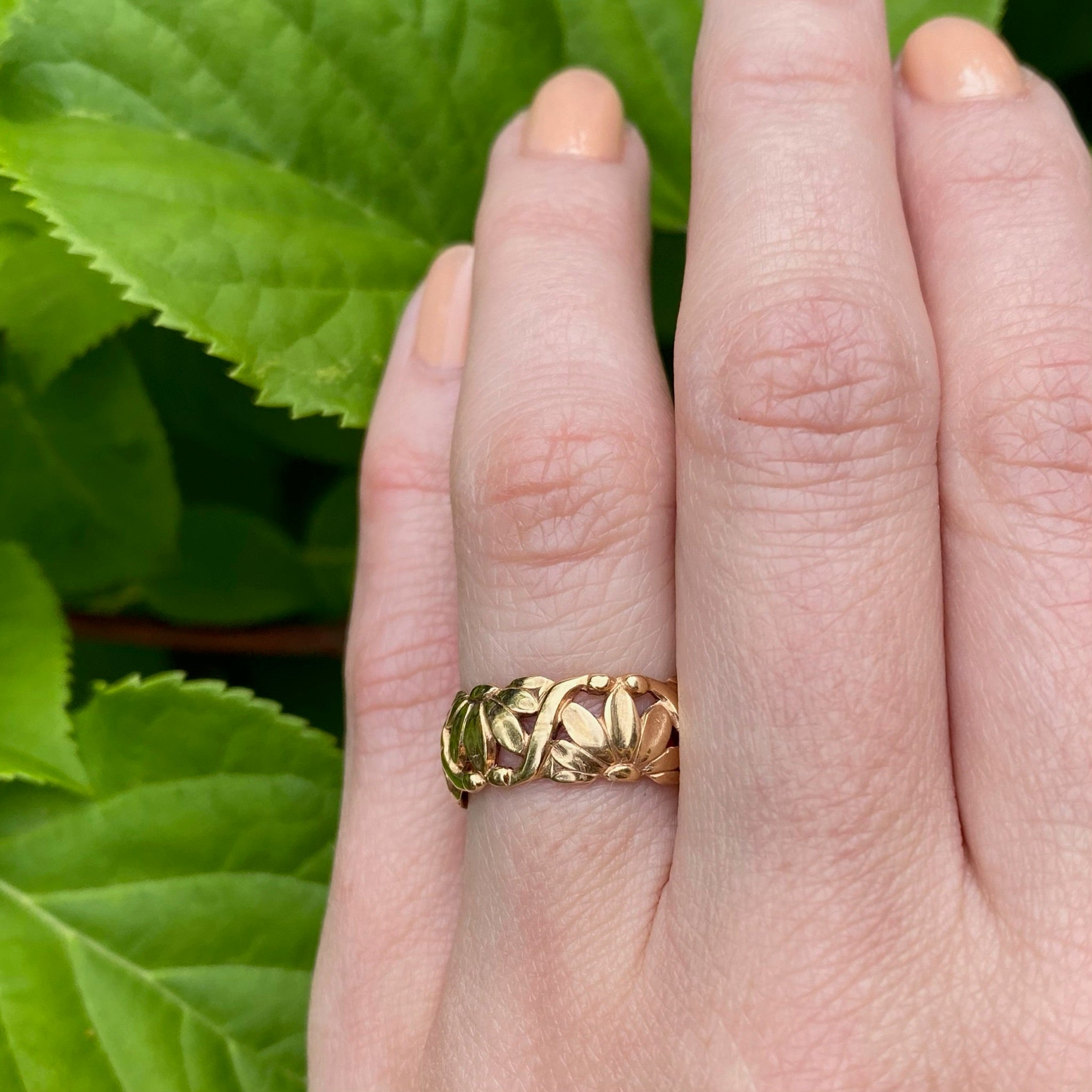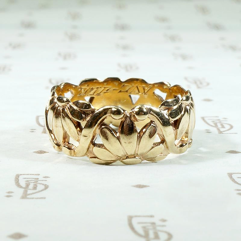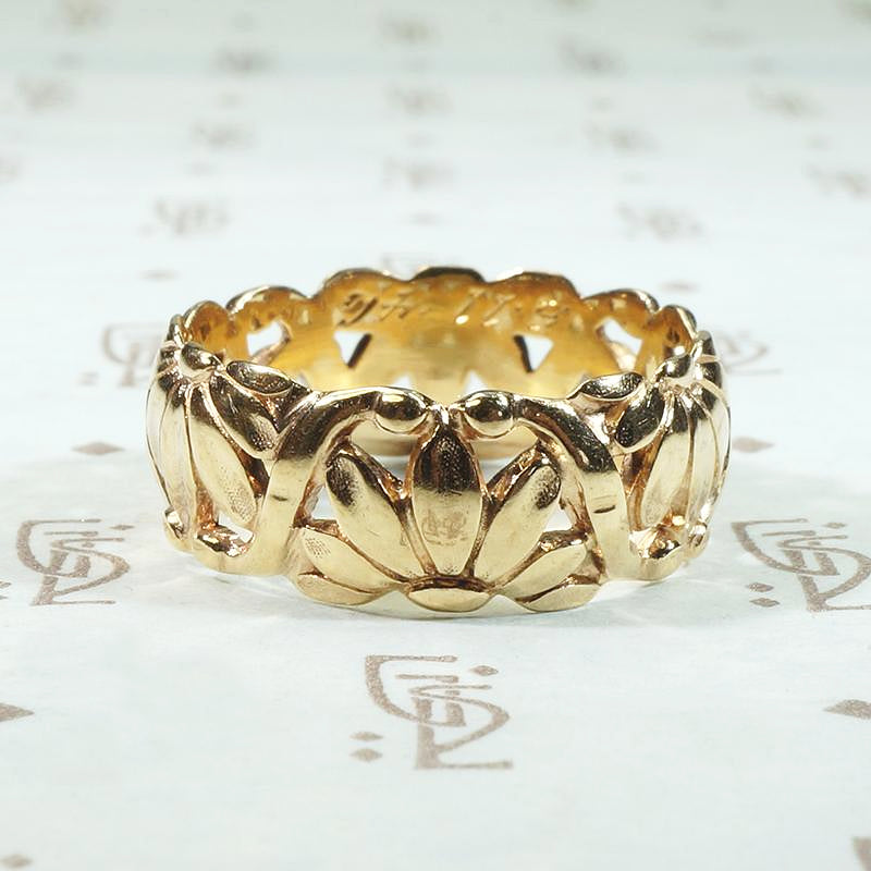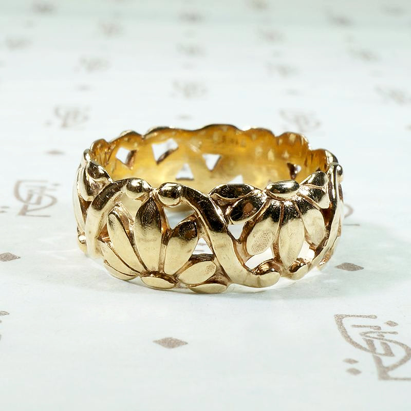This darling 14k gold band is sculpted into a ring of flowers. Gerbera daisies, perhaps, are shown in profile framed in curling leaves. The wide openwork band is sensitively modeled with depth and complexity. The interior of the band is engraved with the personal inscription "AVC-JLC 5-11-46." A truly special piece, it would make a dreamy commitment ring. Circa 1940.