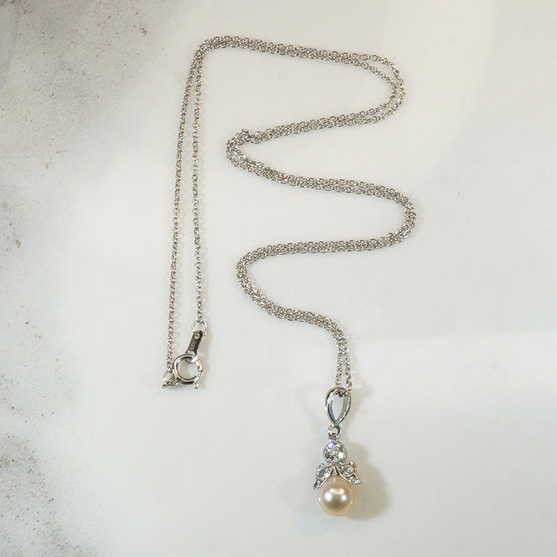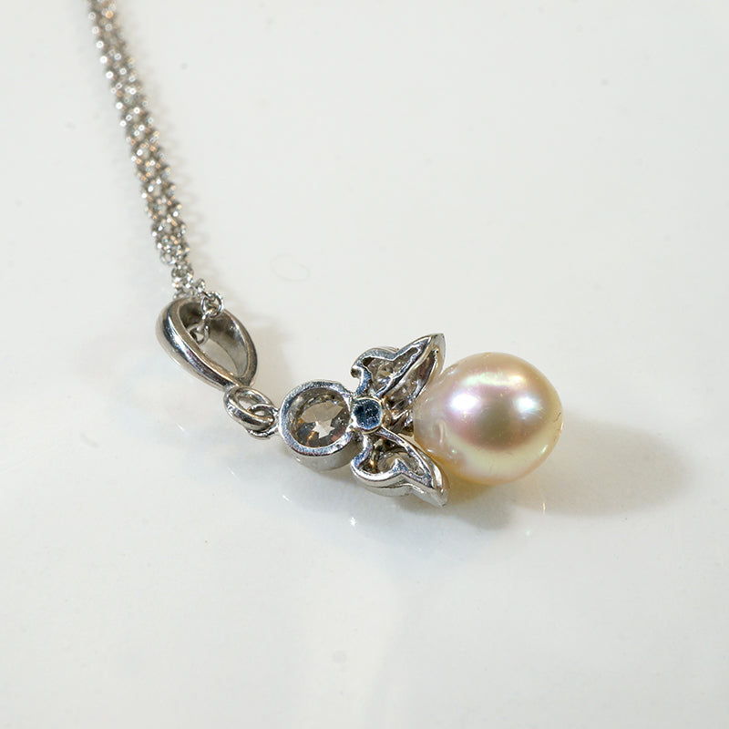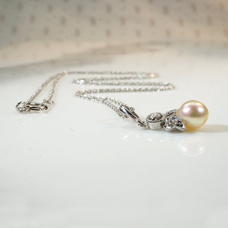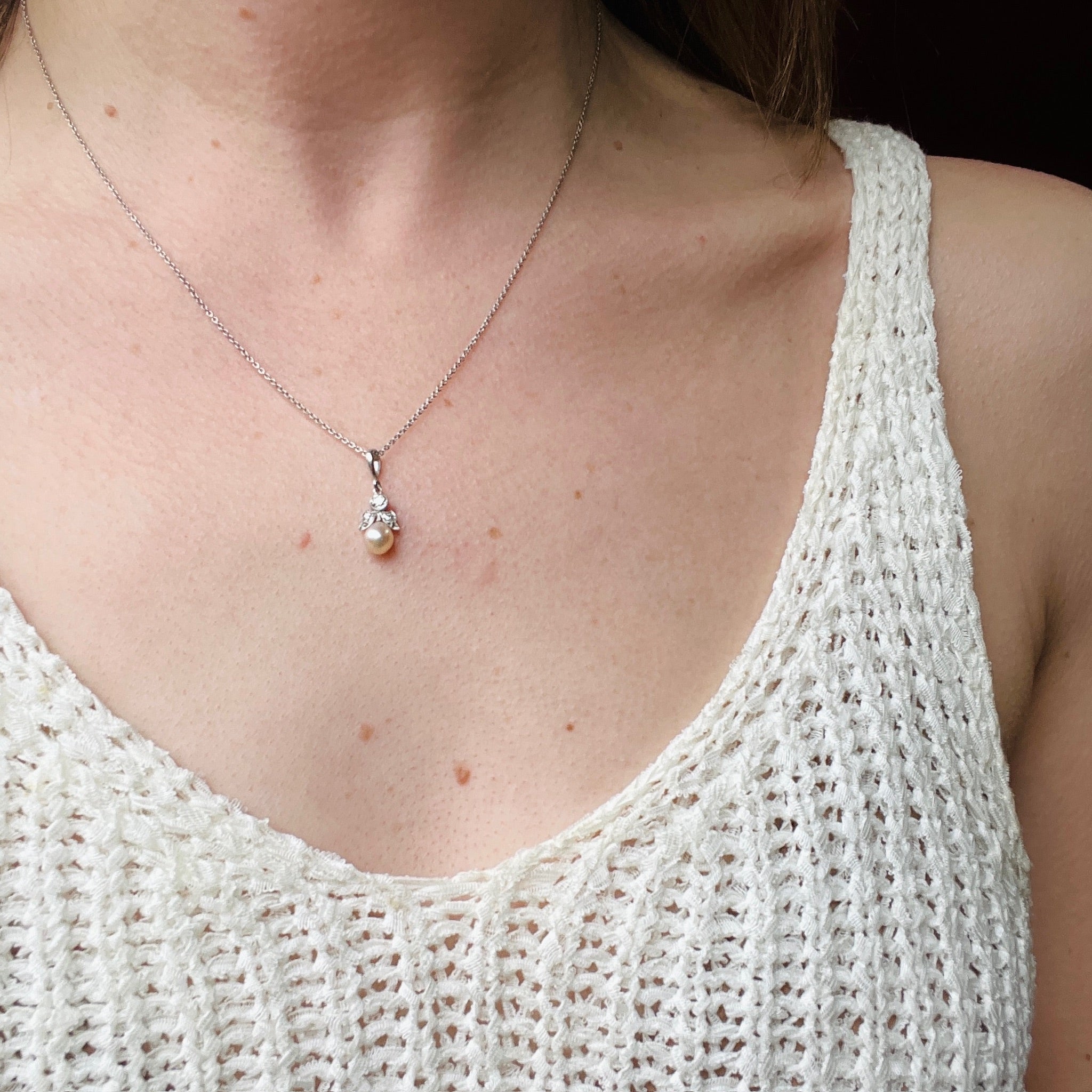 This darling turn of the 20th-century pendant is a little drop of Belle Epoch delight. A dreamy, creamy natural pearl topped by a little sprig of diamond-set leaves. The gems are set in icy platinum, engraved with milgrain engraving that glitters in the light like frost. The bright, sparkling old European cut diamonds have a total weight of .30cts. The dainty pendant hangs on an articulated bale from a modern platinum cable chain. Circa 1900.