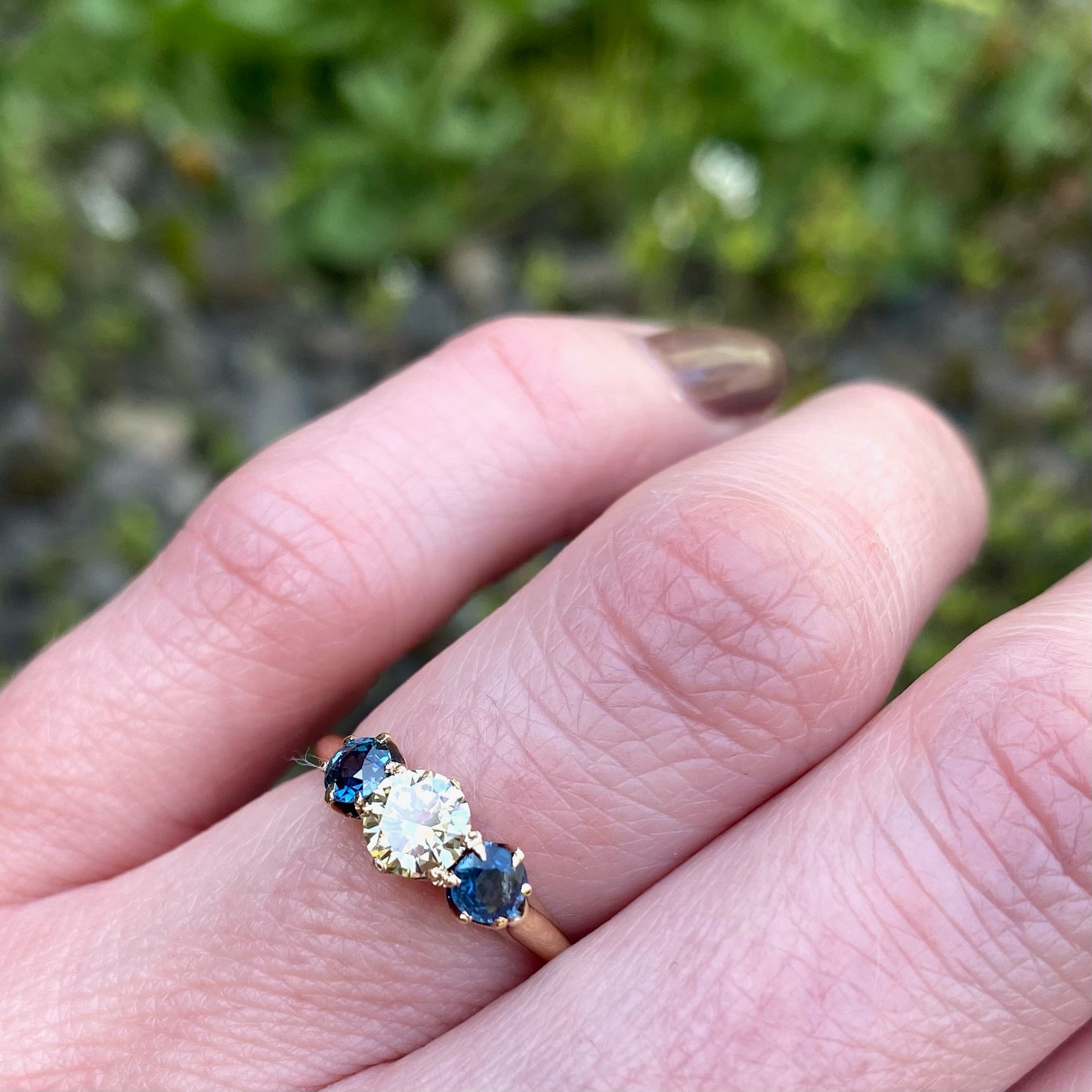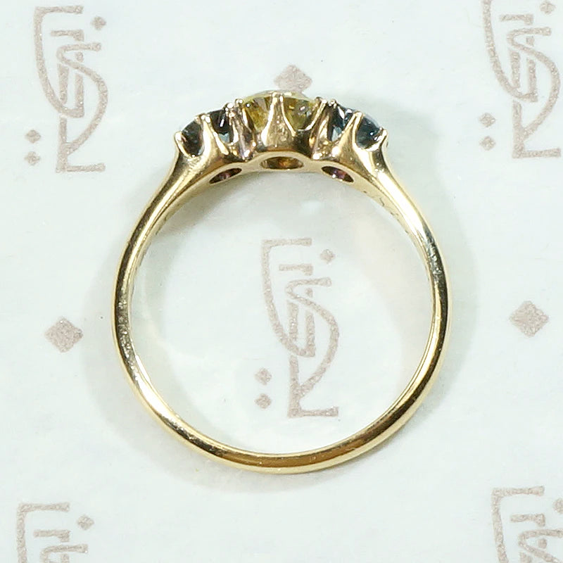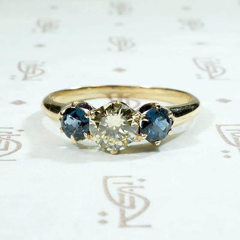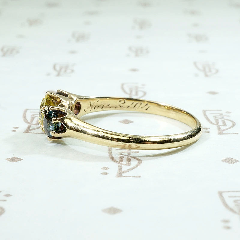 A brilliant fancy light yellow diamond dazzles in this wonderful antique three-stone ring. The diamond is prong set at the center of the ring and flanked by two dreamy sapphires. The natural yellow diamond and cornflower blue sapphires compliment each other deliciously, highlighting the rich color of each stone. The elegant 14k yellow gold setting is in a classic Turn of the 20th Century style, and it displays the gems beautifully. The interior of the band is hand engraved with the personal inscription "H to E Nov. 2/04." Circa 1900.