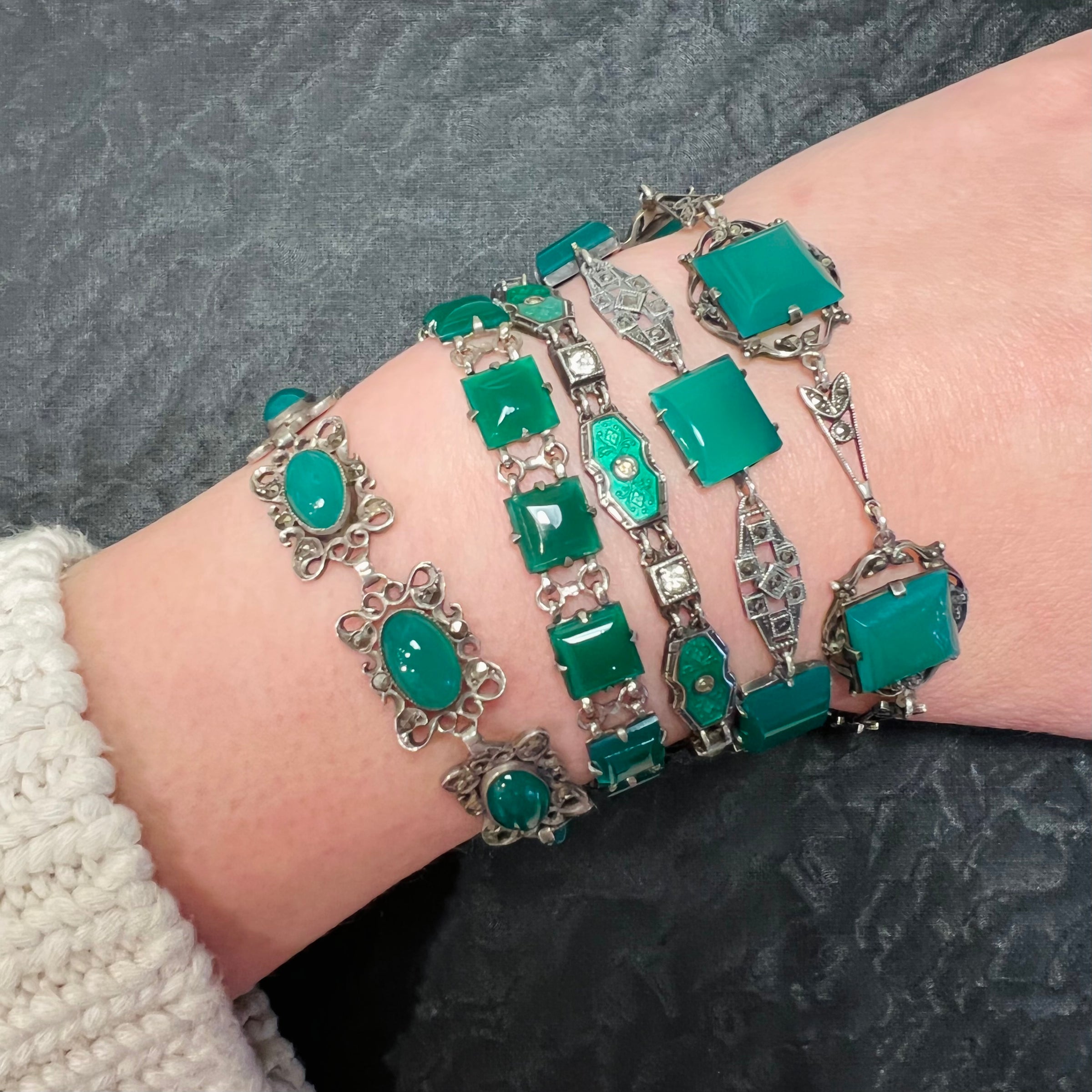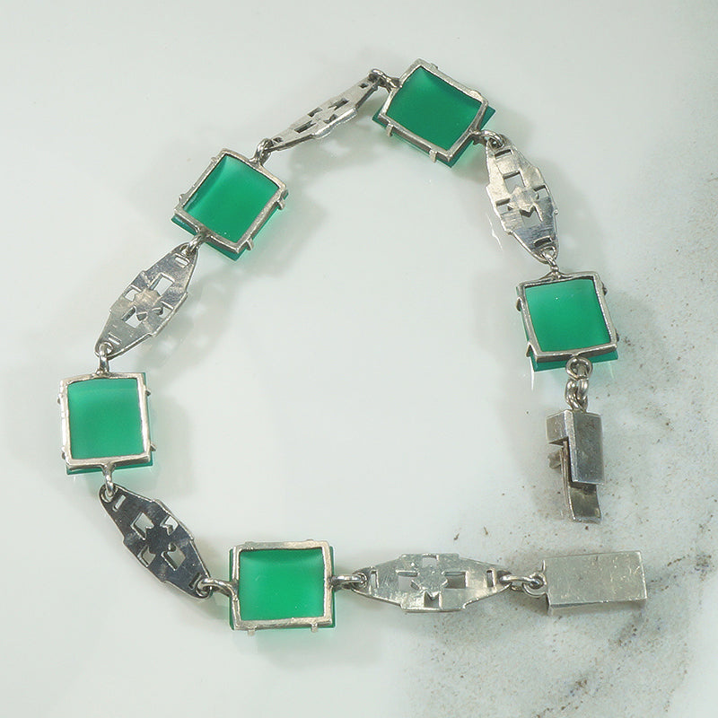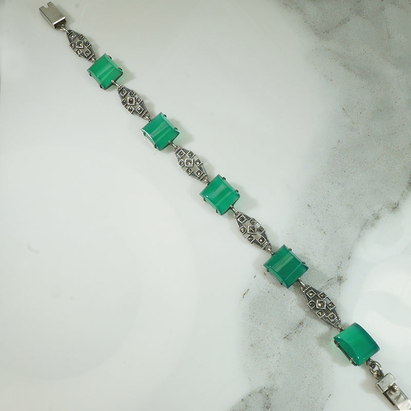 Set with brilliant green chrysoprase alternating with marcasite set links this sterling silver beauty dates from the 1920's.