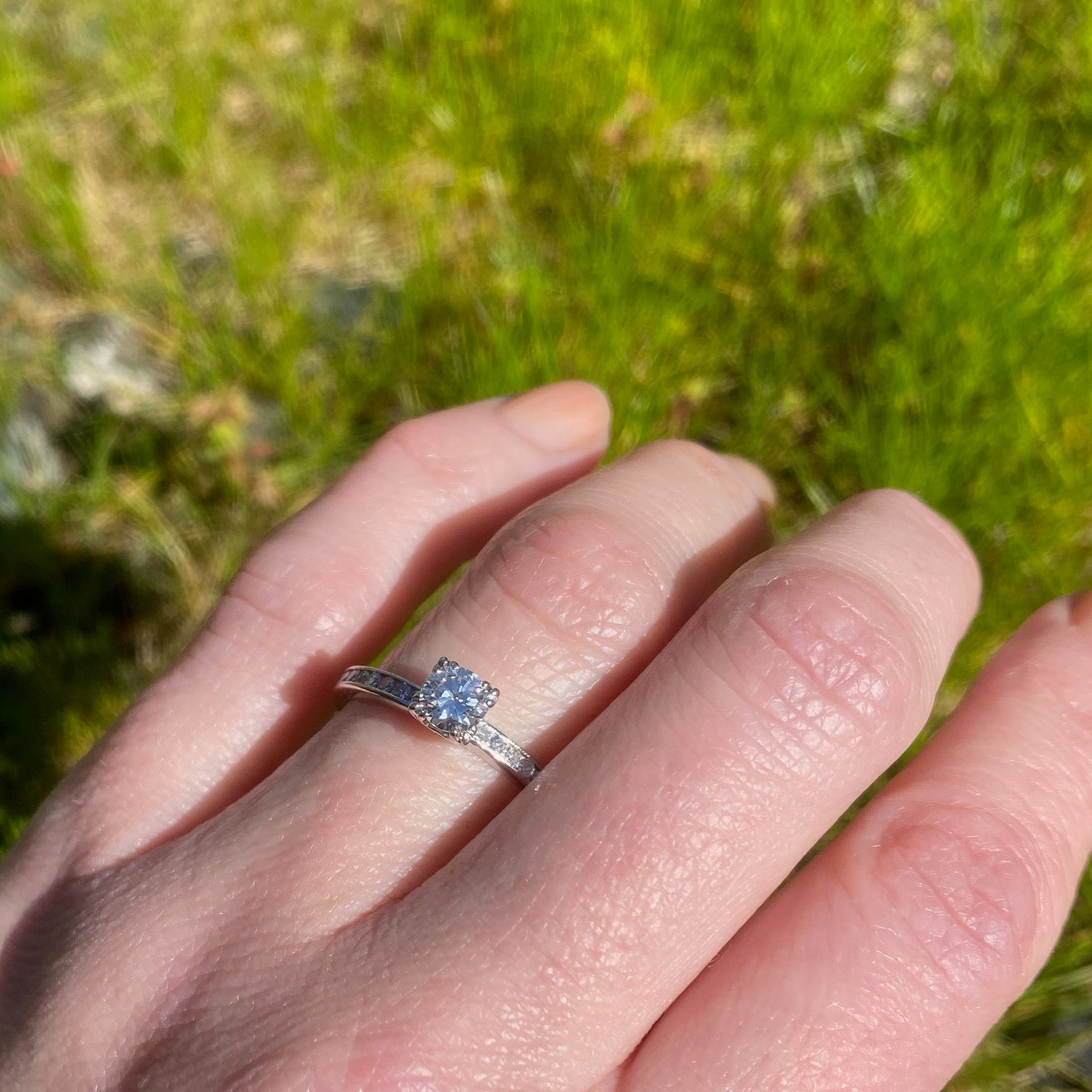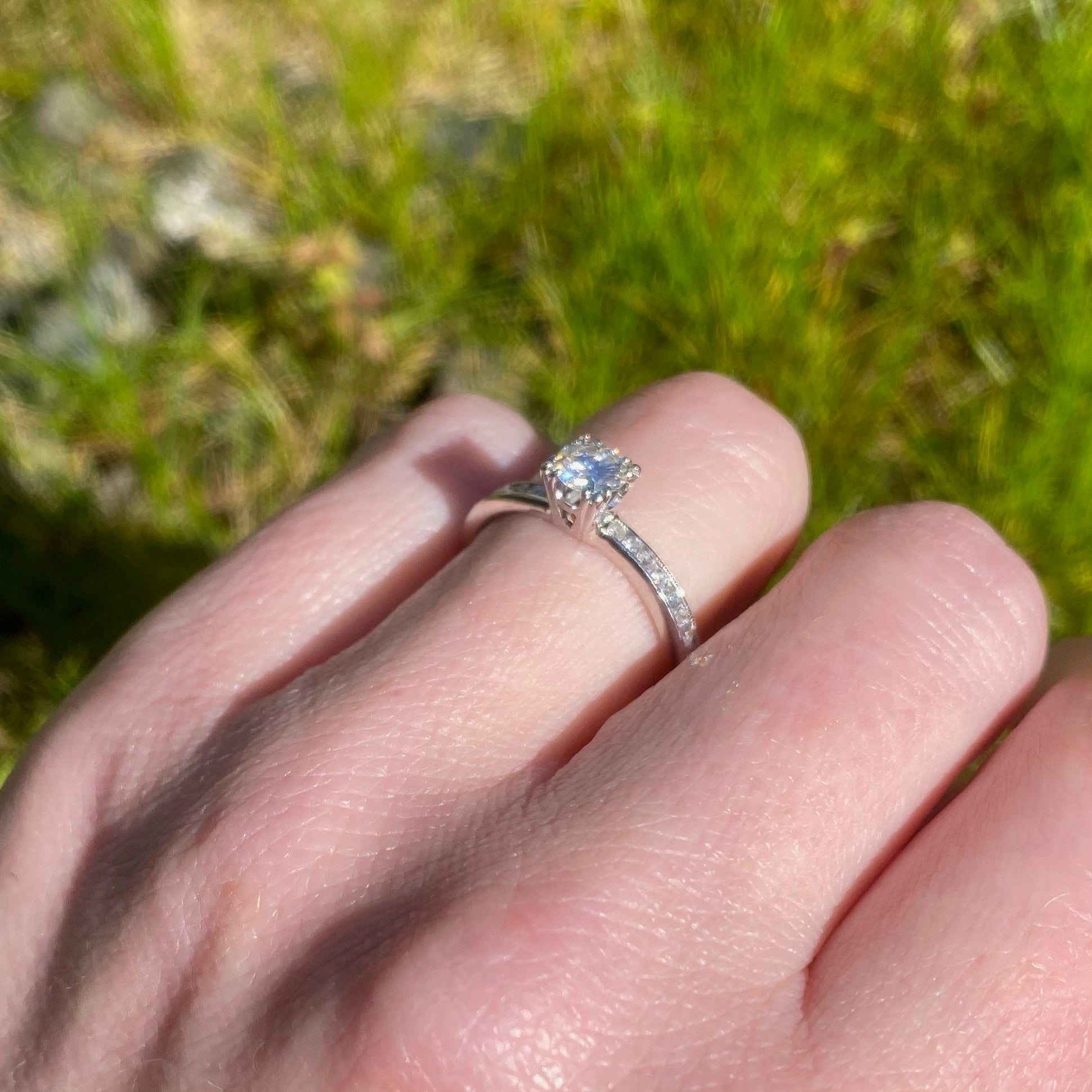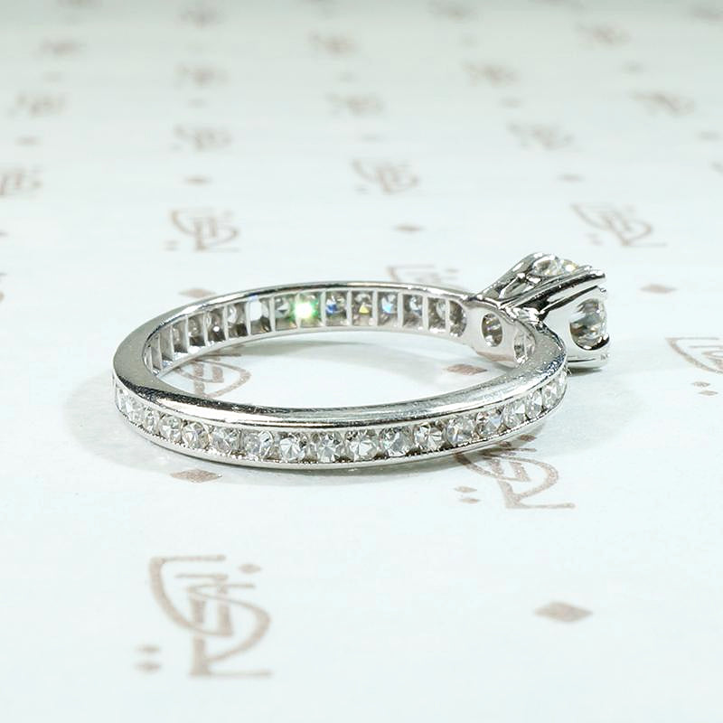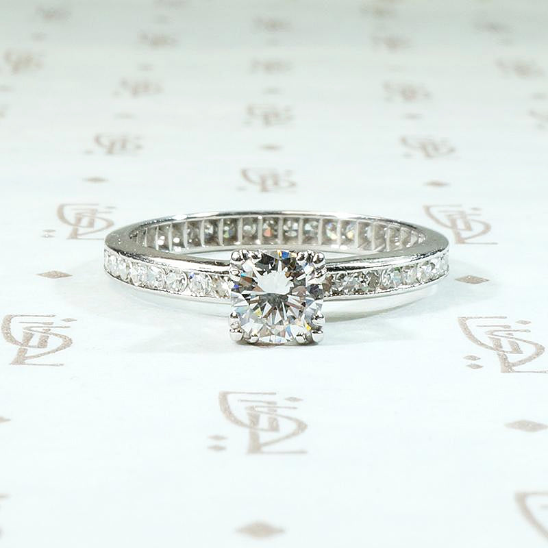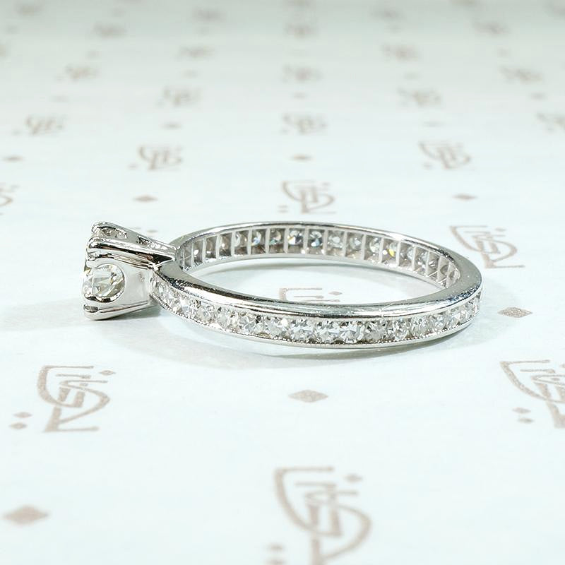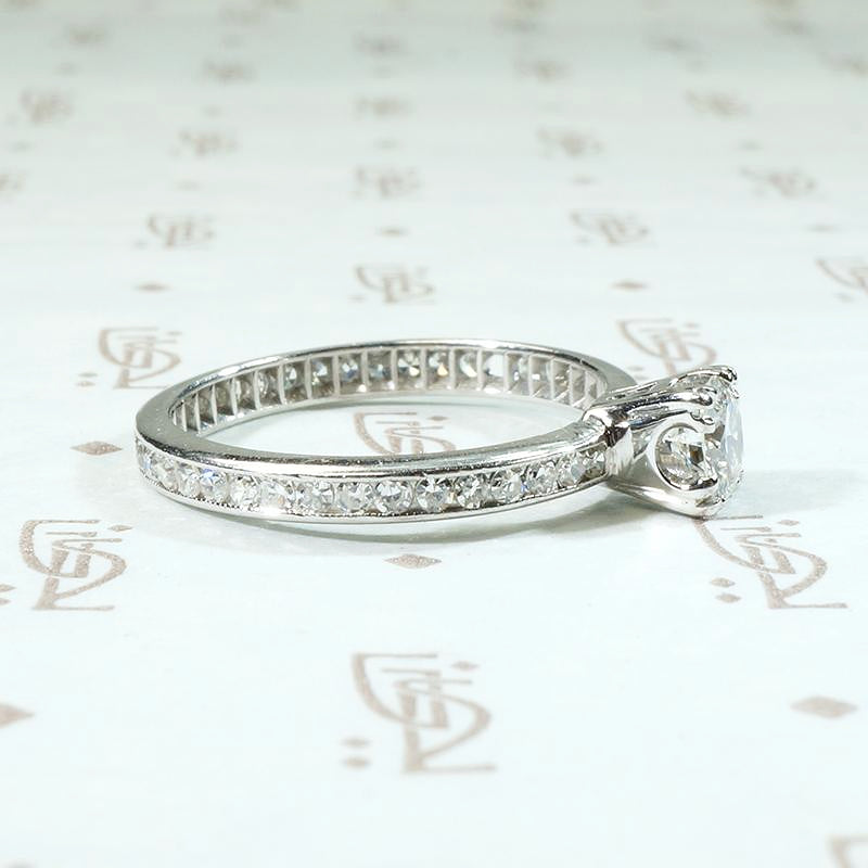 A beautiful vintage diamond engagement ring with an eternity band; classic, with fine Art Deco details. The bright, white center diamond is triple-prong set in a 14k white gold head. The beautiful band is platinum, entirely circled with pretty little channel set diamonds. There is subtle milgrain detail along the channels and the inside of the band displays delicate ajouring. An absolutely lovely and timeless piece. Circa 1930.