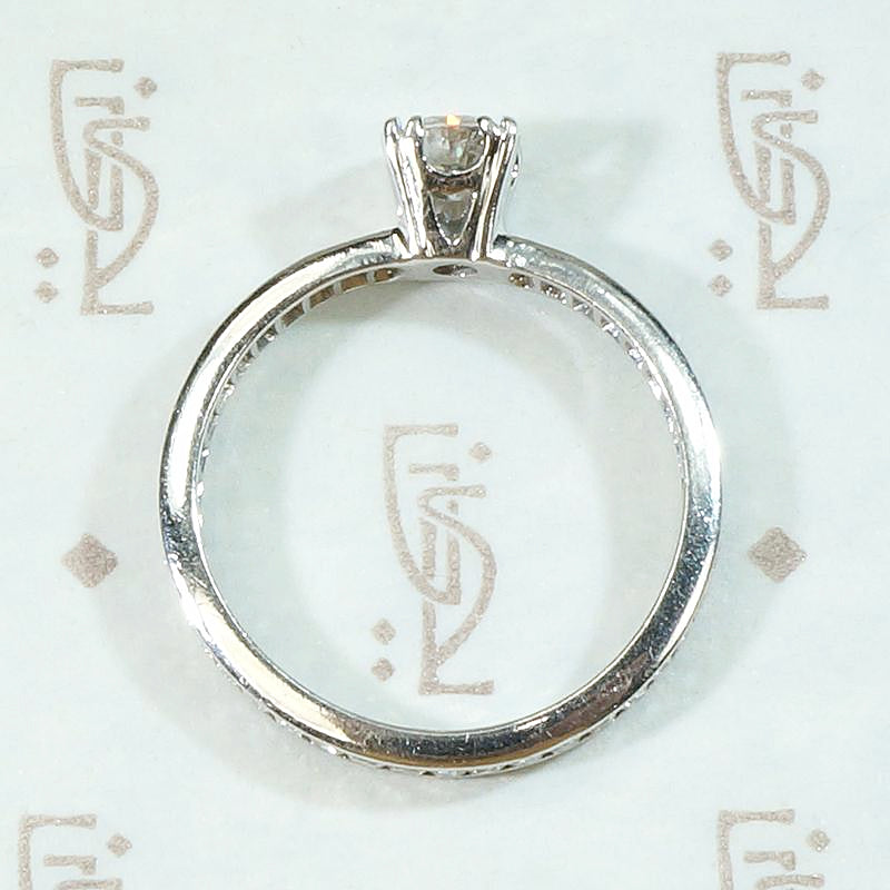 Diamond Details.....The center diamond is 0.44ct transitional round brilliant-cut with VS2 clarity and F/G color. The band is set with 40 round single-cut accent diamonds with a 0.60tcw.