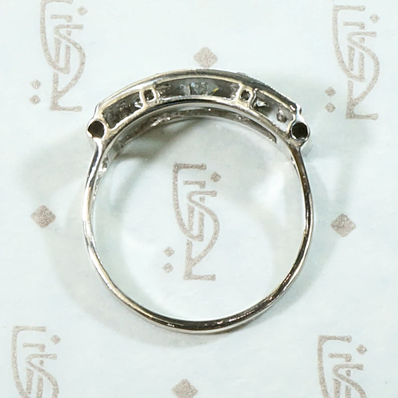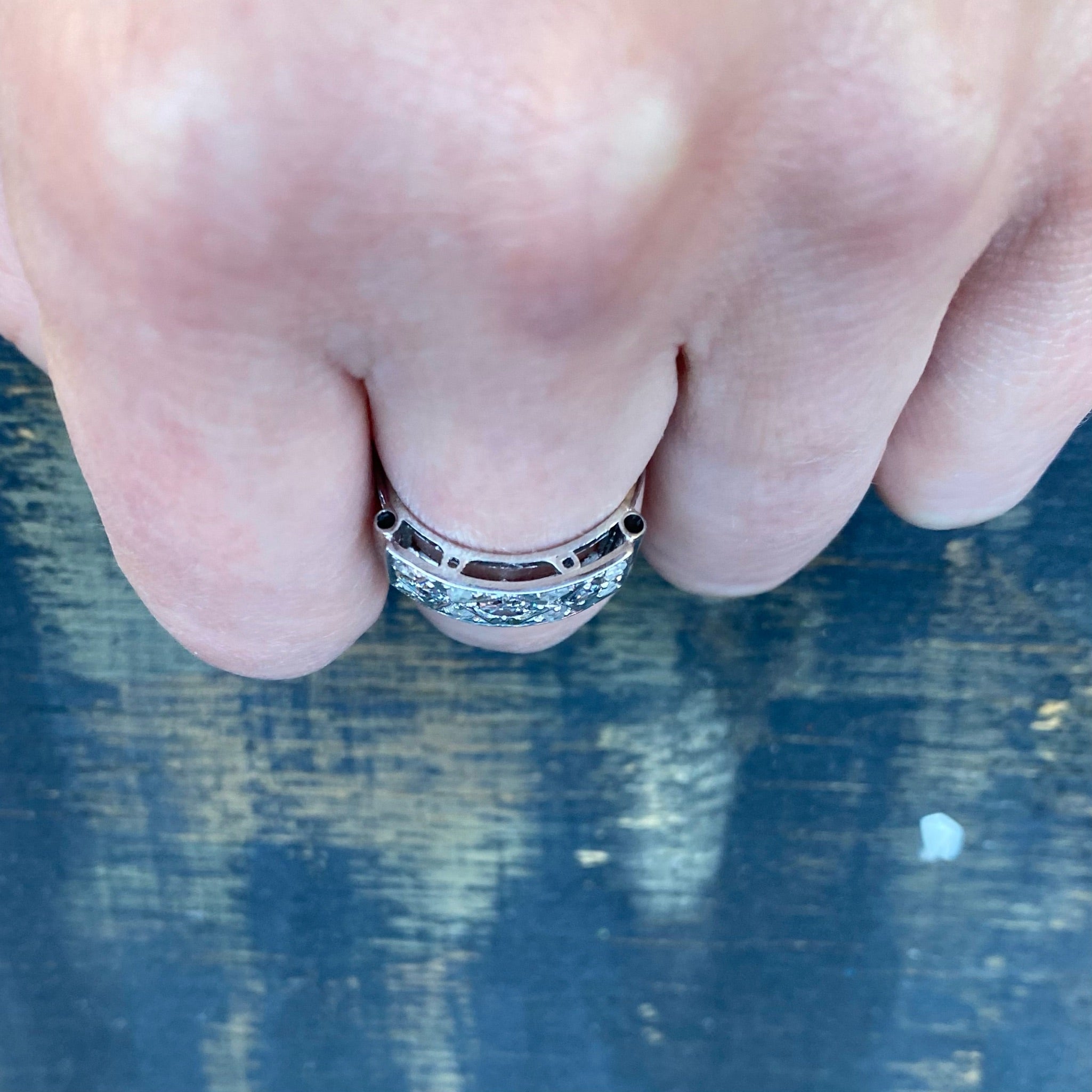 This very pretty Art Deco ring features a mix of rose and old mine cut diamonds set in a heavily decorated panel. Three old mine and eight rose cut diamonds are set across the east/west oriented 12k white gold panel. Each diamond is set in its own prettily-shaped compartment outlined in milgrain detail. The curved panel sits above split shoulders that taper back to a double band. This is a terrific option for a combination engagement ring and wedding band, or a great right hand ring. Circa 1920.