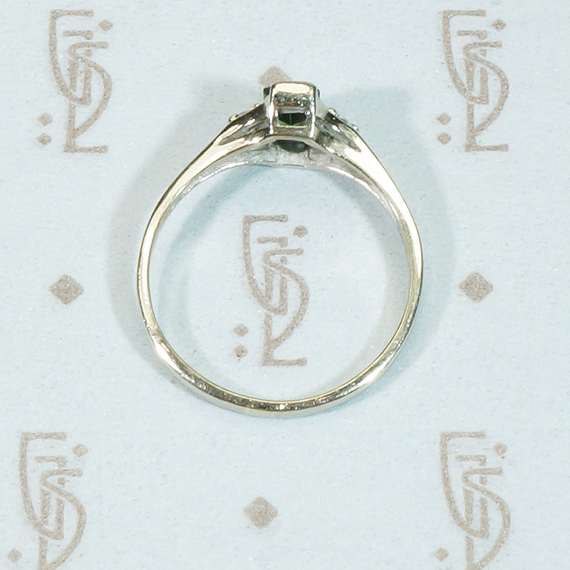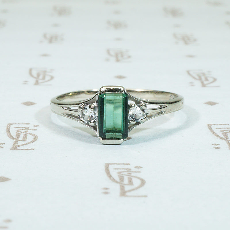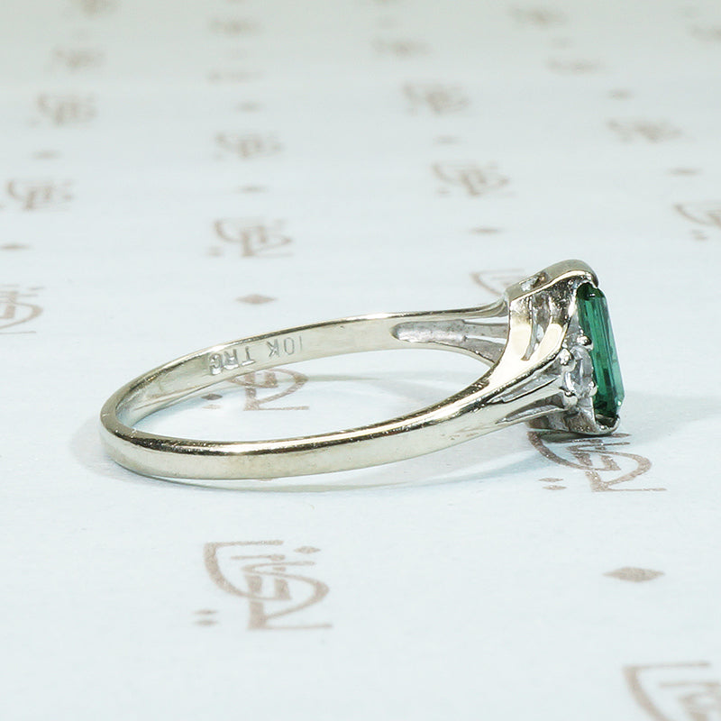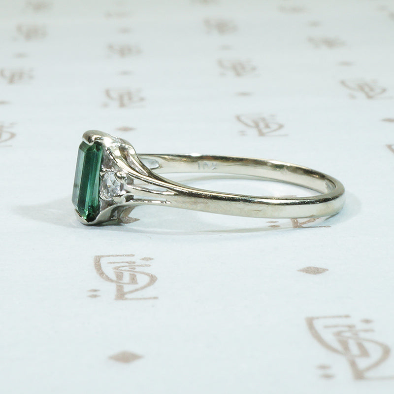 This little emerald cut forest green Tourmaline is set between tiny white sapphire gems. The setting is 10k white gold circa 1960 and would make a lovely alternative to a conventional engagement ring.