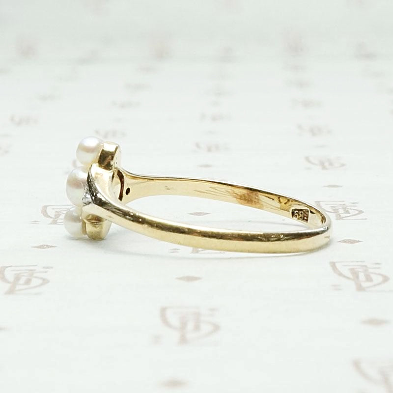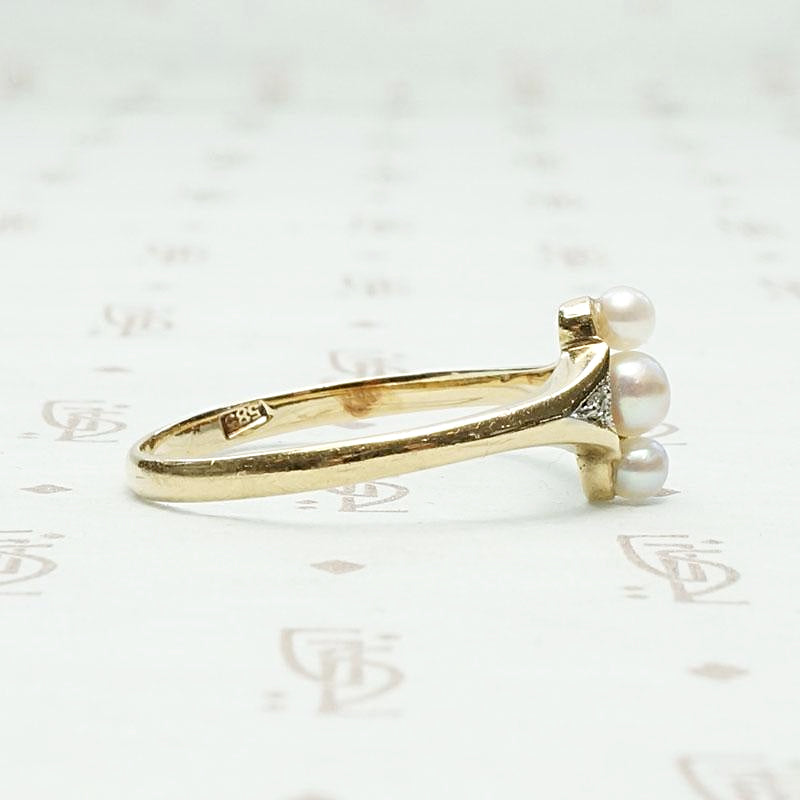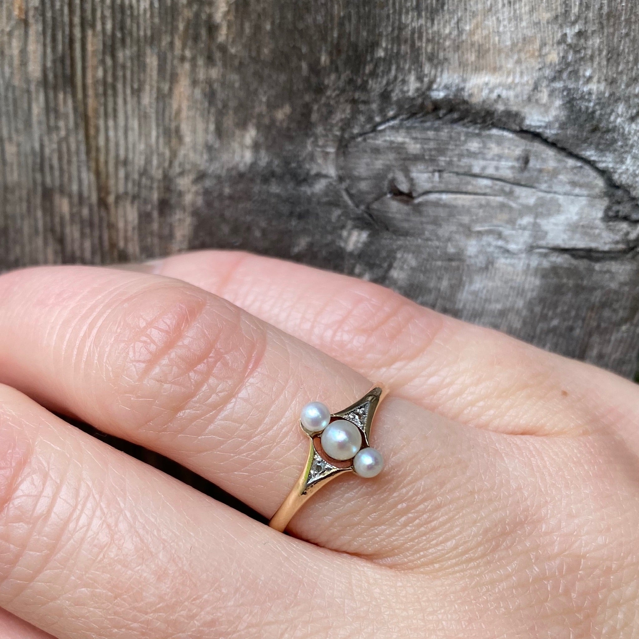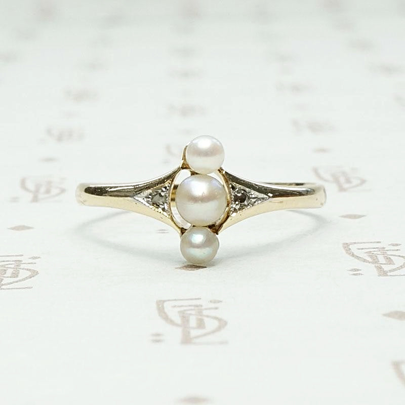 This turn of the 20th century ring is delicate and dainty. Three lustrous pearls are set vertically down the center of this 14k gold ring. The pearls are flanked by two tiny rose cut diamonds set in triangular insets. The shoulders taper gracefully into a slim band. The cool tones of the pearls and glittery diamonds coupled with the sleek lines of the setting create a serene composition. So elegant. Circa 1900.