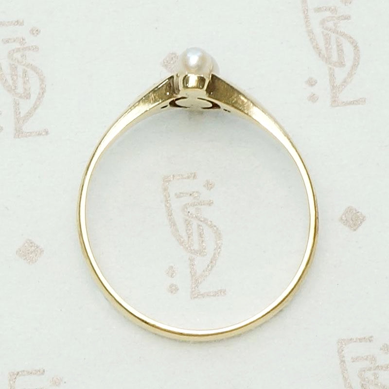 Details.....Currently a size 7.25, we can size this ring for no charge. The pearl set front measures 0.34" wide and the back of the band measures 1.9mm wide. In Very Good Antique condition. You should always expect some wear on your vintage and antique jewels, we consider it part of the charm.