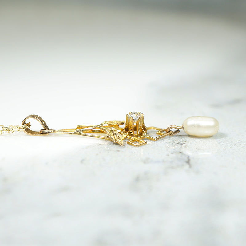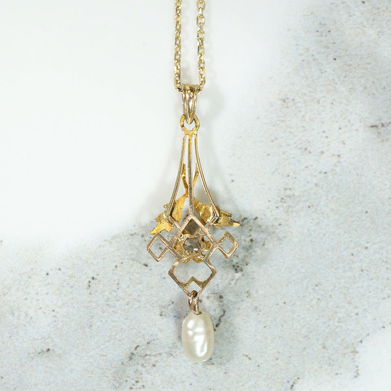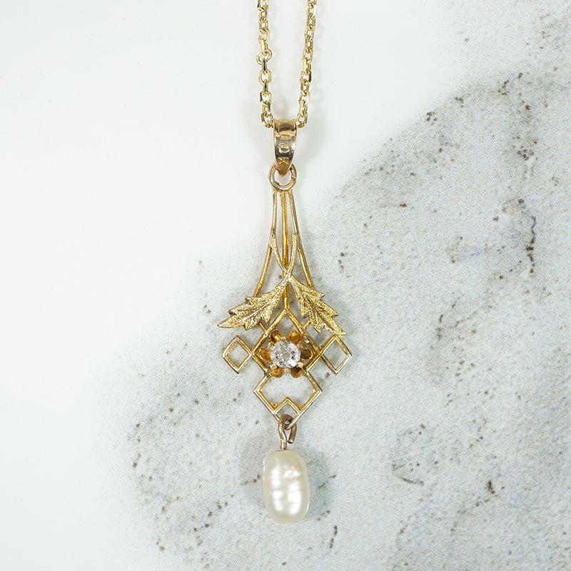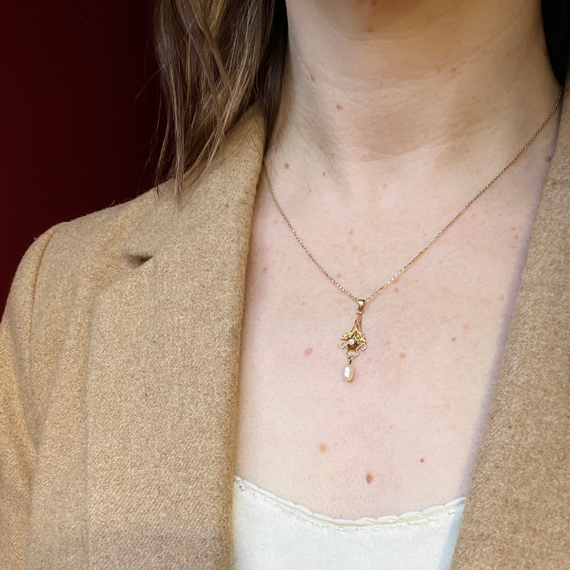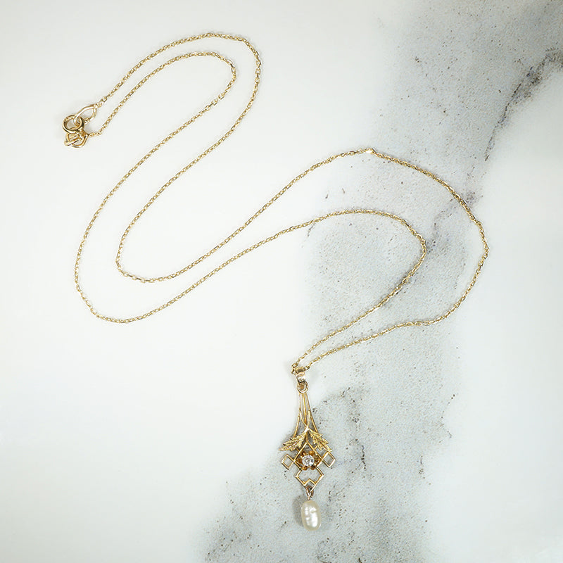 The lavalier pendant is a dainty, feminine fashion that was quite popular at the turn of the 20th Century. This 10k yellow gold lavalier is set with a wee diamond in a buttercup setting and features engraved leaves and delicate gold line work. A dreamy river pearl dangles from the pendant's base. The piece is enhanced with a warm patina and an exquisite, glittering texture. The pendant hangs on a modern 14k gold cable chain. Circa 1910.