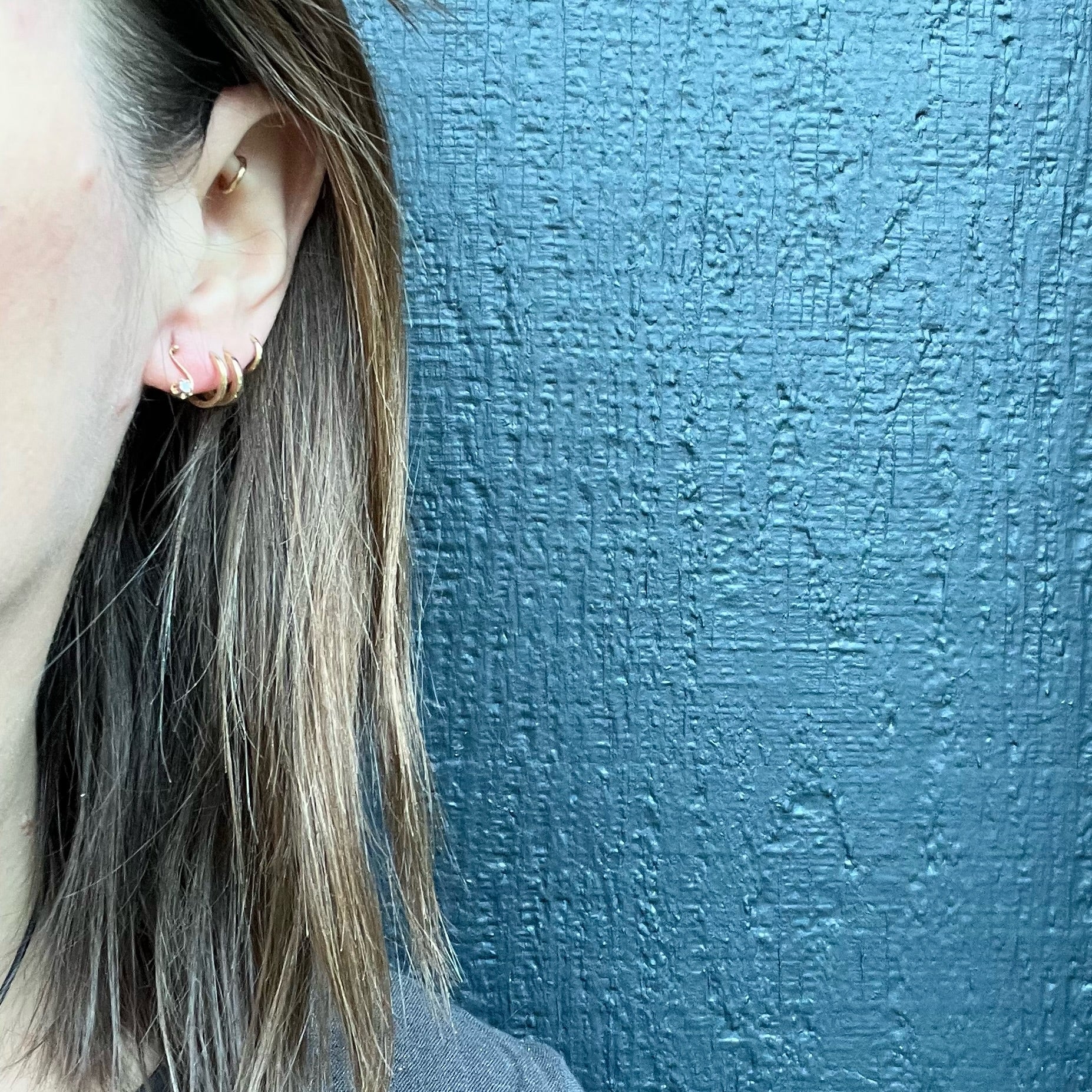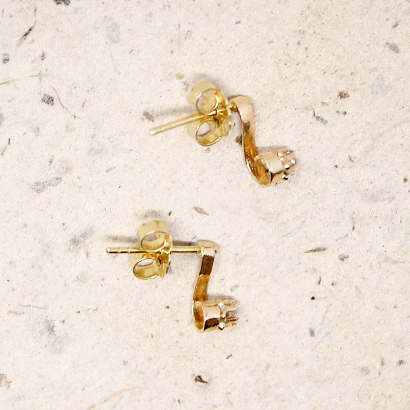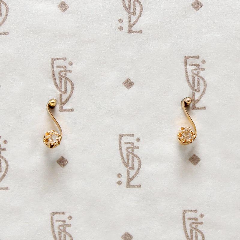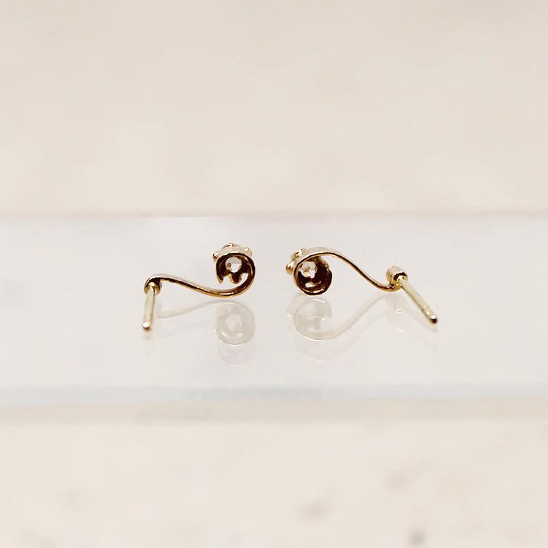 Delicate stud earrings, with a wisp of diamond-set gold shaped like a tiny musical note. Dainty scrolls of 18k rosy gold are each set with a spark of rose cut diamond. The decorative front of the studs date to the late Victorian era, the posts and backs are a 14k yellow gold modern edition. Circa 1890.