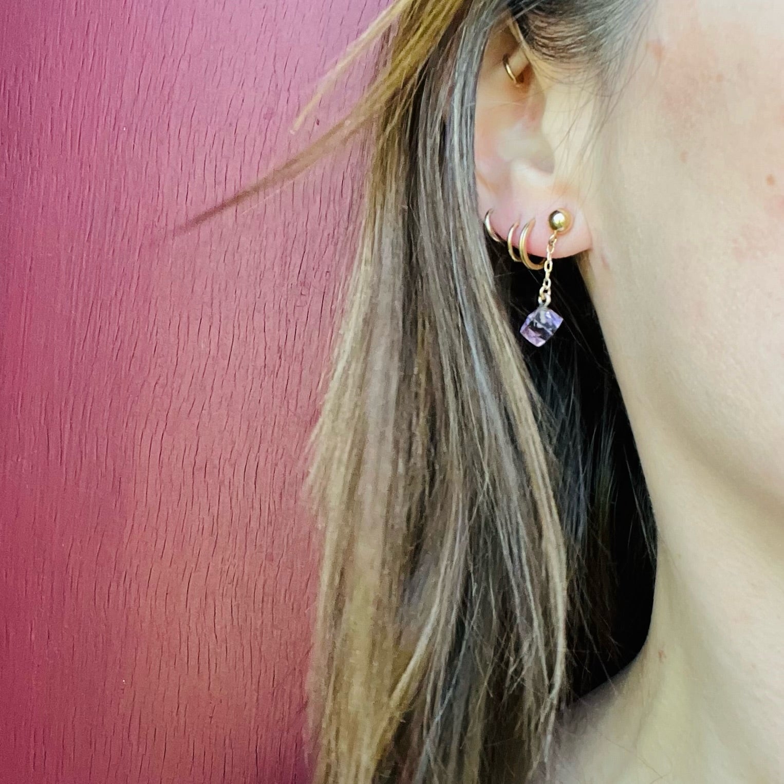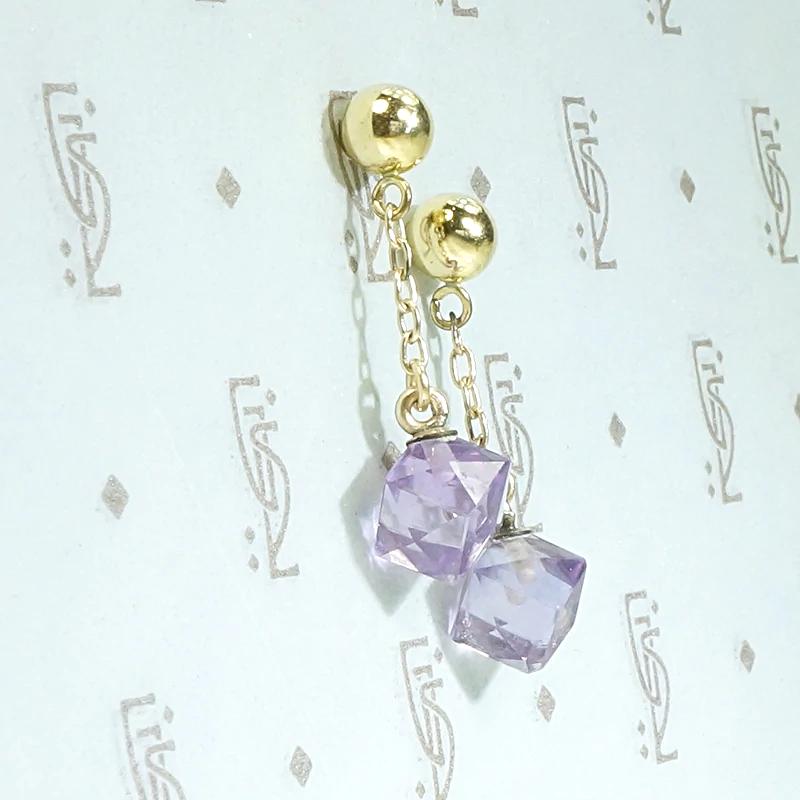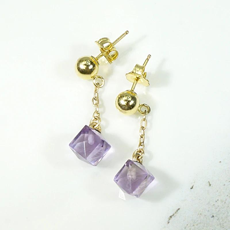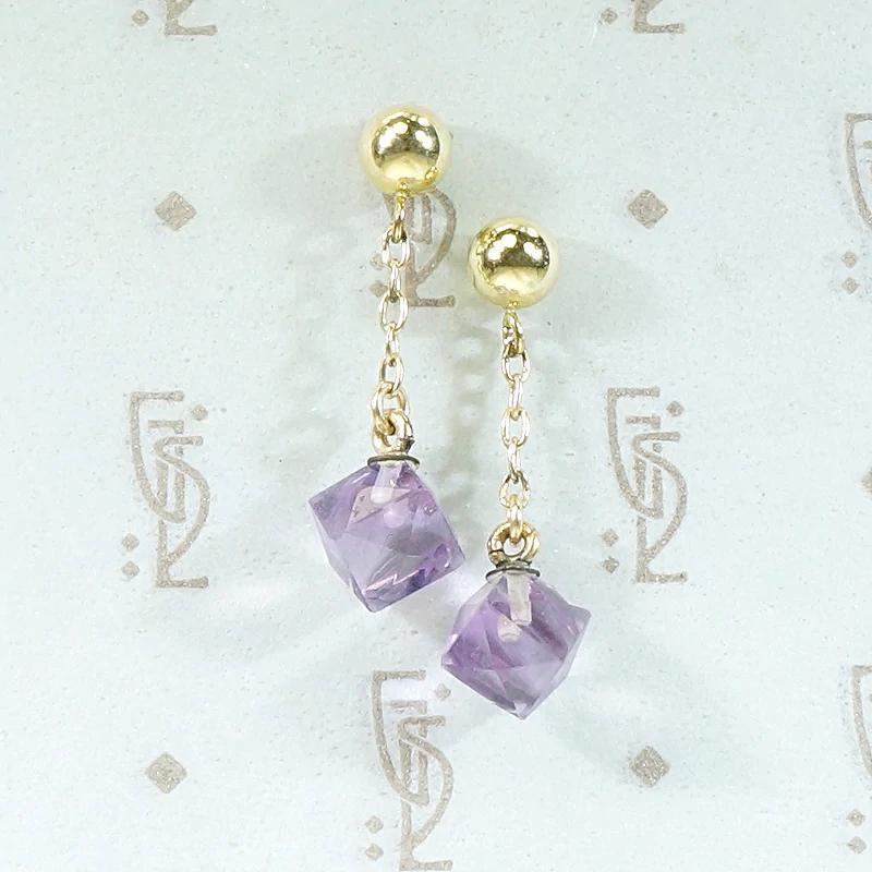 Delicate drop earrings of pale lavender amethyst and 14k yellow gold. Such tender springtime hues. The earring tops are classic gold ball posts. Faceted amethyst cubes swing from the posts on fine gold chains. So sweet, the perfect gift for a February baby. Circa 1960.