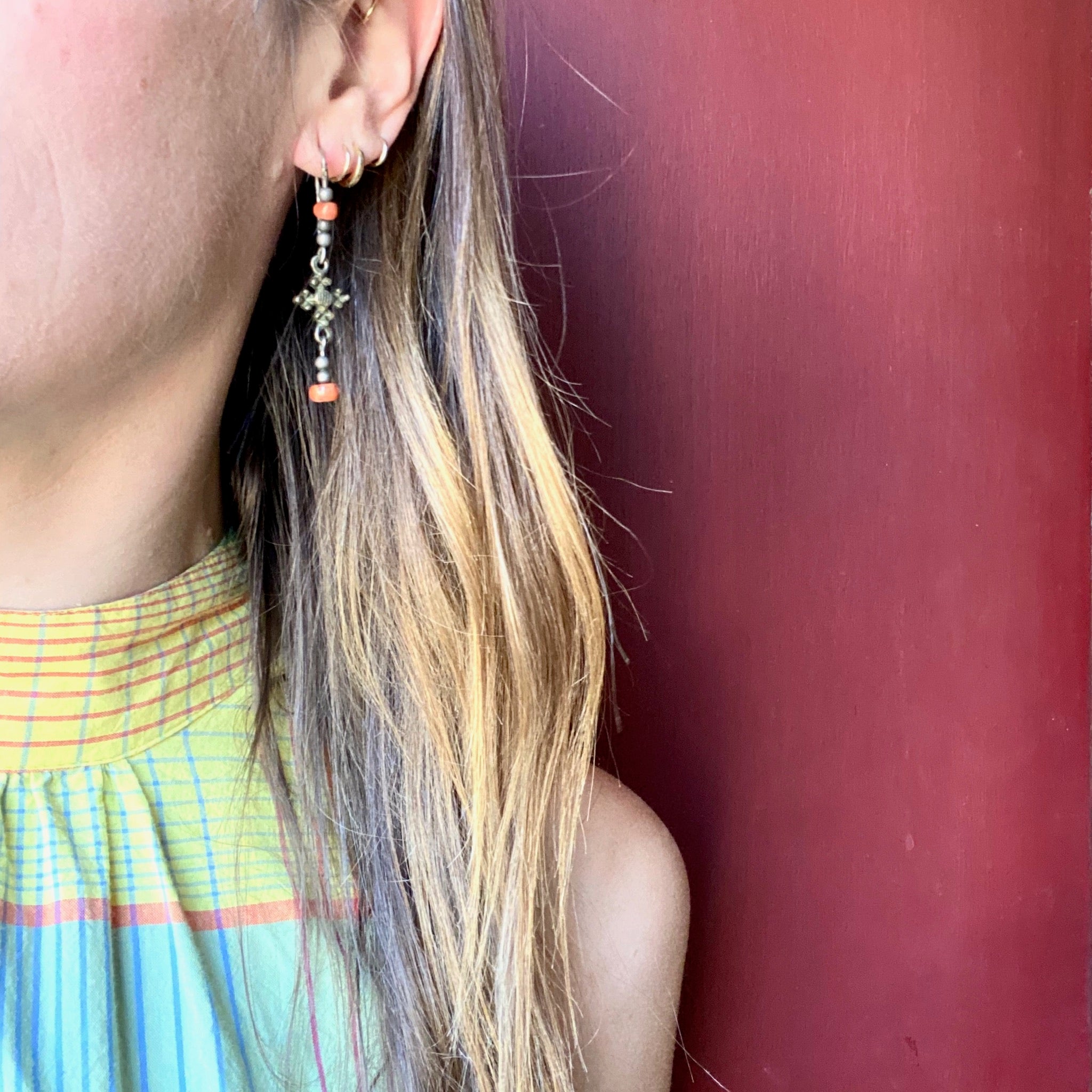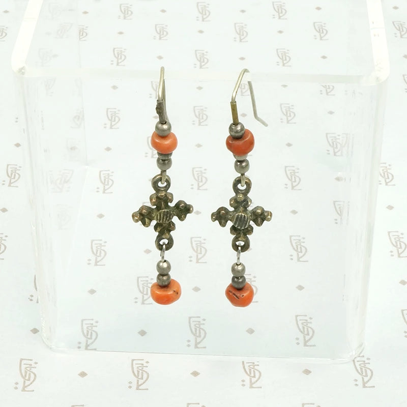 Delicate Ethiopian earrings in hand cast brass and low grade silver with antique coral beads. They have lovely texture and movement. These earrings will be a perfect compliment to your favorite boho summer dresses. Circa 1960.