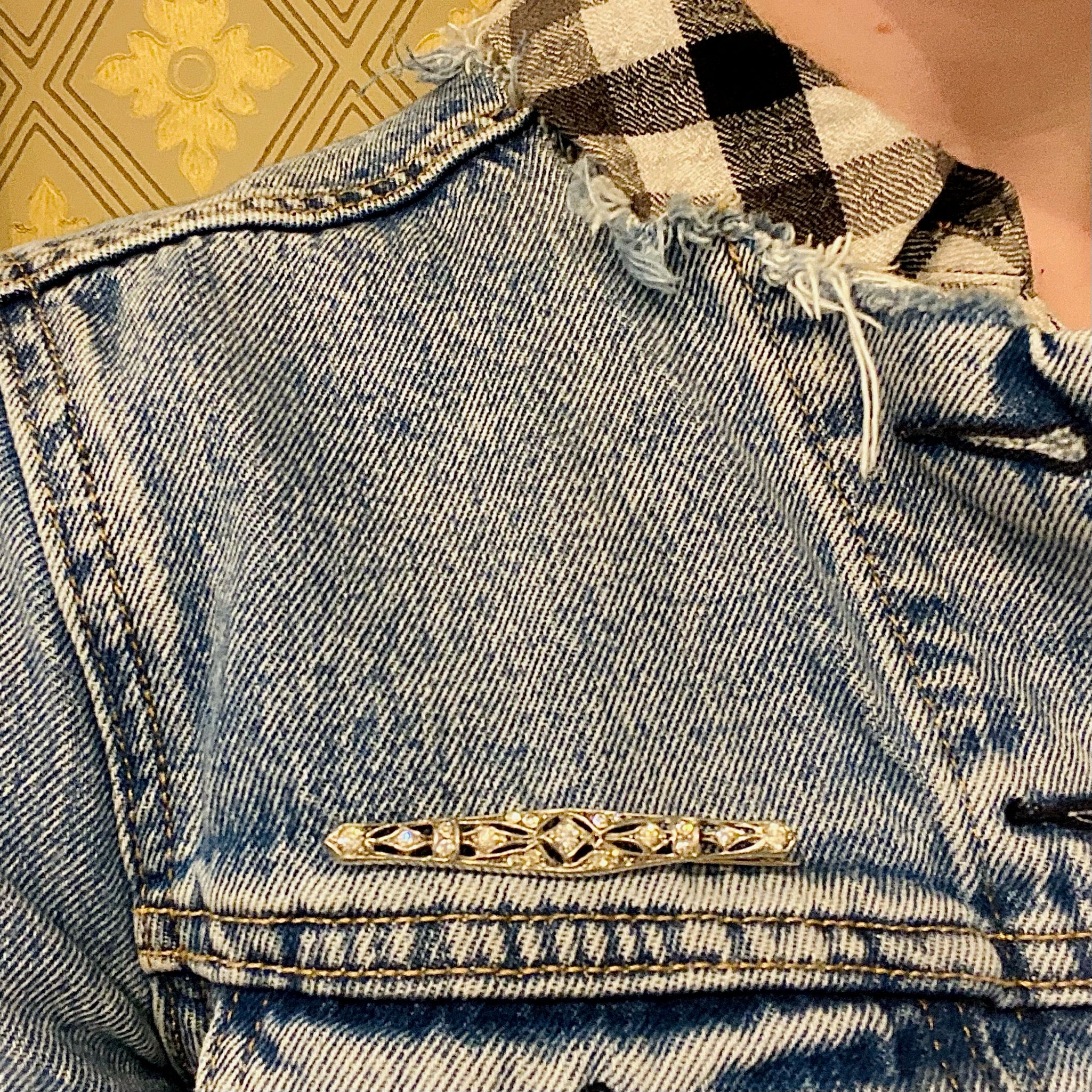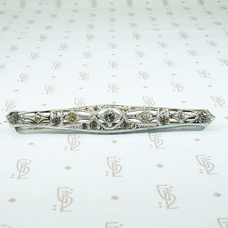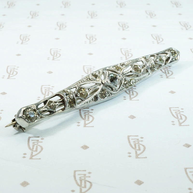 A beautiful antique bar pin, delicately wrought in sterling silver and set with glittering white paste stones. This slim pin would add a note of lovely sparkle to your wedding dress, and a clever hair dresser could easily work it into your updo. Circa 1900.