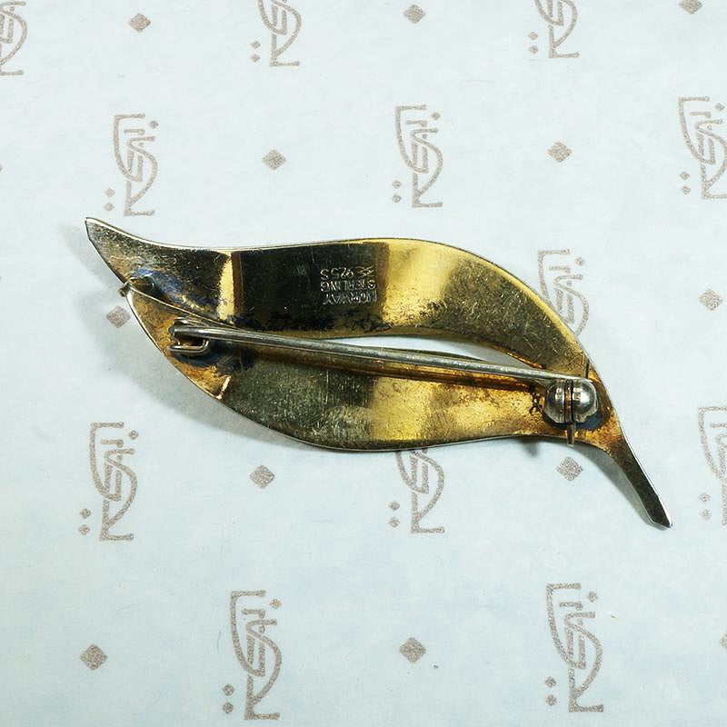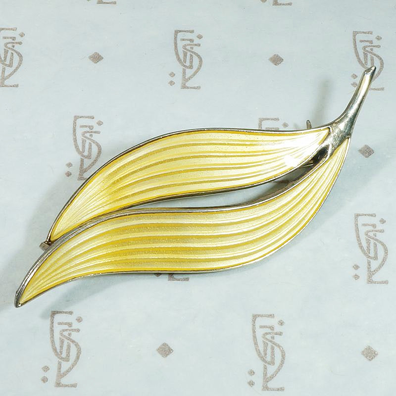 This beautiful enamel and sterling silver brooch was made in Norway during the World War II era. Two stylized leaves of delicate yellow guilloché enamel form this elegant pin, the perfect accessory to your Autumn jacket. The back of this piece bears Aksel Holmsen's makers mark. Circa 1940.