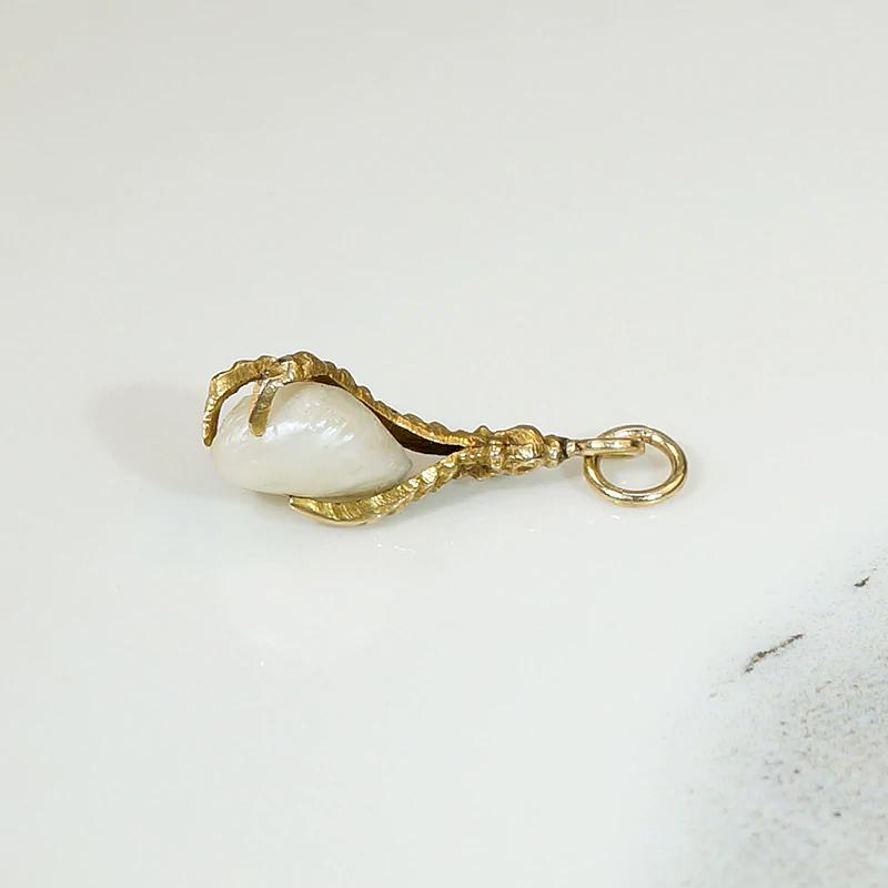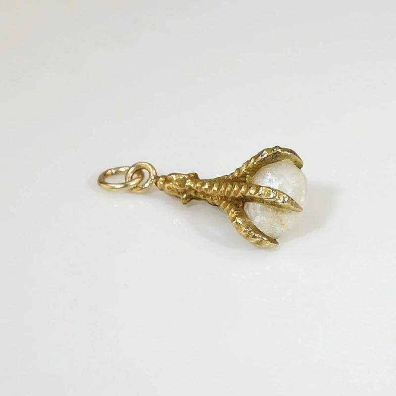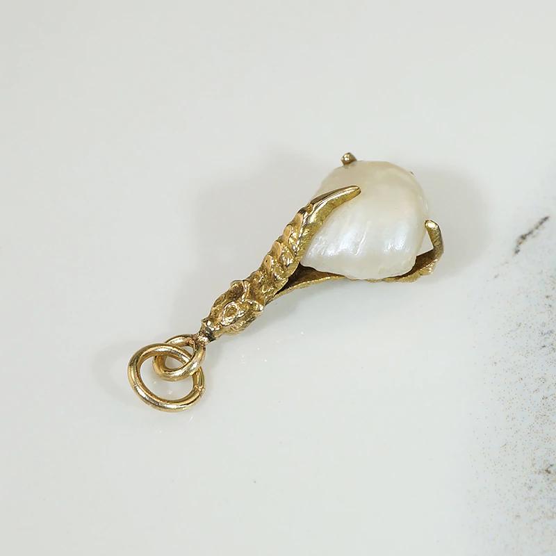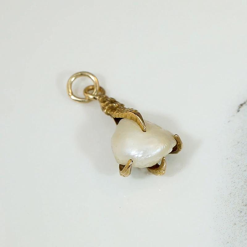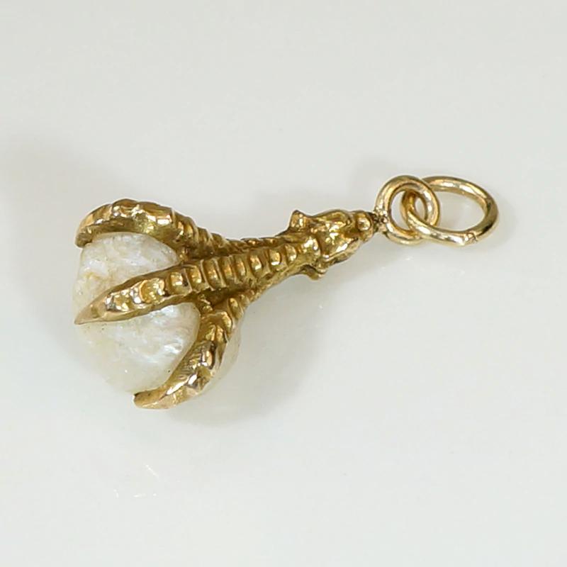 Deliciously macabre, this luxe and witchy charm is in the form of a severed bird claw clutching a baroque pearl. The 12k gold claw is sculpted in three naturalistic dimensions, with incredible texture and detail. The baroque pearl is creamy white with subtly iridescent nacre. This talisman has an integrated bale with an added jump ring; wear it on one of our Ancient Influences married chains for maximum fascination. Circa 1860.