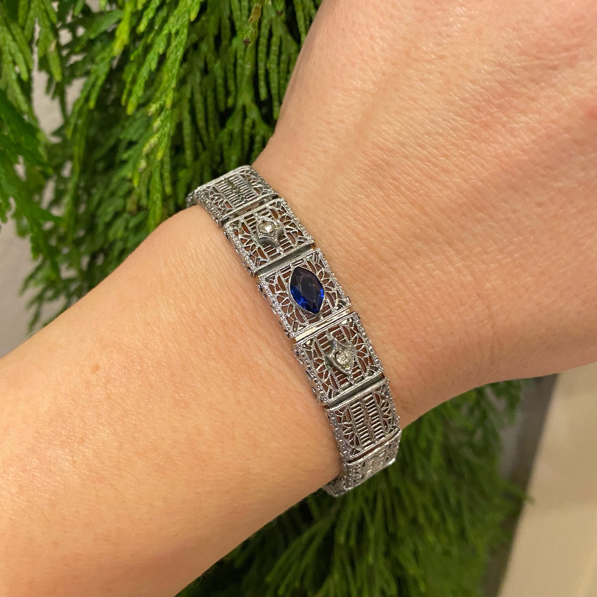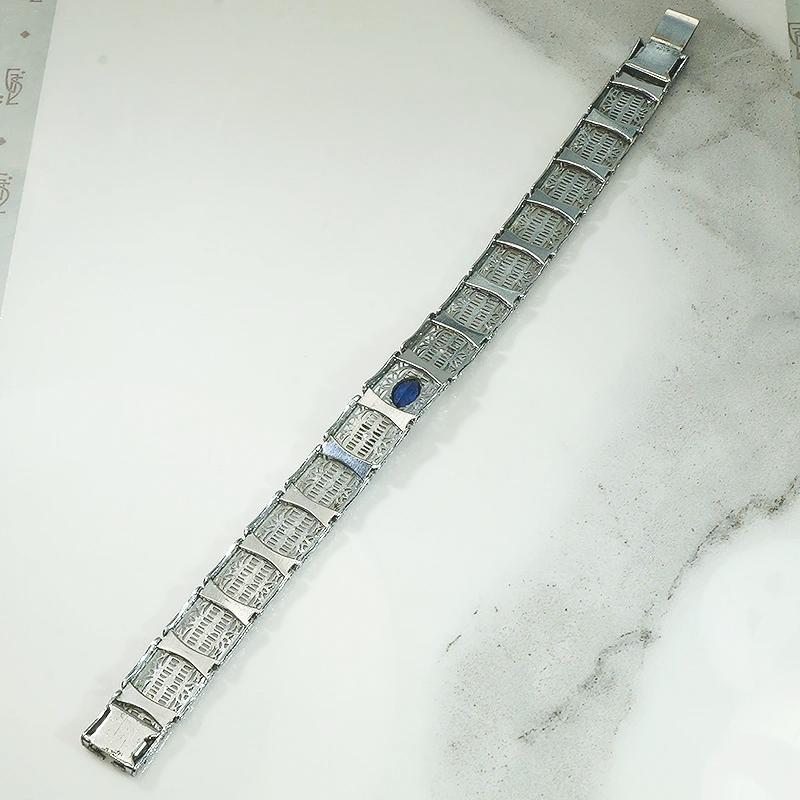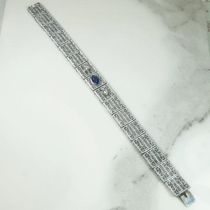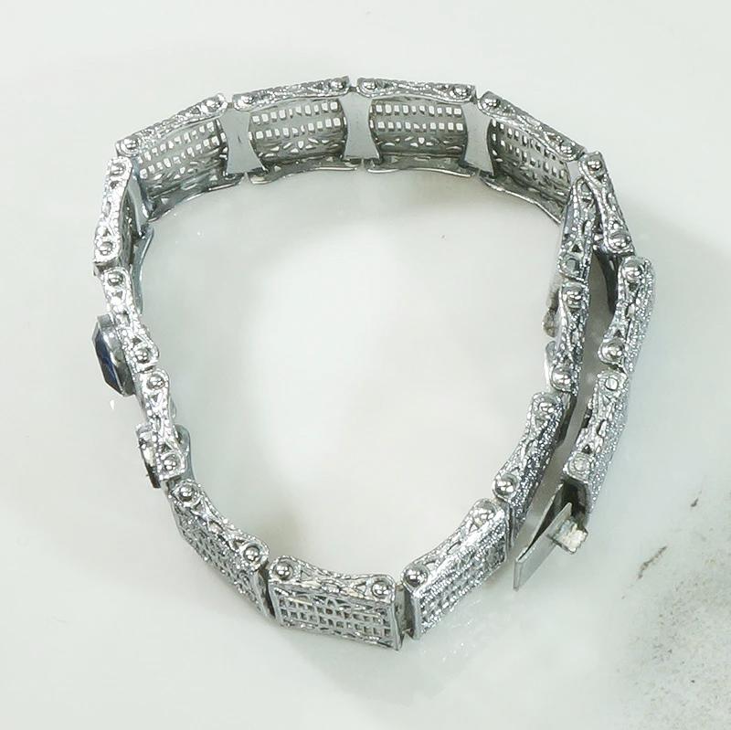 One of the things I love about Chrome Art Deco filigree is that the details are as lovely as the White Gold versions. This one is set with a dark blue glass flanked by clear glass stones that have darkened slightly. Circa 1920.