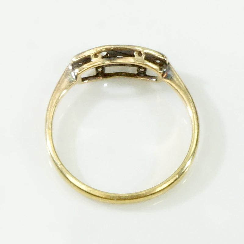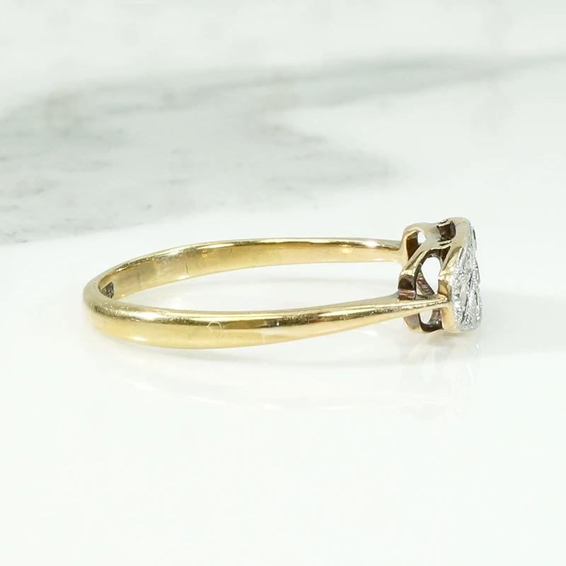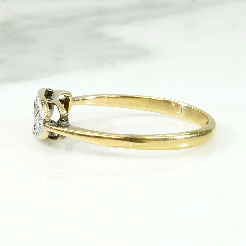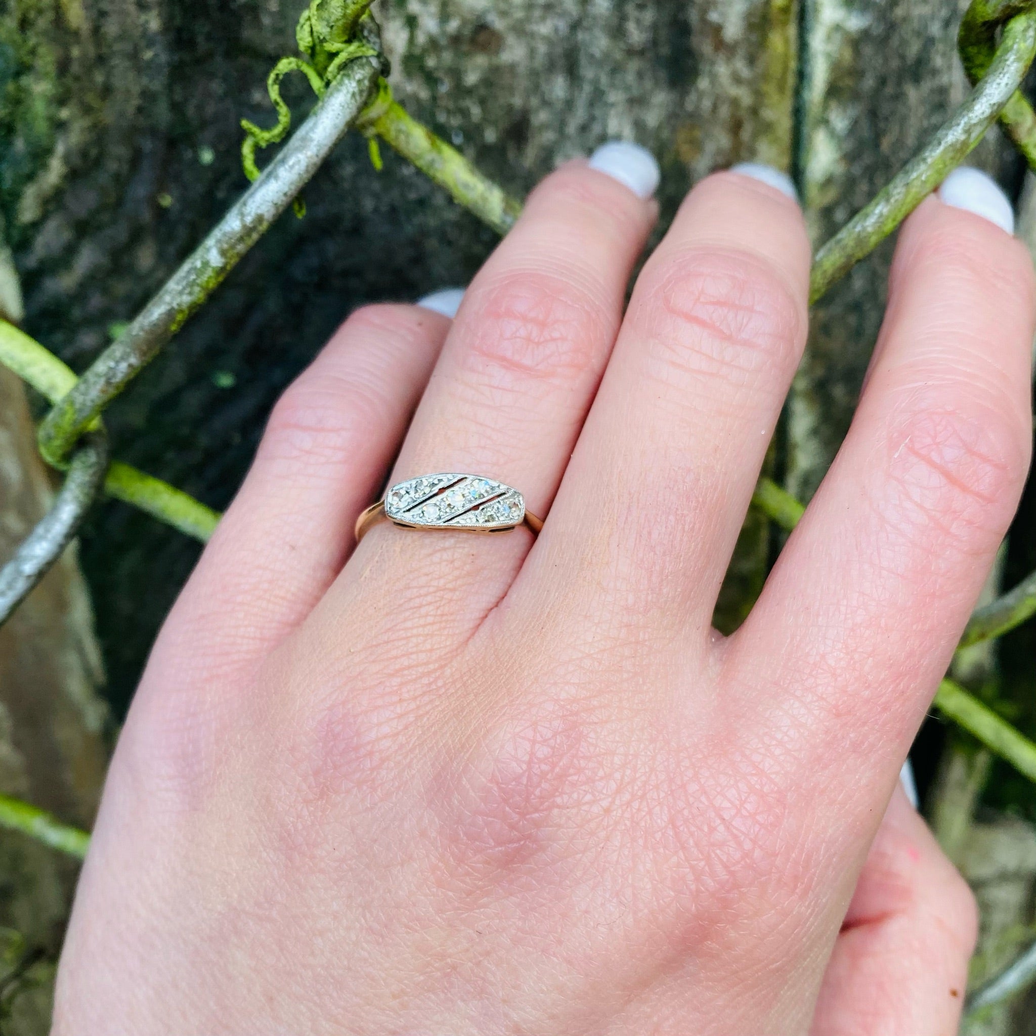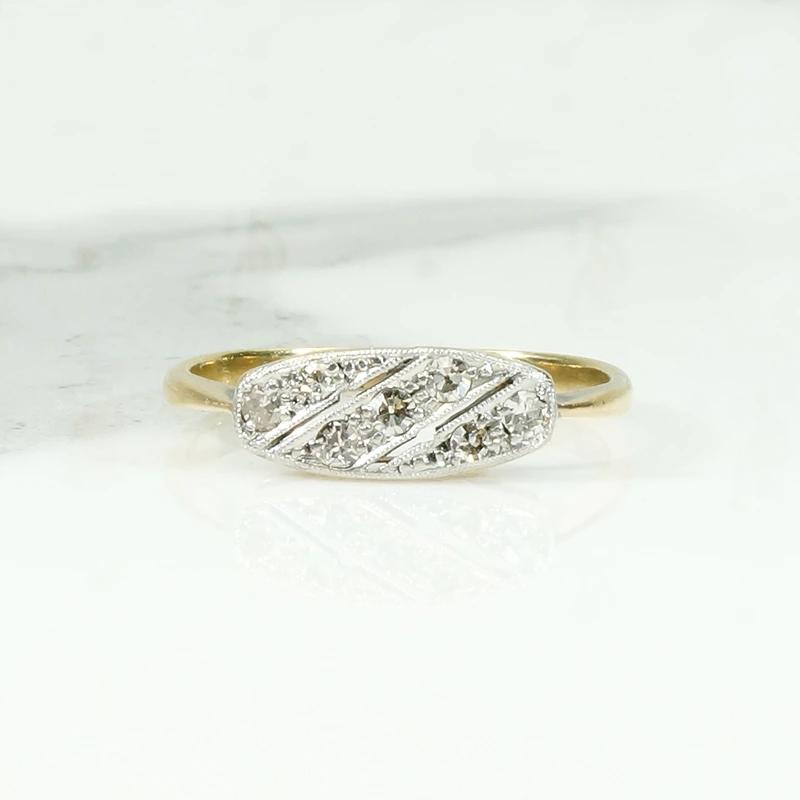 Fresh from London...our latest batch of enchanting jewels from Across the Pond. We love the luxurious Edwardian technique of layering diamond-spangled platinum over rich 18ct yellow gold. This antique diamond ring is so versatile it could serve as an engagement ring, a wedding band, or a charming anniversary band. The top of the ring is an oval platinum plaque with diagonal openwork stripes set with sparkling little diamonds. The platinum sits over a low profile 18ct yellow gold ring, with pinched shoulders and a narrow band. Stylish and sweet, this Edwardian band will put a smile on your face. Circa 1915.