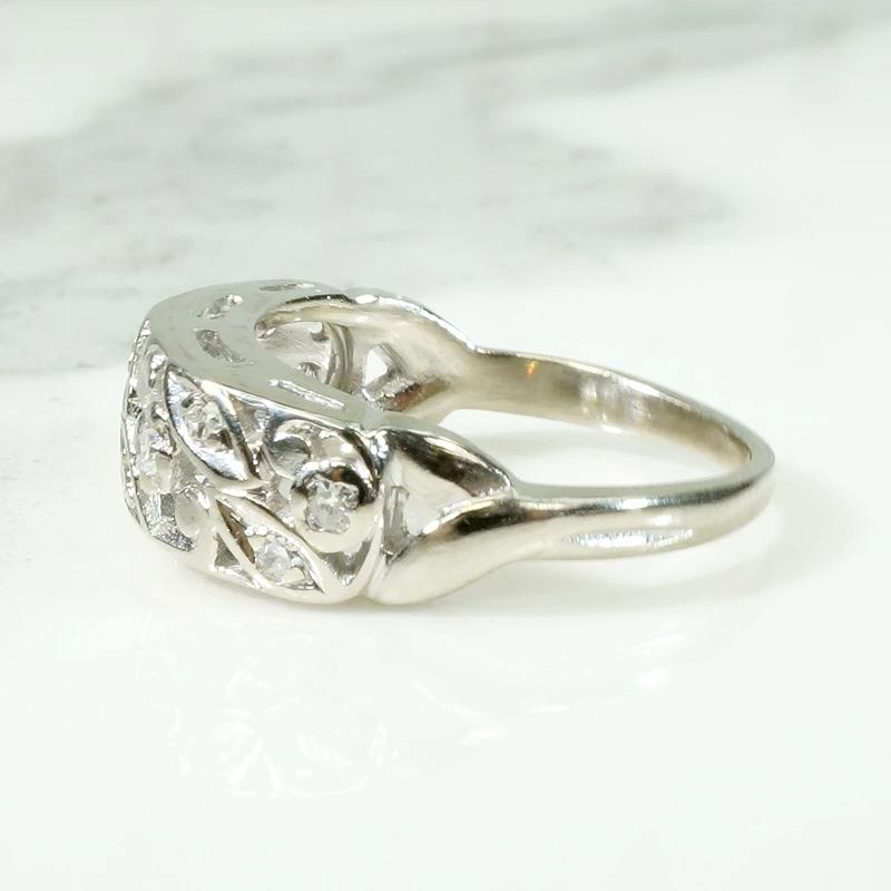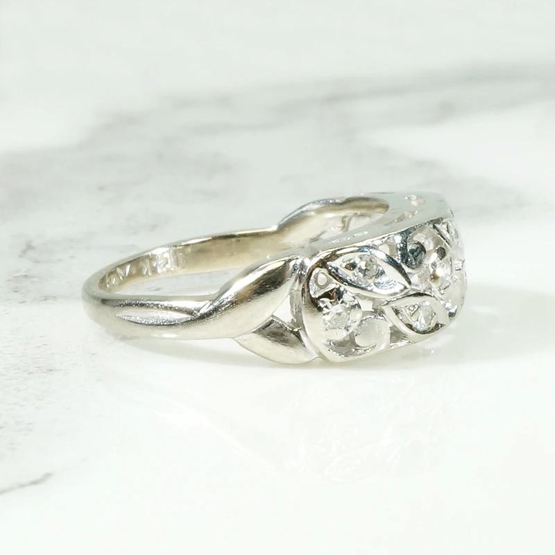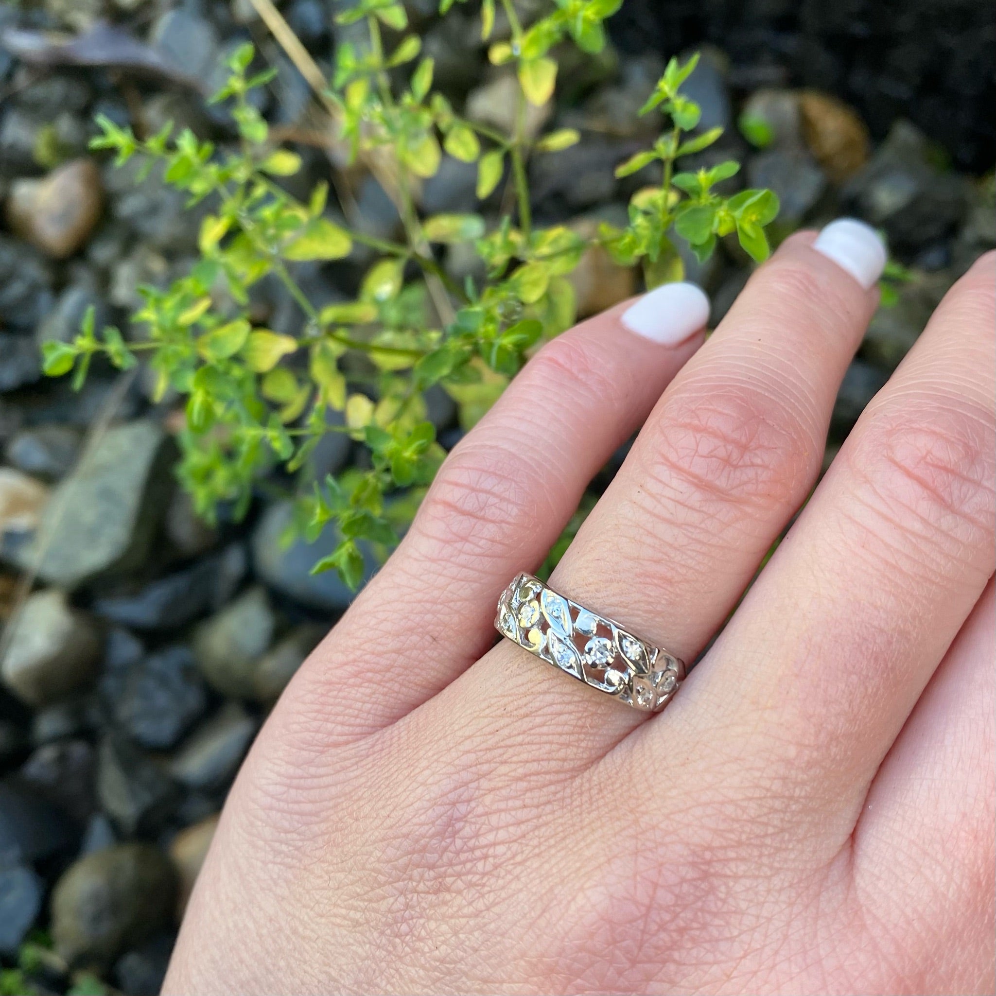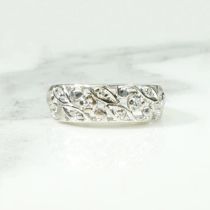 This diamond-spangled white gold wedding band has a pretty openwork pattern. A curved 14k white gold panel is pierced with a pattern of diamond set leaves, vines, and flowers. The sculpted shoulders resemble tender, twining leaves. Low profile and very wearable, this piece will make a practical and romantic wedding band. Circa 1940.