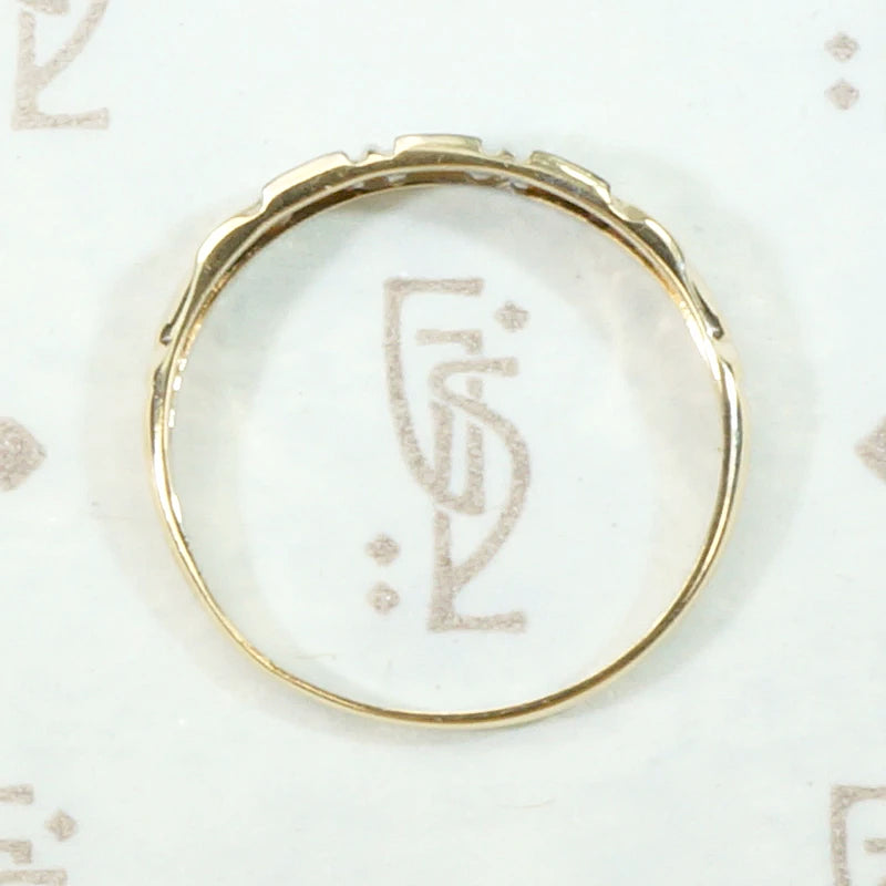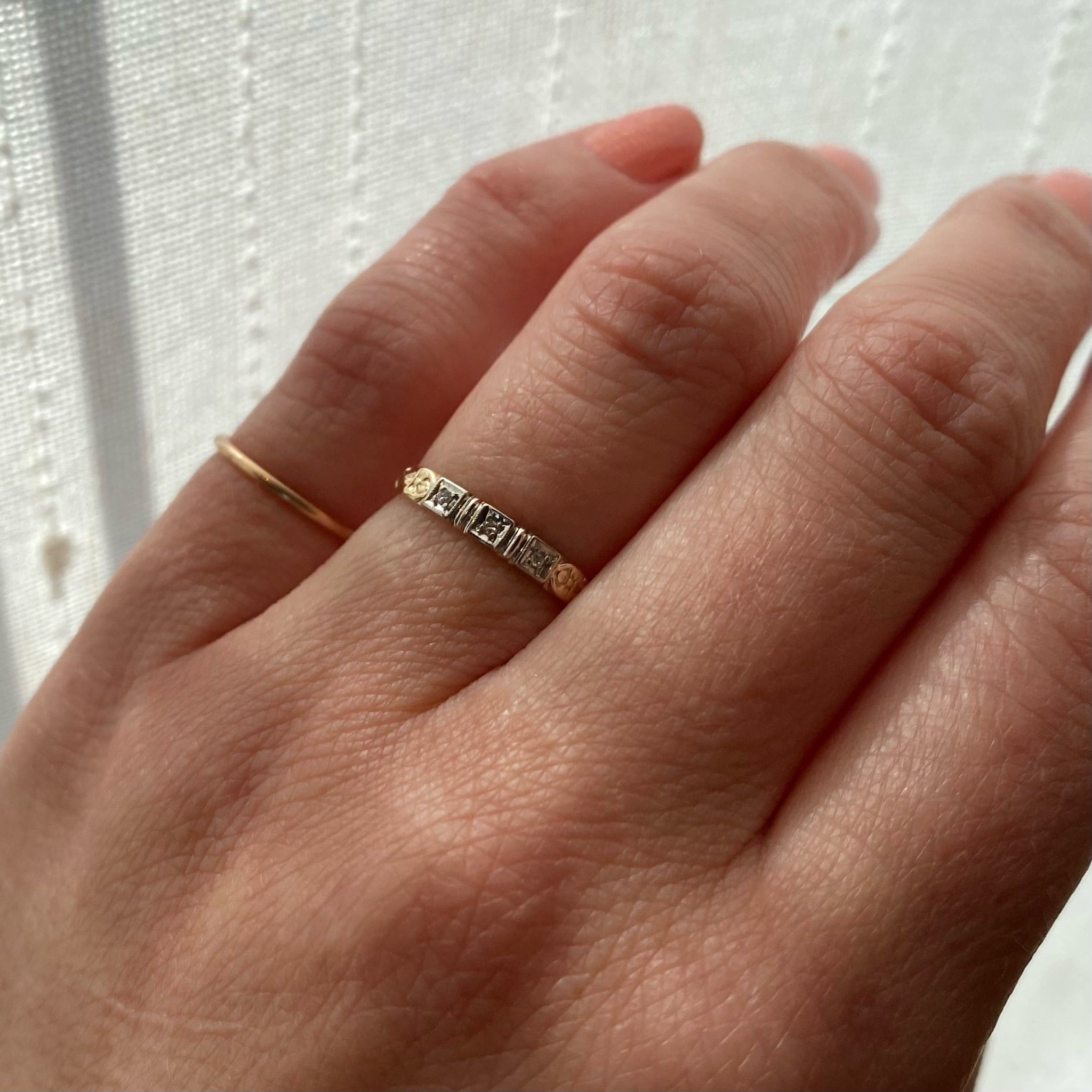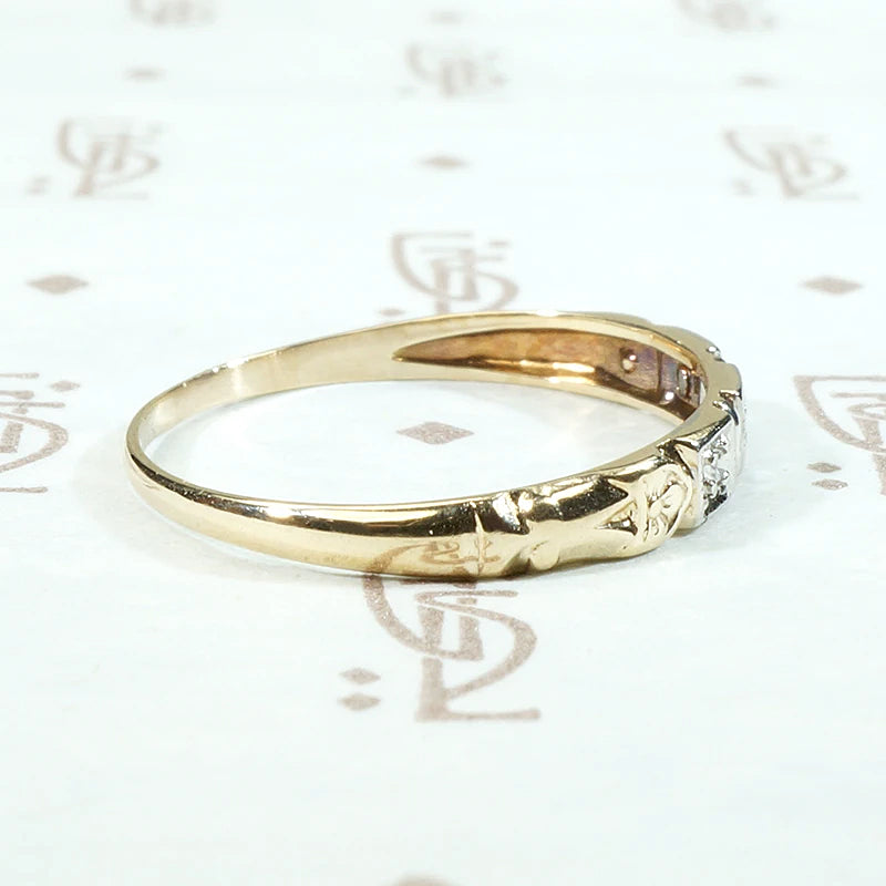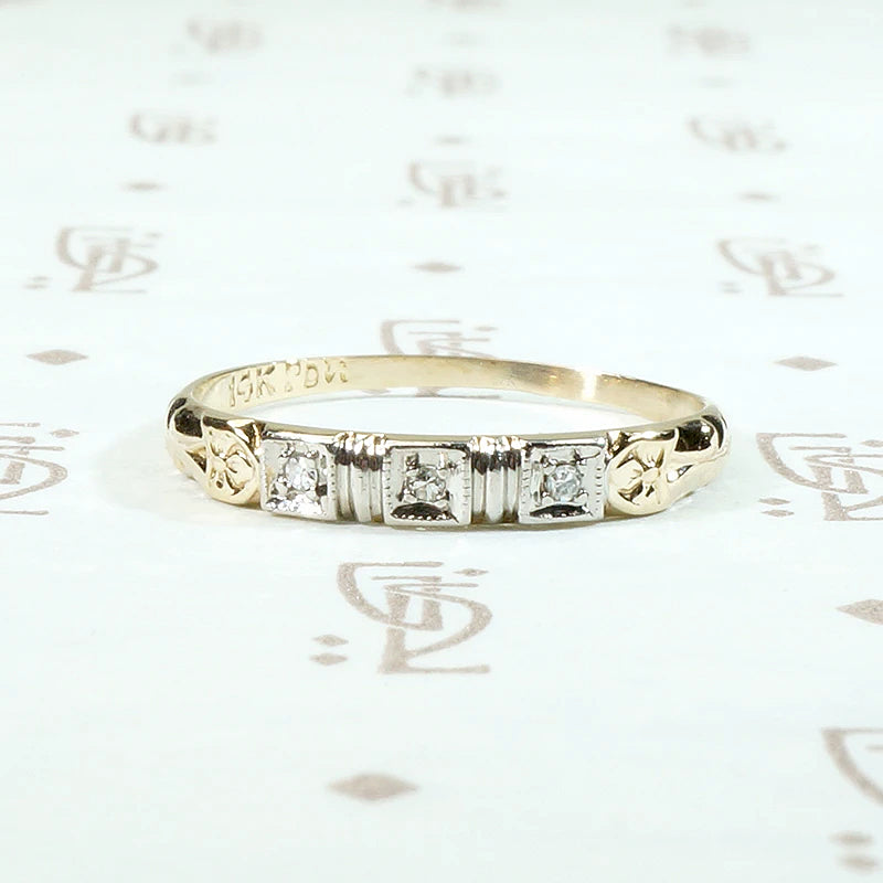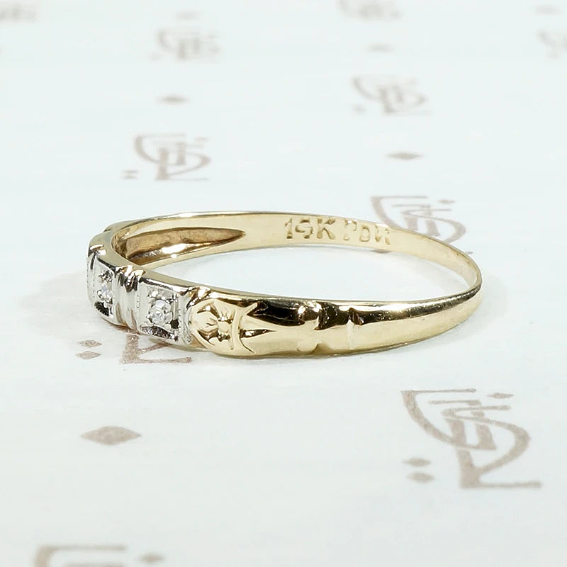 This two-tone 14k gold and diamond band has lovely vintage details. Three tiny diamonds are set in white gold boxes across the top of the band. The diamond-set white gold sits over a yellow gold band, with sculpted flowers on the shoulders and a tapered slim band. This sweet wedding band will pair prettily with your vintage engagement ring. Circa 1930.