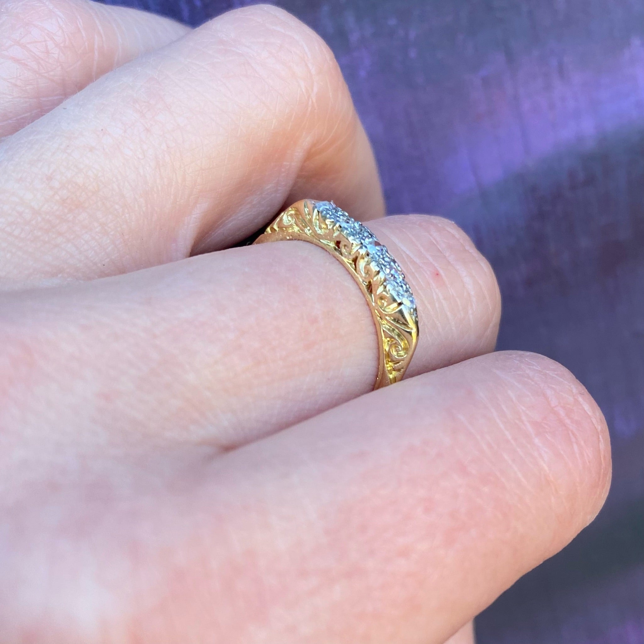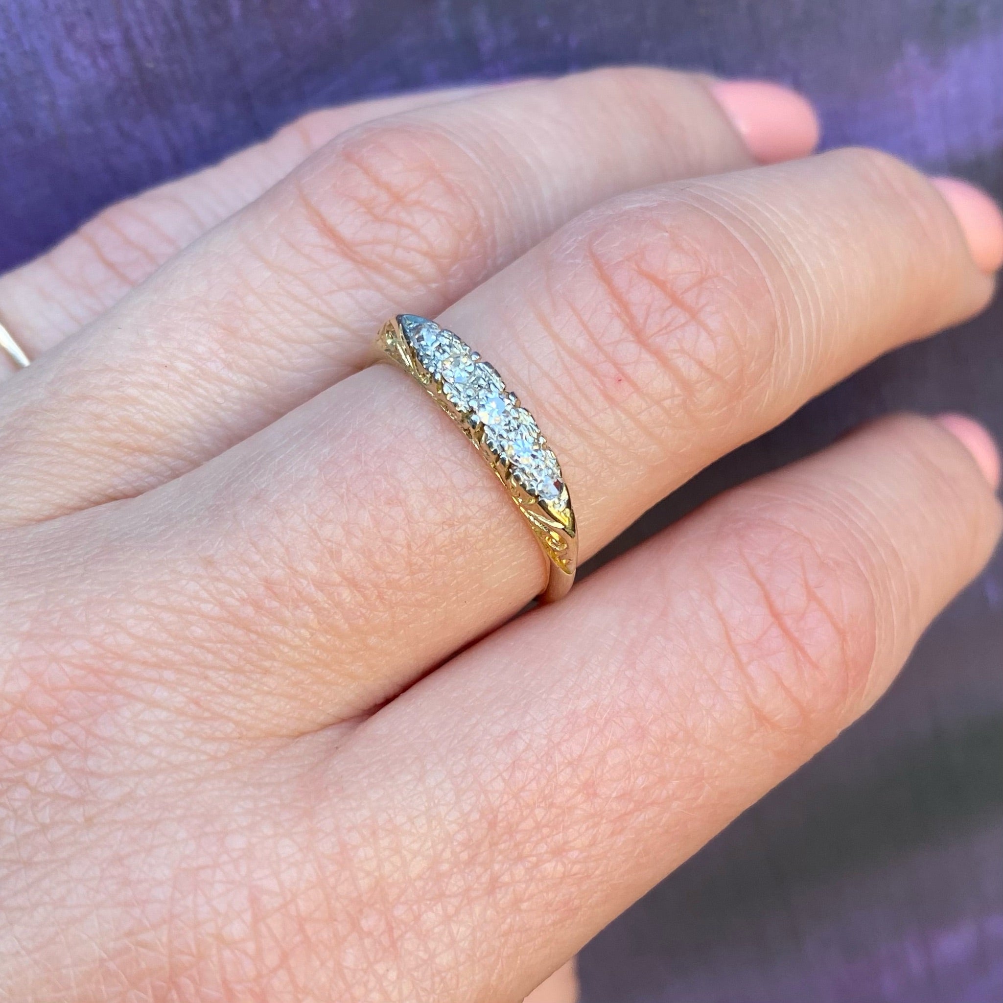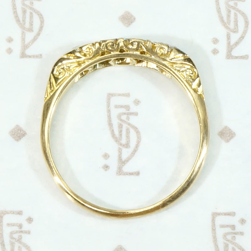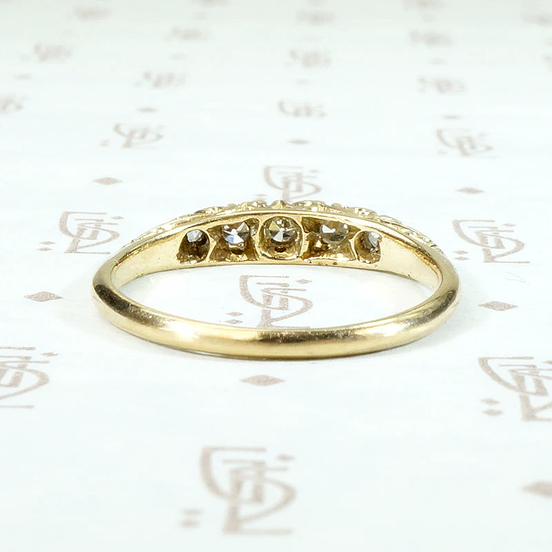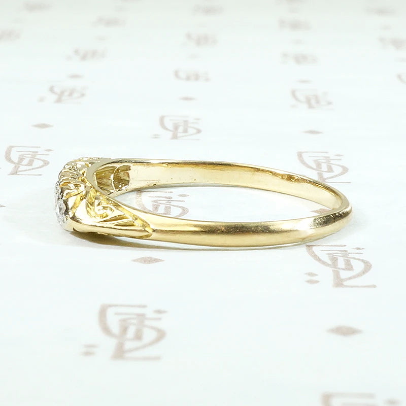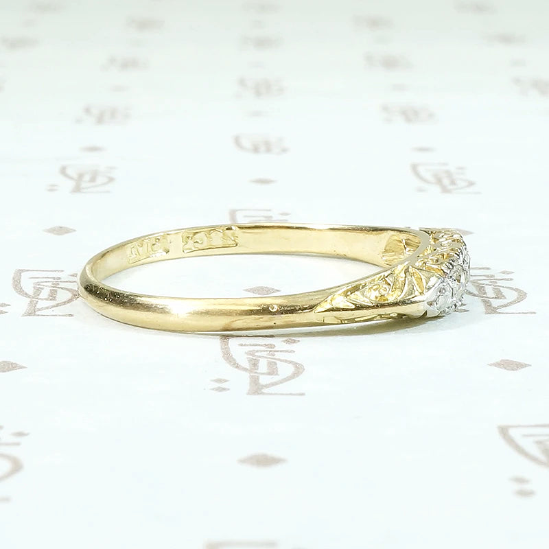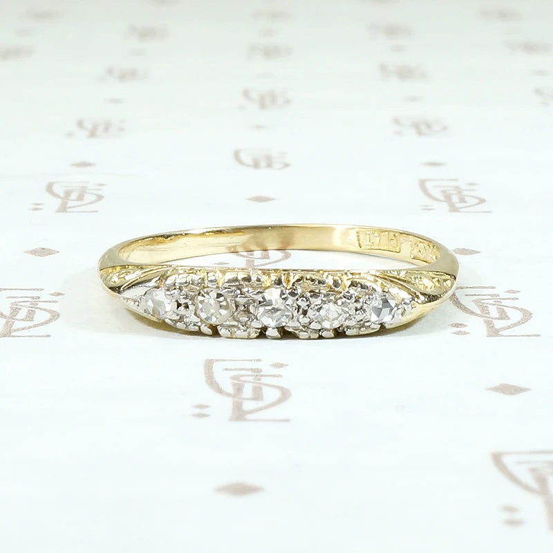 Five pretty bright diamonds are set in platinum over an 18ct yellow gold band. Three old mine and old European cut diamonds are flanked by two sweet little rose cut diamonds. The icy color of the platinum accents the sparkle of the stones. The gem set platinum sits in the rich yellow gold body of the ring, the gold is sculpted at the shoulders into romantic, feminine forms. The shoulders taper back into a slim band. This gorgeous band will pair beautifully with your vintage engagement ring, and it has the strong presence that will stand alone. Circa 1930.