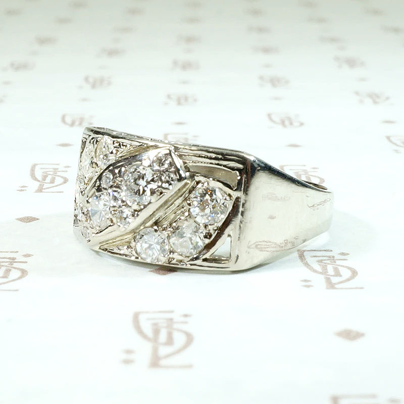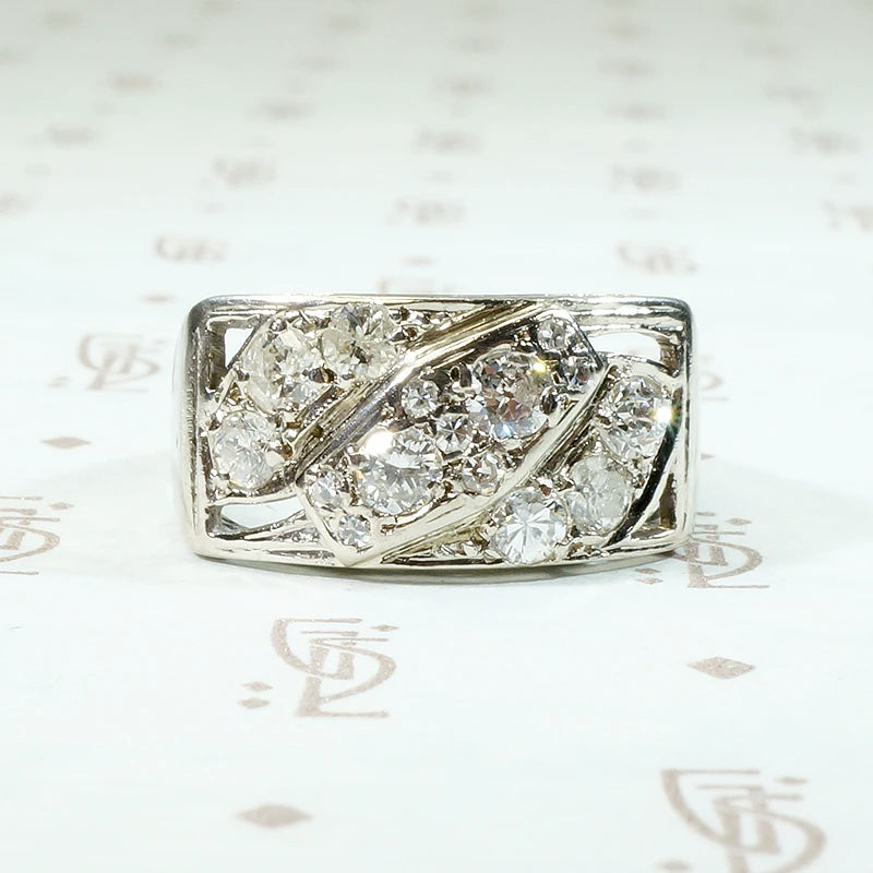 This glamorous diamond wedding band has fun Retro flair. The rectangular top of the 14k white gold openwork band is encrusted with 15 sparkling round diamonds with a 0.75 total carat weight. The two largest diamonds are set at a jaunty angle at the center of the band, with seven little accent diamonds clustered around them. Three more diamonds are set on either side of the central stones.  The wide shoulders of the ring taper smoothly back to a narrow band. Beautiful, with a practical low profile, this band will make a brilliant and unexpected wedding ring. Circa 1940.