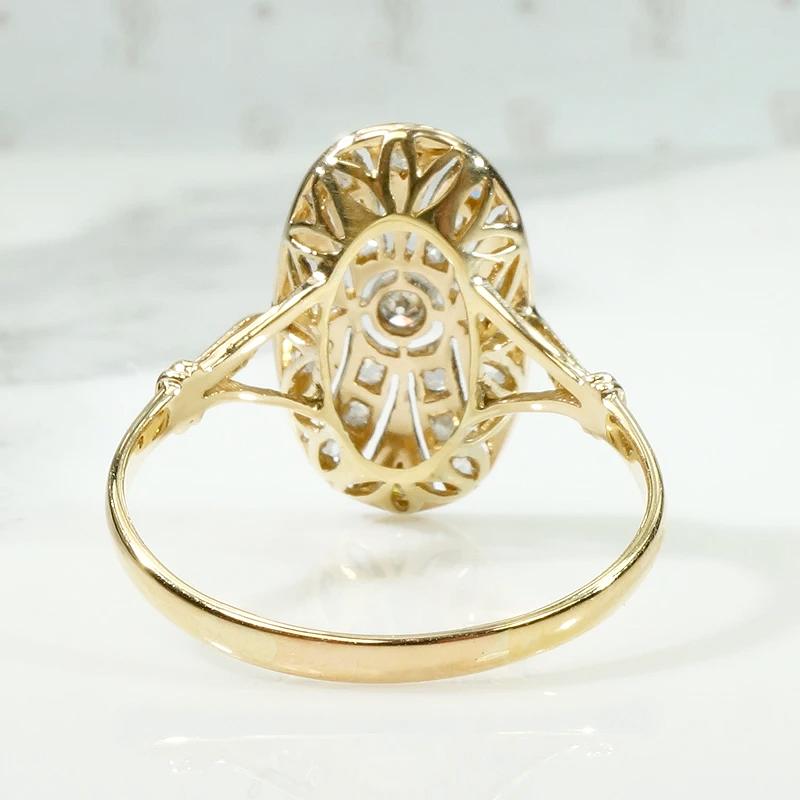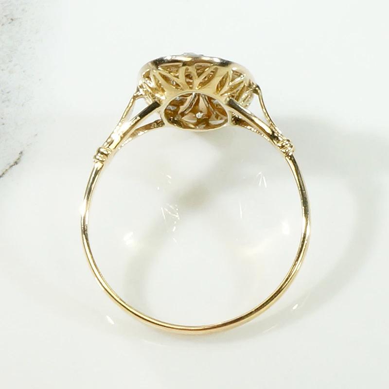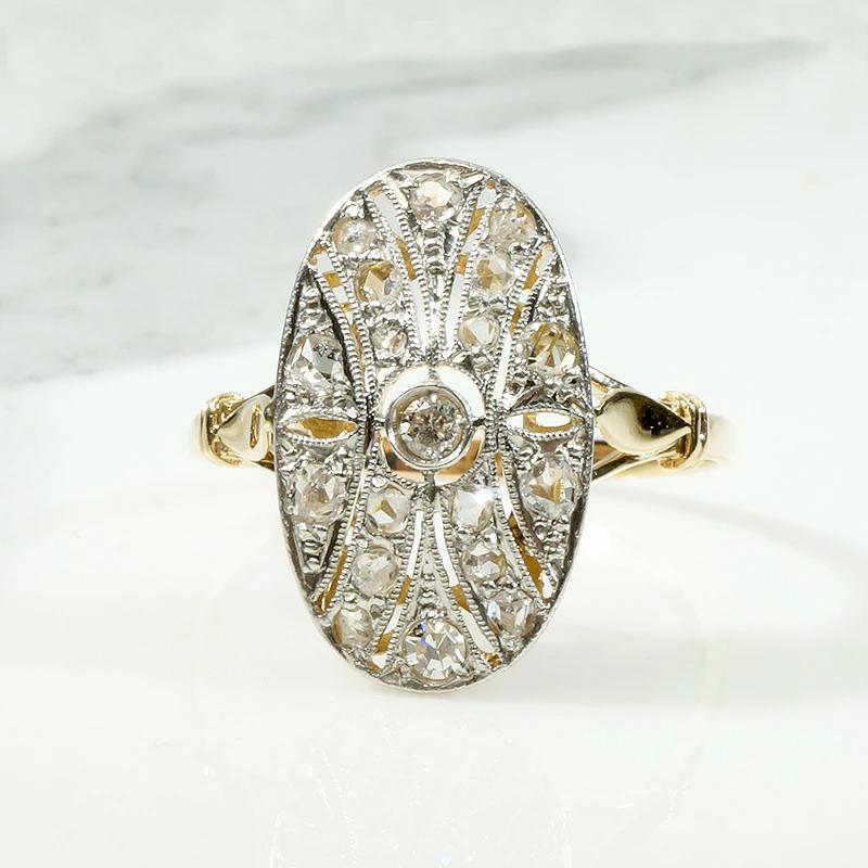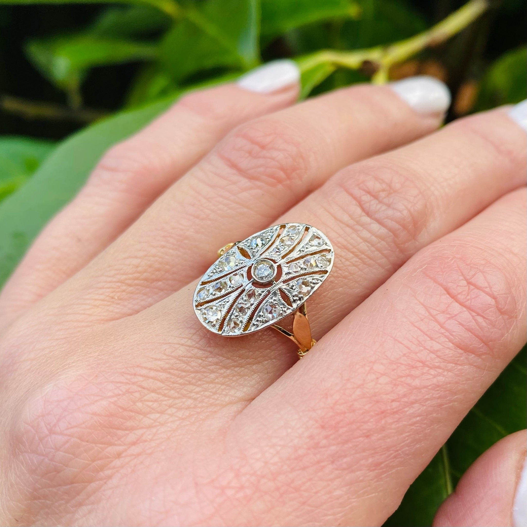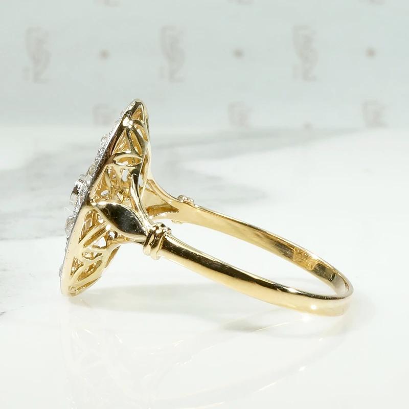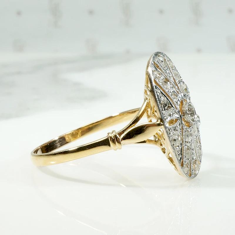 Fresh from London...our latest batch of enchanting jewels from Across the Pond. We love the luxurious Edwardian technique of layering diamond-studded platinum over rich 18ct yellow gold. This exquisite ring looks like a platinum web, spangled with diamond dew drops and shining in the sun. The top of the ring is an oval of platinum, pierced in graceful arcing lines and liberally set with glittering rose cut diamonds. A pretty little old mine cut diamond is bezel set at the ring's center. Fine milgrain and beaded details elevate the metal work. The platinum top is set above the 18ct yellow gold body of the ring, with split and sculpted cathedral shoulders and a lovely openwork gallery. This classically Edwardian ring is beautiful from every angle. Circa 1900.
