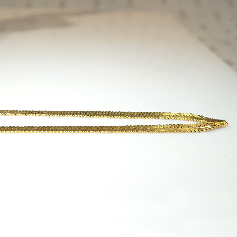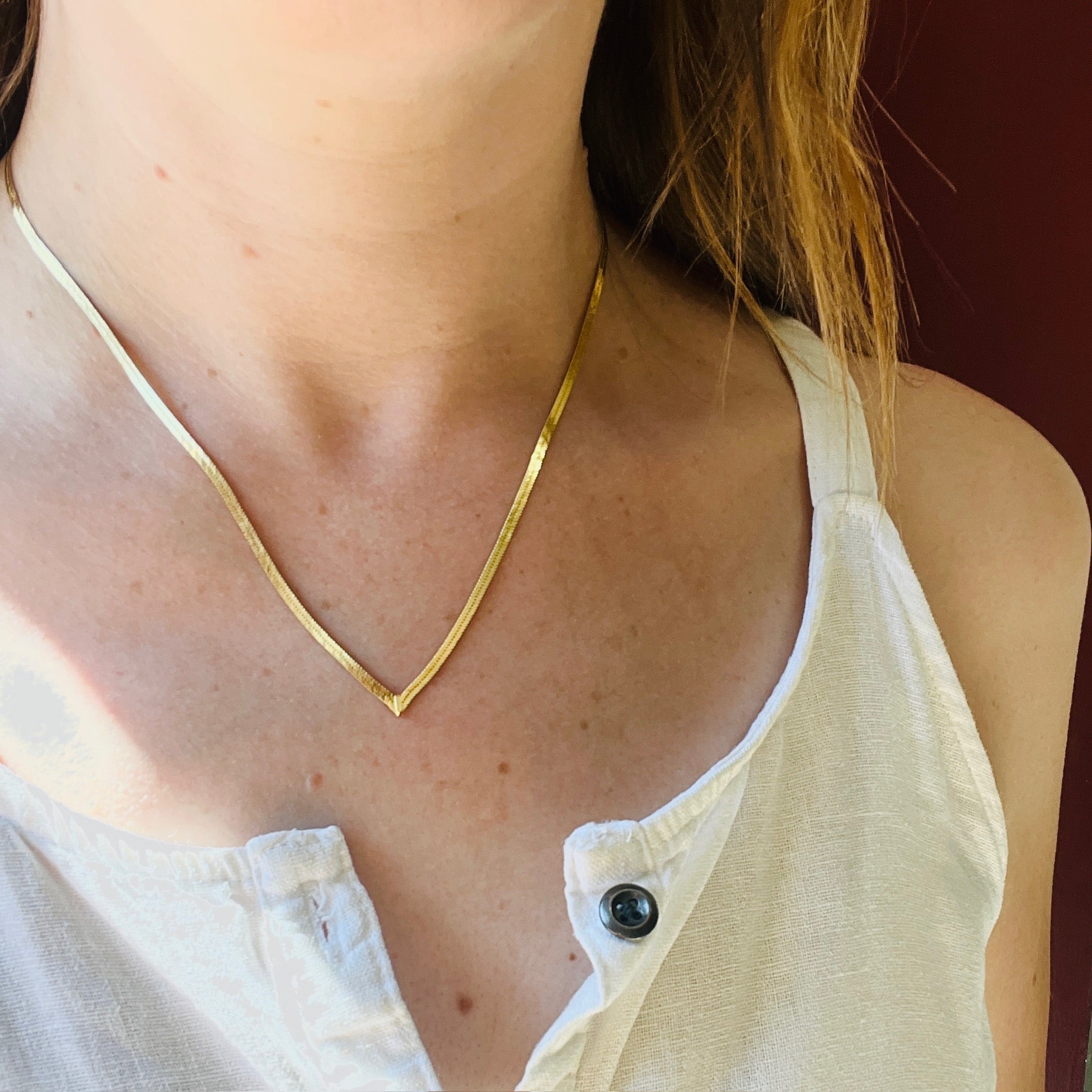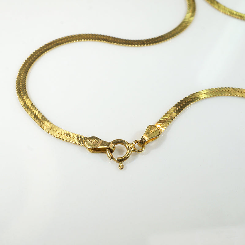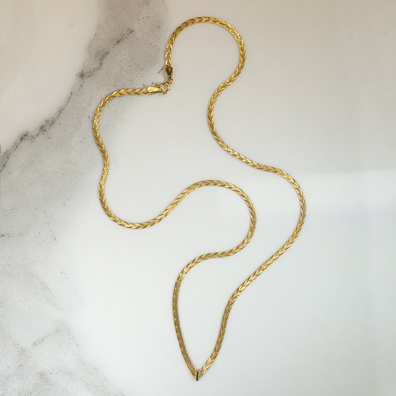 Molto alla moda. This Italian 14k gold herringbone chain is so disco. The flat woven chain comes to a "V" on the breastbone. One side of the chain is engraved with a glittering texture while the other is highly polished. The spring ring clasp is marked "14k" and "Italy." Wear this chic chain with your vintage Diane von Fürstenberg wrap dress. Circa 1970.