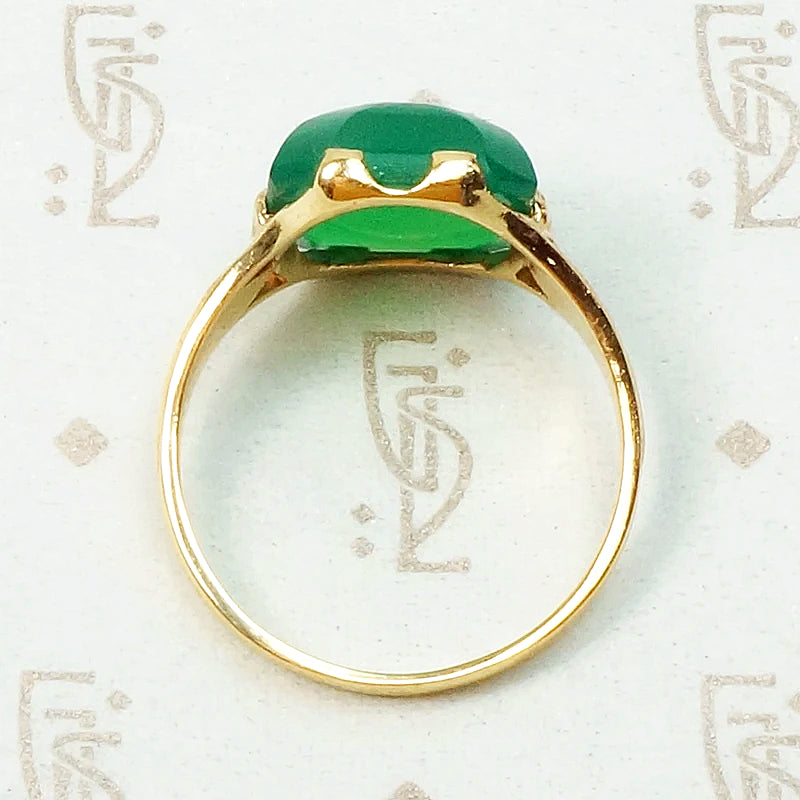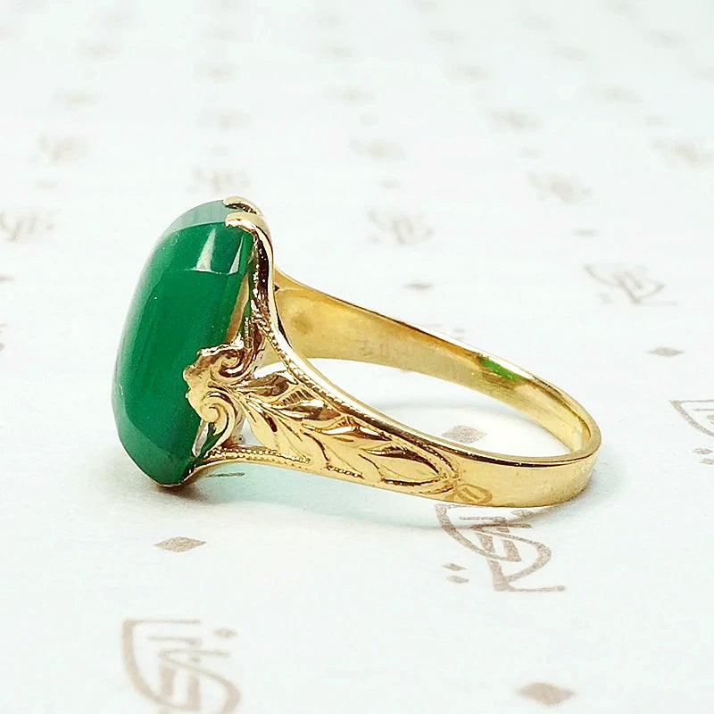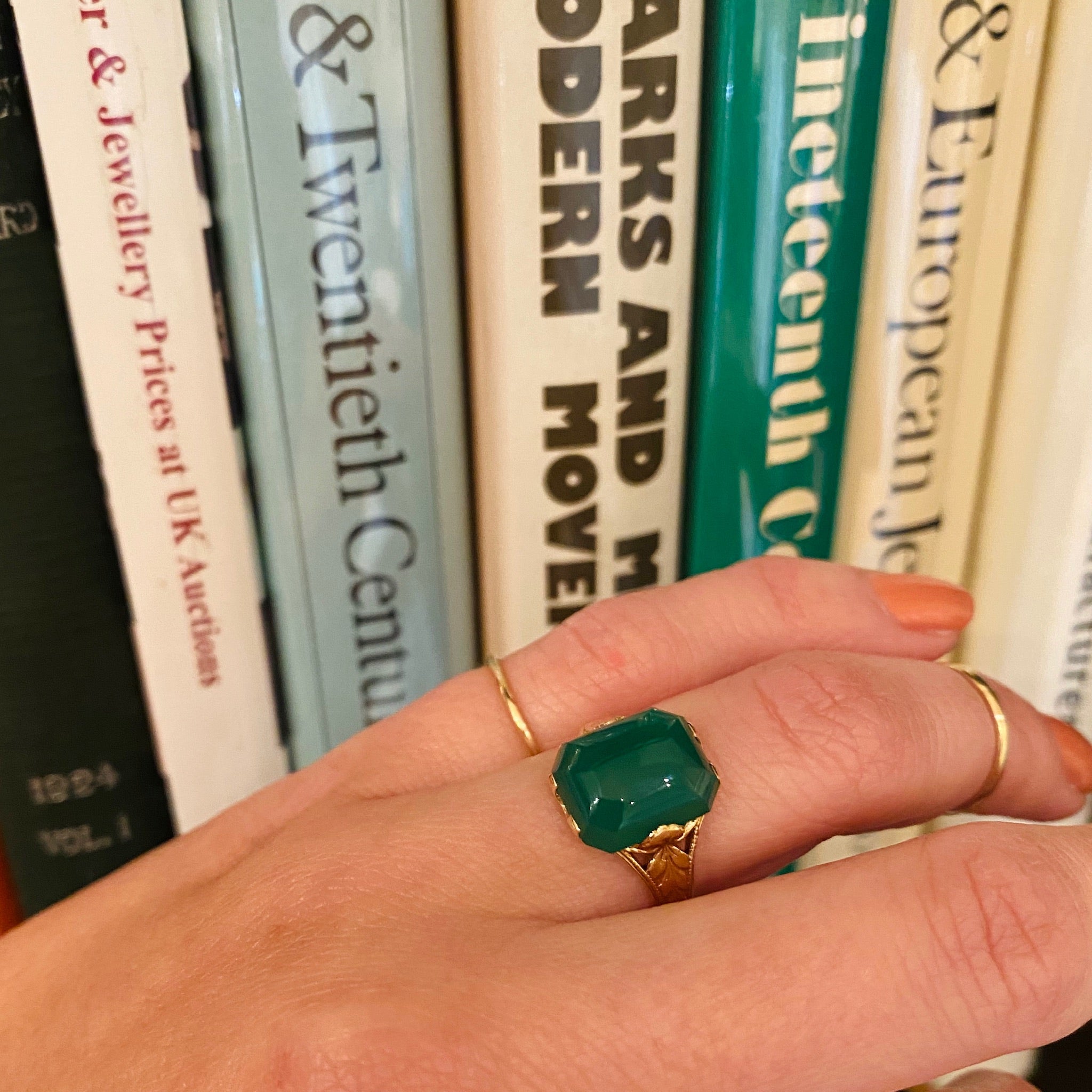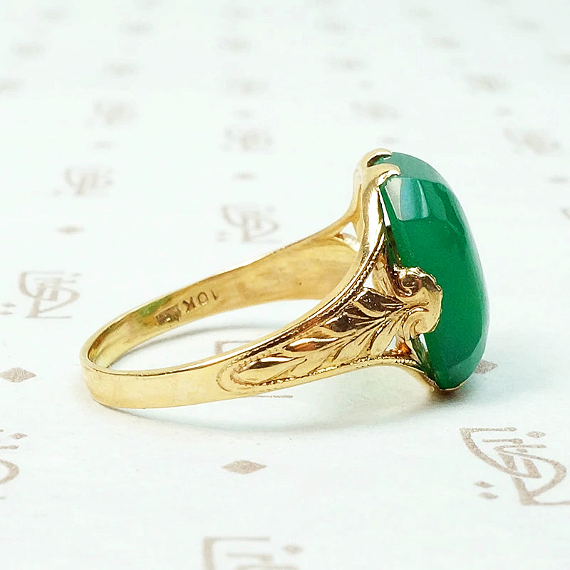 A divine slab of parakeet green agate is ensconced in an exquisitely engraved gold setting. The glossy agate is beveled and faceted into an elongated octagon. The stone is tab set in 10k yellow gold; the tapered shoulders are engraved with gracefully scrolled leaves. The interior of the band is marked with 10k and the tiny image of a building. This shade of green is the Art Deco era's favorite color. Circa 1930.