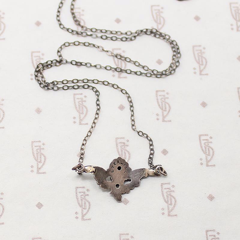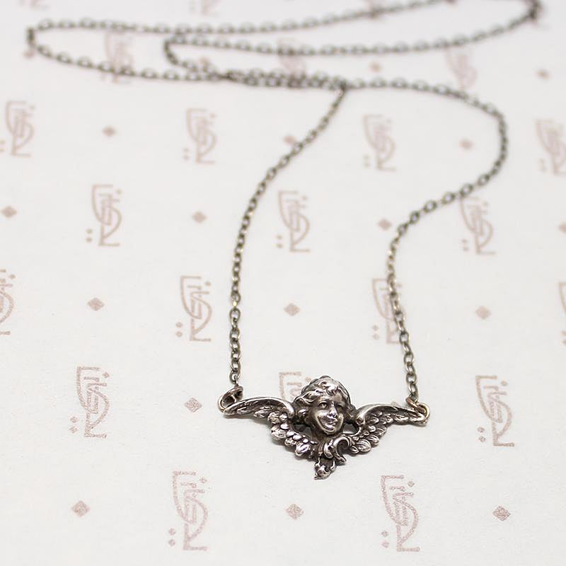 The sweetest little Edwardian angel, the seraphic face framed by delicate wings. This three-dimensional sterling silver angel face hangs from a modern sterling silver chain. A divine antique necklace that will steal your heart. Circa 1900.