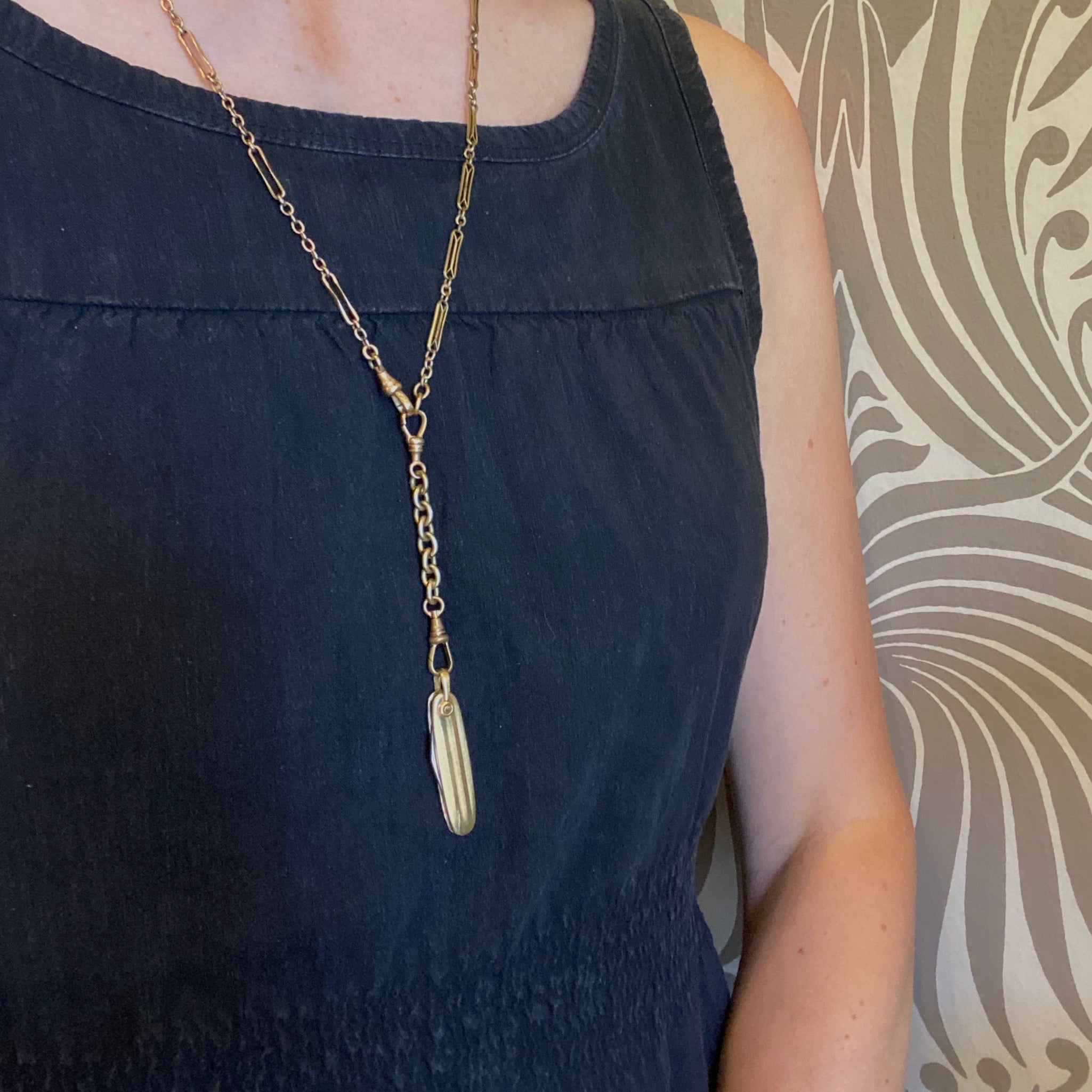 So fun and so versatile, this double dog clip charm holder will raise your chain game. Use this gold filled charm holder to add length, color and texture to your favorite chains. Use it to hang all your pendants, lockets, fobs and bobs from any necklace. Use it for things we haven't even thought of yet, the uses are only limited by your imagination! A stationary dog clip and a swiveling dog clip hook are connected by a length gold filled links. All of the bits and pieces are repurposed and recycled.
