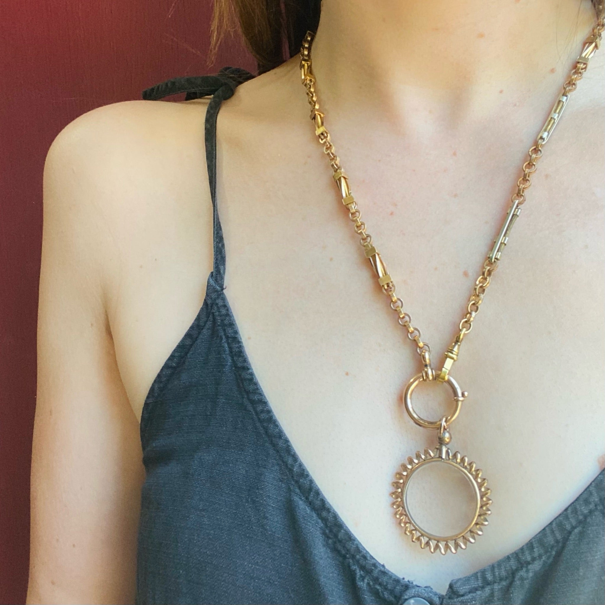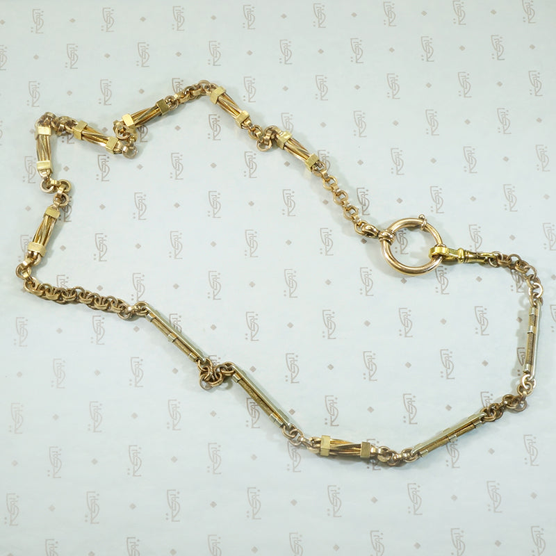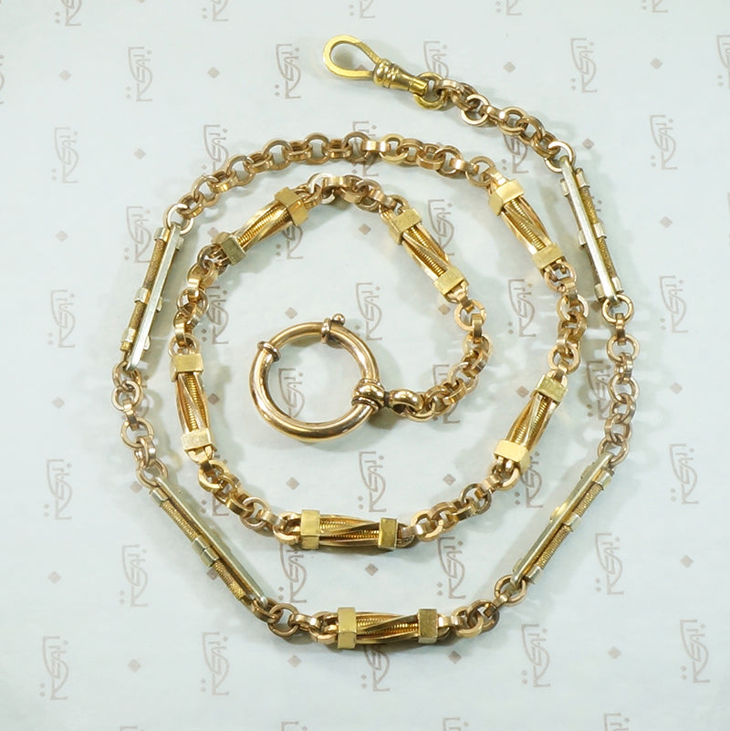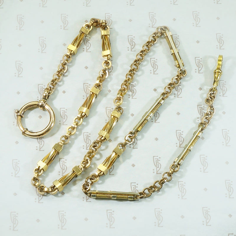 The complimentary links on this pair of married chains are detailed and so fantastic they required only a good sturdy swivel hook on one end and on the other a nice big bolt ring. The bolt ring will hold several bits, bobs, charms and fobs. The chains are gold filled circa 1870 and the gold filled findings date from circa 1890.